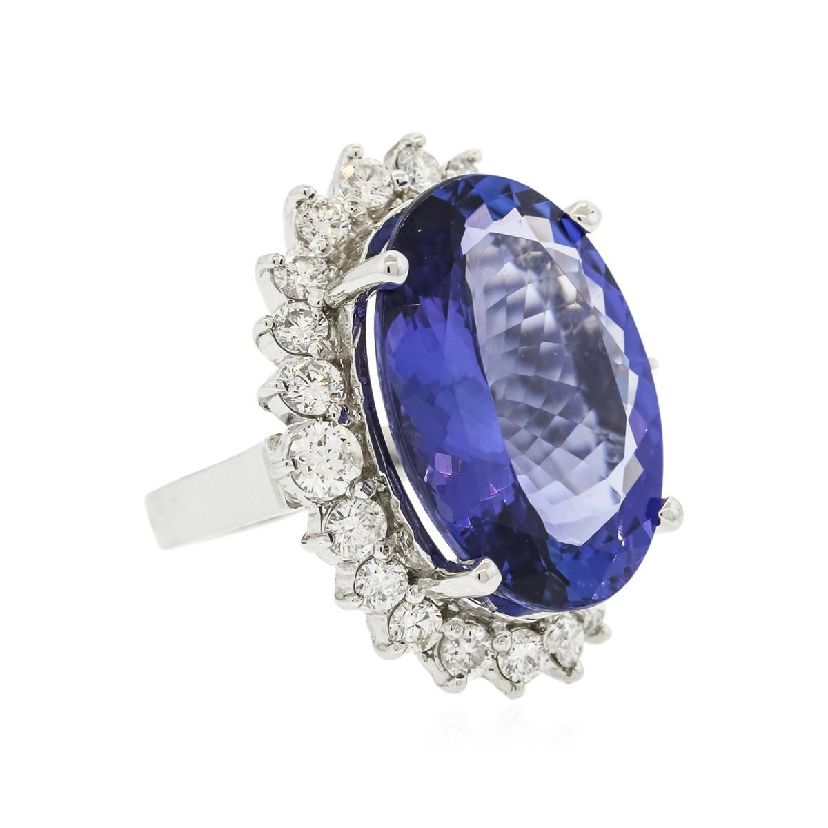 One electronically tested 14KT white gold ladies combination cast & assembled prong set ring with a flat shank with a bright polish finish. Identified with markings of "K14". Condition is new. Containing: One prong set oval modified brilliant cut natural tanzanite, measuring 23.23 x 16.85 x 8.90mm, exact weight 23.77ct., clarity is eye clean, type I, medium light, very slightly grayish, violet color, (GIA V 4/3), cut is very good. Graded loose prior to setting by GIA Gemological Laboratory. GIA Report #1166453354. Two prong set round brilliant cut diamonds, measuring 3.80 - 3.80 x 2.28mm (depth est.) approximate total weight of 2 Stones = 0.40ct. Clarity: SI-2 to I-1. Color: G, Cut is Very Good. Twenty prong set round brilliant cut diamonds, measuring 3.00 - 2.80 x 1.74mm (depth est.) approximate total weight of 20 Stones = 1.78ct. Clarity: SI-1 to SI-2. Color: G - I, Cut is Good. Colored gemstones are presumed to have been subjected to commonly used enhancement processes. All diamonds and colored gemstones are graded in the mounting, unless otherwise stated. Total Weight of Colored Stones 23.77ct. Total Weight of Diamonds 2.19ct. Total Weight of Ring 15.90 grams. GGL Appraised at $51,715.00.