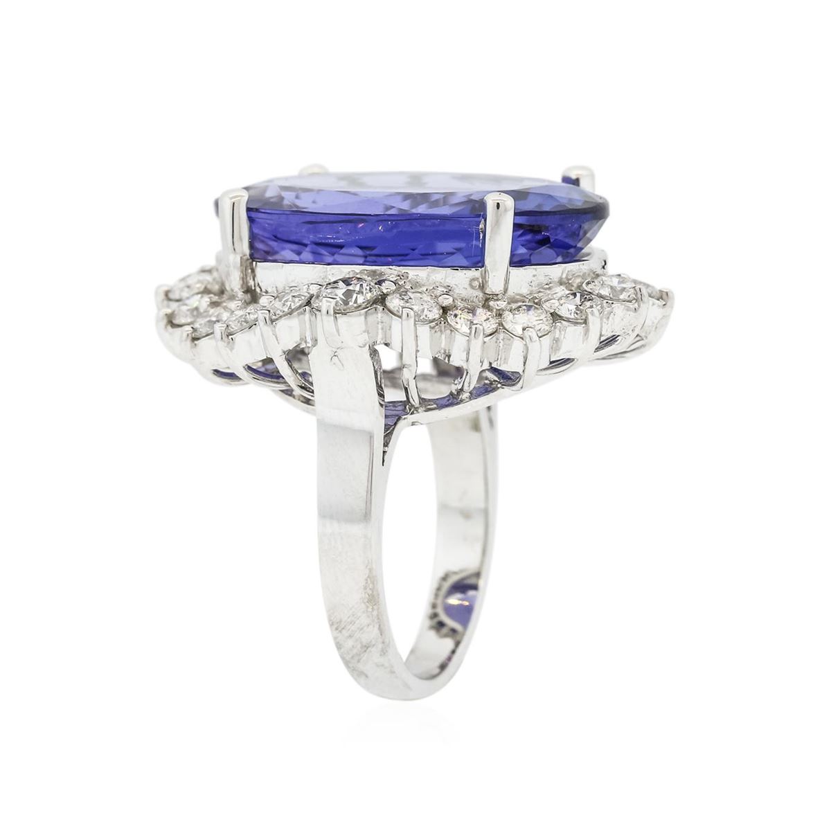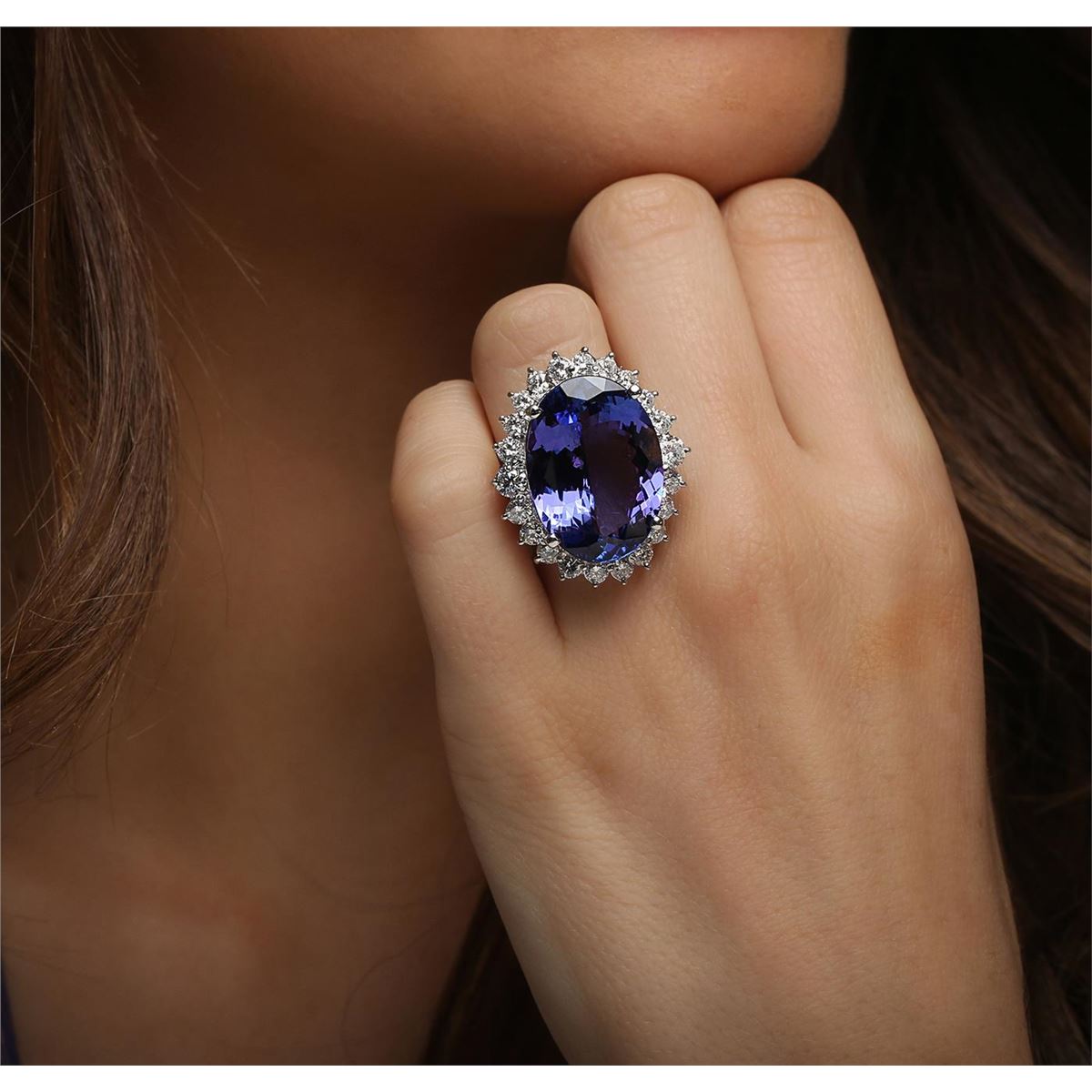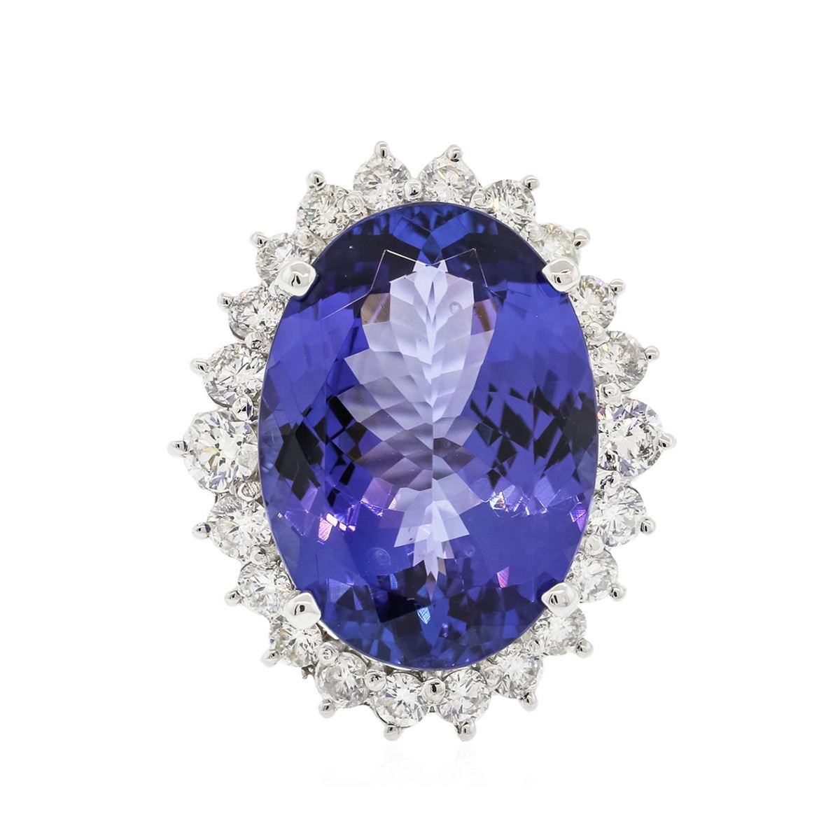 One electronically tested 14KT white gold ladies combination cast & assembled prong set ring with a flat shank with a bright polish finish. Identified with markings of "K14". Condition is new. Containing: One prong set oval modified brilliant cut natural tanzanite, measuring 23.23 x 16.85 x 8.90mm, exact weight 23.77ct., clarity is eye clean, type I, medium light, very slightly grayish, violet color, (GIA V 4/3), cut is very good. Graded loose prior to setting by GIA Gemological Laboratory. GIA Report #1166453354. Two prong set round brilliant cut diamonds, measuring 3.80 - 3.80 x 2.28mm (depth est.) approximate total weight of 2 Stones = 0.40ct. Clarity: SI-2 to I-1. Color: G, Cut is Very Good. Twenty prong set round brilliant cut diamonds, measuring 3.00 - 2.80 x 1.74mm (depth est.) approximate total weight of 20 Stones = 1.78ct. Clarity: SI-1 to SI-2. Color: G - I, Cut is Good. Colored gemstones are presumed to have been subjected to commonly used enhancement processes. All diamonds and colored gemstones are graded in the mounting, unless otherwise stated. Total Weight of Colored Stones 23.77ct. Total Weight of Diamonds 2.19ct. Total Weight of Ring 15.90 grams. GGL Appraised at $51,715.00.
