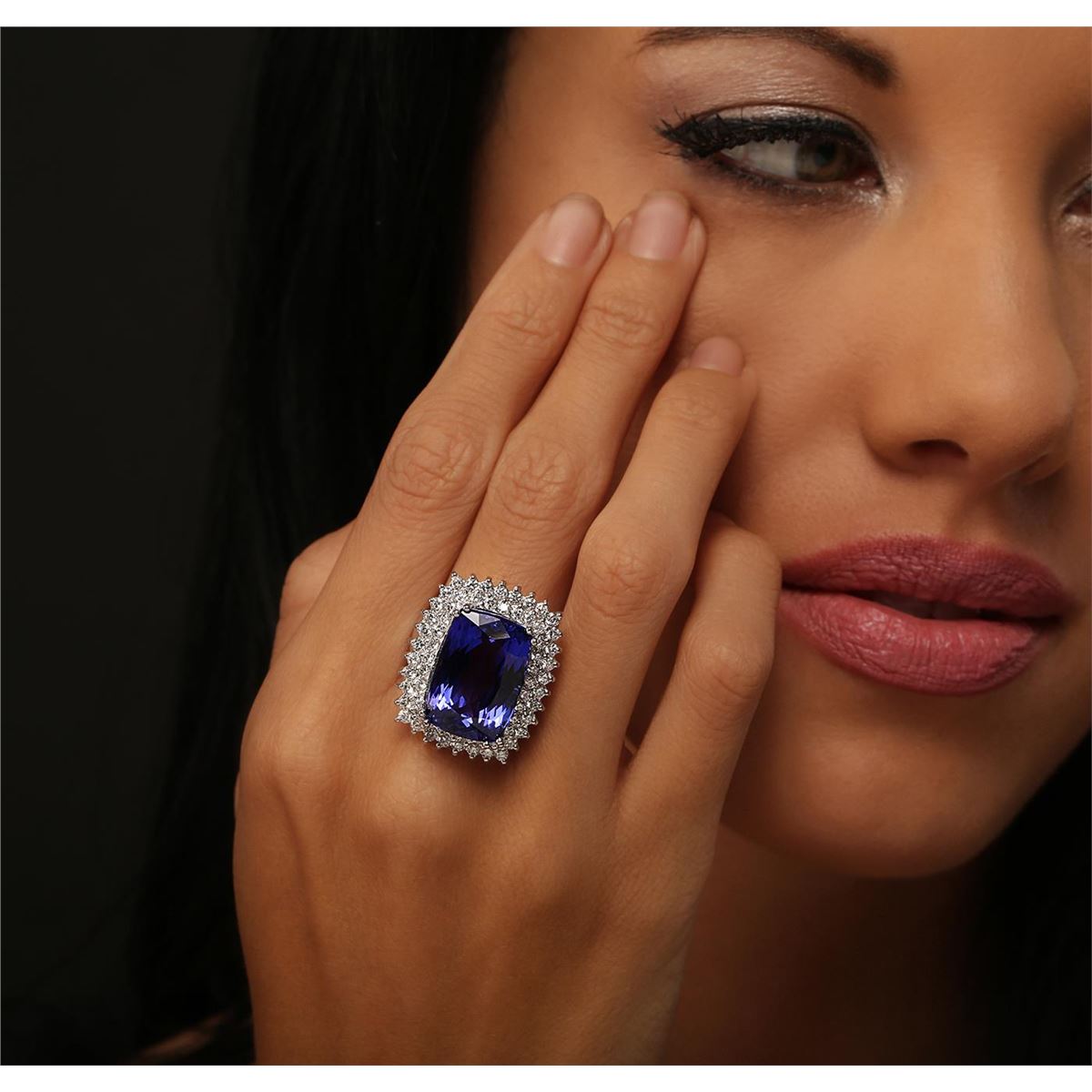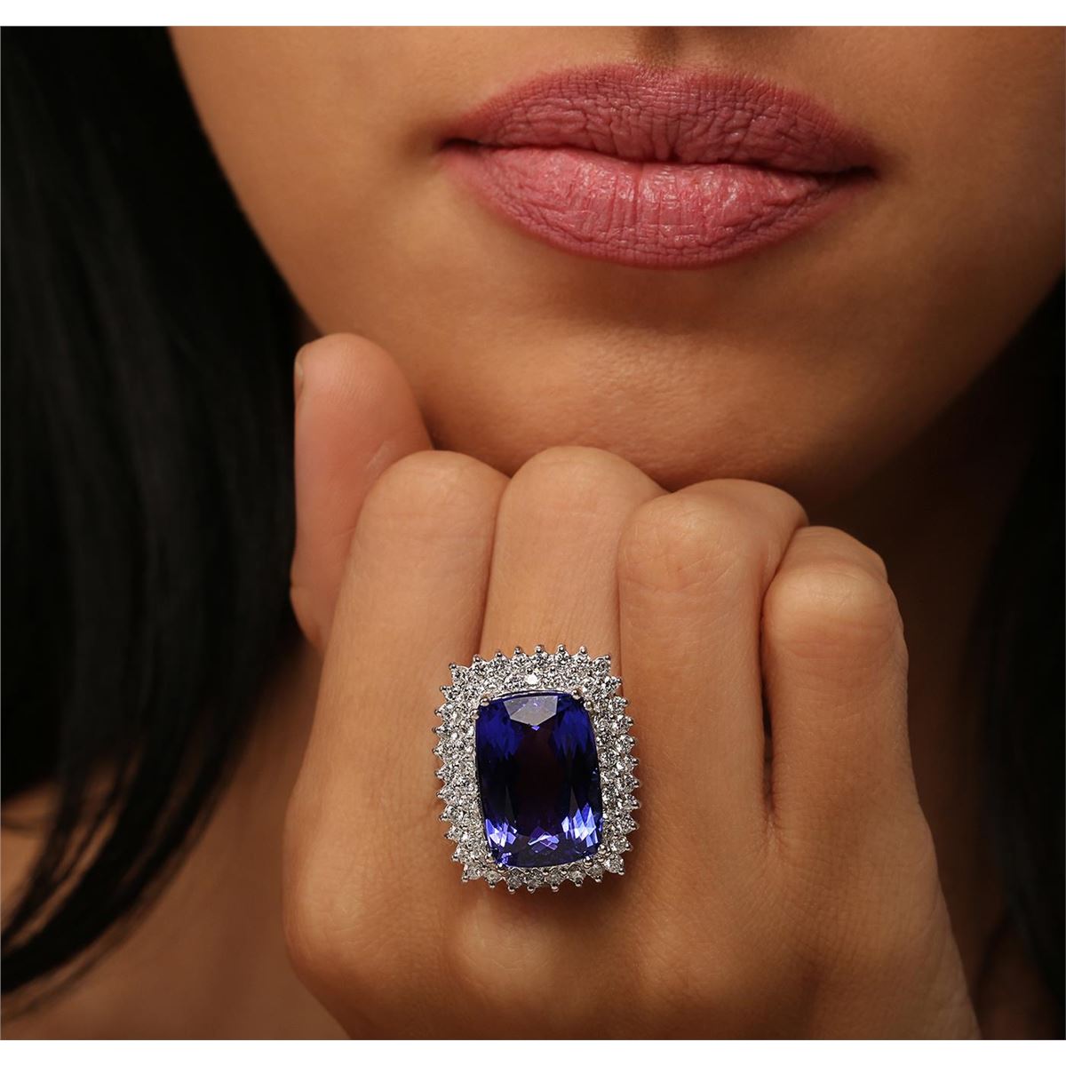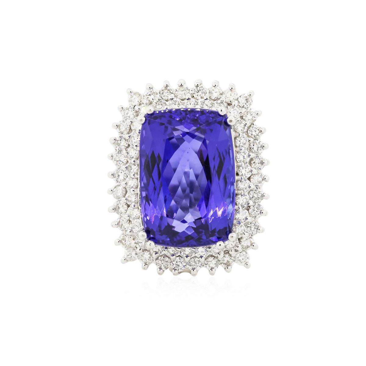 One electronically tested 14KT white gold ladies cast tanzanite and diamond ring with a bright polish finish. Condition is new, good workmanship. The featured tanzanite is set within a two tiered diamond lattice gallery, completed by a four millimeter wide band. Identified with markings of "K14". Containing: One prong set rectangular cushion modified brilliant cut natural tanzanite, measuring 18.40 x 12.55 x 10.48mm, exact weight 24.17ct., type I Clarity is eye clean, medium dark, moderately strong, Blue-Violet color, (GIA BV 6/4), cut is good. Transmitting light with no distortion, transparent. GIA Gemological Report attached. Graded loose prior to setting in the GIA Laboratory, Report # 6167077832.Tanzanite is a very rare gemstone that is only found in the country of Tanzania. Originally discovered in 1967. Tiffany & Company, named the stone Tanzanite. It is found in the Usumburu Mountains that border the Umba Valley of northern Tanzania. Tanzanite occurs in gray, brown, violet, blue, reddish-purple, & green. The gem is interesting because of its exceptional pleochroism. Rotated in different directions a tanzanite will exhibit multiple changes of color. Tanzanite has a low tolerance to ultrasonic cleaning, and should not be cleaned using this method. Sixty-Five prong set round brilliant cut diamonds, measuring 1.90 - 1.80 x 1.11mm (depth est.) approximate total weight of 65 Stones = 1.60ct. Graded in the setting. Clarity: SI-2 to I-1 . Color: F - H. Total Weight of Colored Stones 24.17ct. Total Weight of Diamonds 1.60ct. Total Weight of Ring 19.70 grams. AIG Appraised at $73,615.00.