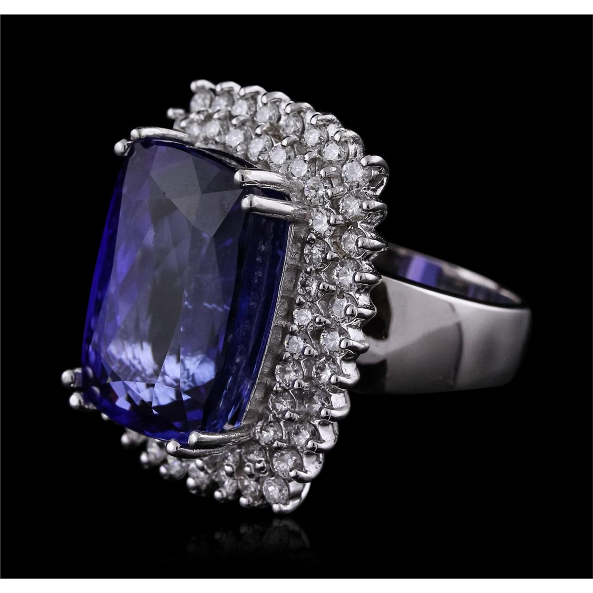 One electronically tested 14KT white gold ladies cast tanzanite and diamond ring with a bright polish finish. Condition is new, good workmanship. The featured tanzanite is set within a two tiered diamond lattice gallery, completed by a four millimeter wide band. Identified with markings of "K14". Containing: One prong set rectangular cushion modified brilliant cut natural tanzanite, measuring 18.40 x 12.55 x 10.48mm, exact weight 24.17ct., type I Clarity is eye clean, medium dark, moderately strong, Blue-Violet color, (GIA BV 6/4), cut is good. Transmitting light with no distortion, transparent. GIA Gemological Report attached. Graded loose prior to setting in the GIA Laboratory, Report # 6167077832.Tanzanite is a very rare gemstone that is only found in the country of Tanzania. Originally discovered in 1967. Tiffany & Company, named the stone Tanzanite. It is found in the Usumburu Mountains that border the Umba Valley of northern Tanzania. Tanzanite occurs in gray, brown, violet, blue, reddish-purple, & green. The gem is interesting because of its exceptional pleochroism. Rotated in different directions a tanzanite will exhibit multiple changes of color. Tanzanite has a low tolerance to ultrasonic cleaning, and should not be cleaned using this method. Sixty-Five prong set round brilliant cut diamonds, measuring 1.90 - 1.80 x 1.11mm (depth est.) approximate total weight of 65 Stones = 1.60ct. Graded in the setting. Clarity: SI-2 to I-1 . Color: F - H. Total Weight of Colored Stones 24.17ct. Total Weight of Diamonds 1.60ct. Total Weight of Ring 19.70 grams. AIGAppraised at $73,615.00.