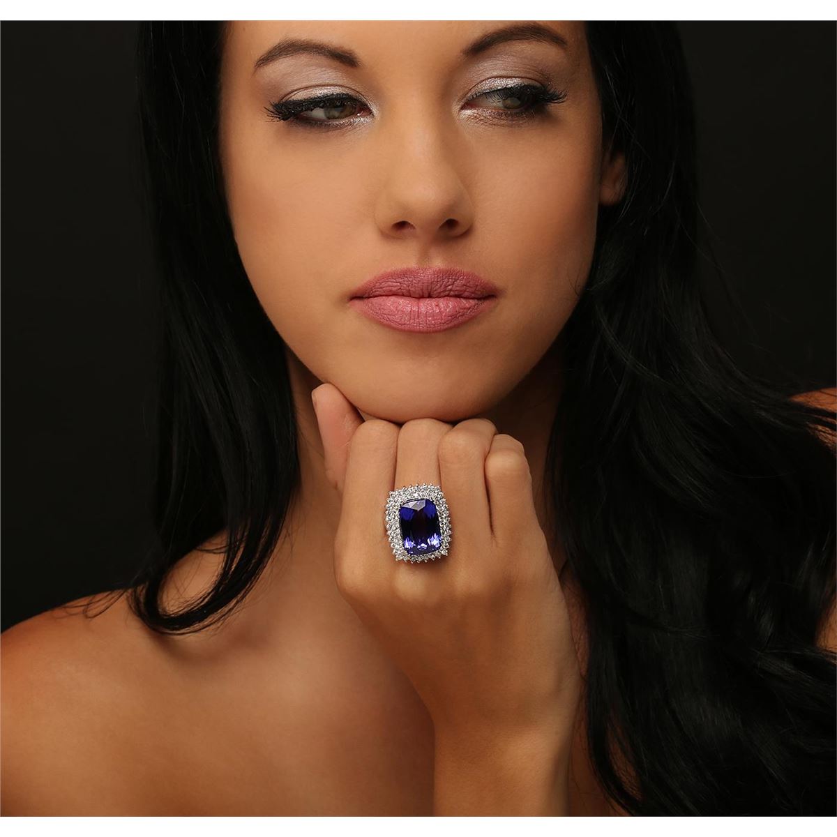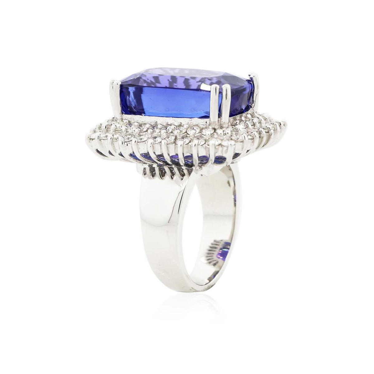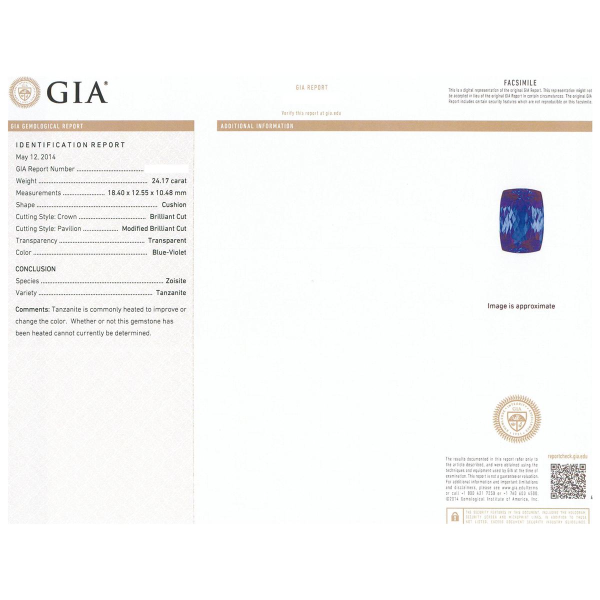 One electronically tested 14KT white gold ladies cast tanzanite and diamond ring with a bright polish finish. Condition is new, good workmanship. The featured tanzanite is set within a two tiered diamond lattice gallery, completed by a four millimeter wide band. Identified with markings of "K14". Containing: One prong set rectangular cushion modified brilliant cut natural tanzanite, measuring 18.40 x 12.55 x 10.48mm, exact weight 24.17ct., type I Clarity is eye clean, medium dark, moderately strong, Blue-Violet color, (GIA BV 6/4), cut is good. Transmitting light with no distortion, transparent. GIA Gemological Report attached. Graded loose prior to setting in the GIA Laboratory, Report # 6167077832.Tanzanite is a very rare gemstone that is only found in the country of Tanzania. Originally discovered in 1967. Tiffany & Company, named the stone Tanzanite. It is found in the Usumburu Mountains that border the Umba Valley of northern Tanzania. Tanzanite occurs in gray, brown, violet, blue, reddish-purple, & green. The gem is interesting because of its exceptional pleochroism. Rotated in different directions a tanzanite will exhibit multiple changes of color. Tanzanite has a low tolerance to ultrasonic cleaning, and should not be cleaned using this method. Sixty-Five prong set round brilliant cut diamonds, measuring 1.90 - 1.80 x 1.11mm (depth est.) approximate total weight of 65 Stones = 1.60ct. Graded in the setting. Clarity: SI-2 to I-1 . Color: F - H. Total Weight of Colored Stones 24.17ct. Total Weight of Diamonds 1.60ct. Total Weight of Ring 19.70 grams. AIG Appraised at $73,615.00.