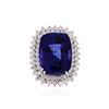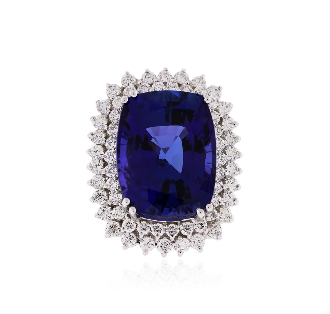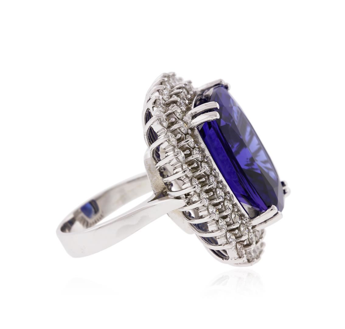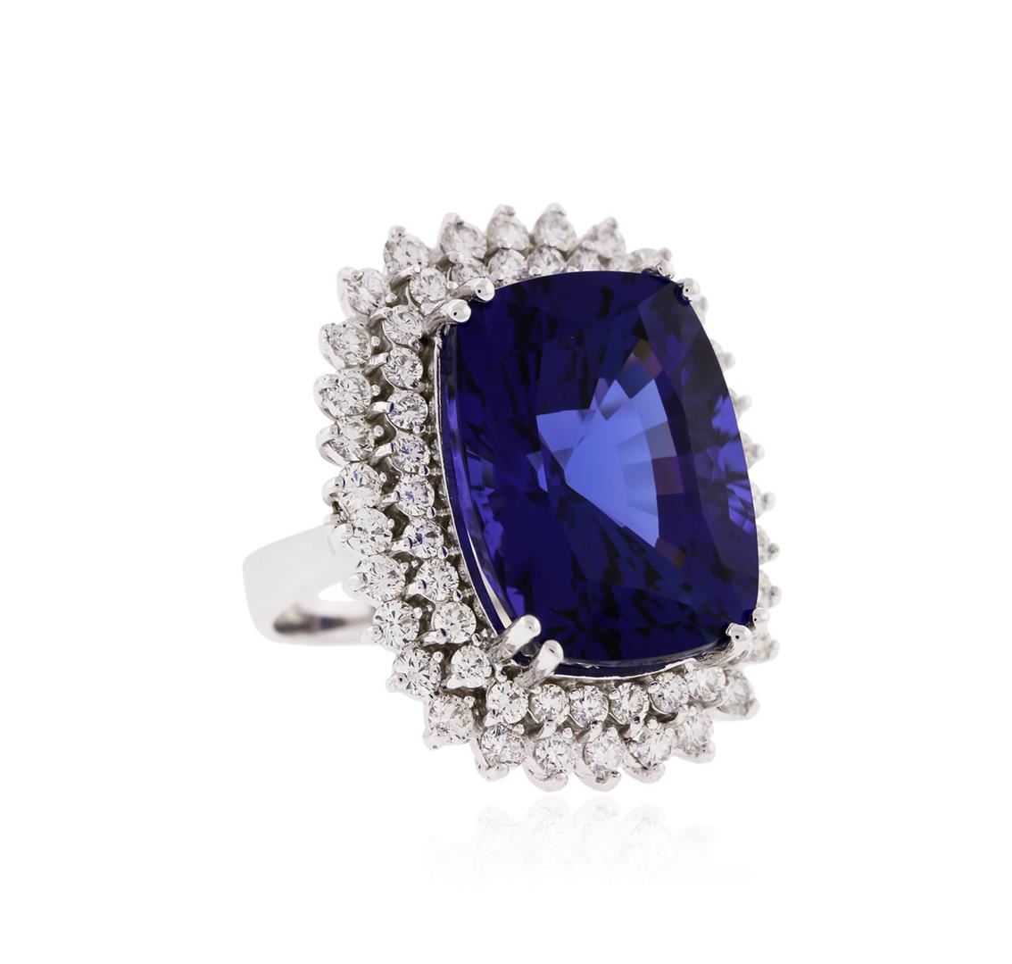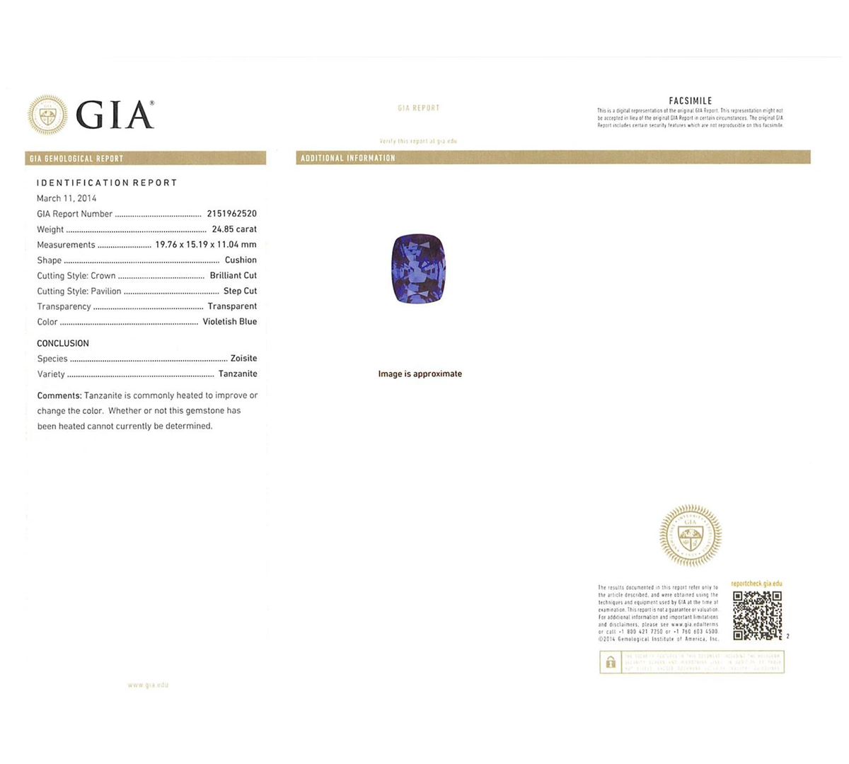 One electronically tested 14KT white gold ladies cast tanzanite and diamond ring with a bright polish finish. The featured tanzanite is set within two tiered diamond bezels, completed by a three and one-half millimeter wide band. Identified with markings of "14K". Condition is new, good workmanship. Containing: One prong set cushion mixed cut natural tanzanite, measuring 19.76 x 15.19 x 11.04mm, exact weight 24.85ct., clarity is eye clean, type I, dark, moderately strong, violetish blue color, (GIA vB 7/4), cut is good. Transmitting light with no distortion, transparent. GIA Gemological Report attached. Graded loose prior to setting in the GIA Laboratory, Report #2151962520.Tanzanite is a very rare gemstone that is only found in the country of Tanzania. Originally discovered in 1967. Tiffany & Company, named the stone Tanzanite. It is found in the Usumburu Mountains that border the Umba Valley of northern Tanzania. Tanzanite occurs in gray, brown, violet, blue, reddish-purple, & green. The gem is interesting because of its exceptional pleochroism. Rotated in different directions a tanzanite will exhibit multiple changes of color. Tanzanite has a low tolerance to ultrasonic cleaning, and should not be cleaned using this method. Sixty prong set round brilliant cut diamonds, measuring 2.40 - 2.20 x 1.38mm (depth est.) approximate total weight of 60 Stones = 2.77ct. Graded in the setting. Clarity: VS-2 to SI-1. Color: G - I. Total Weight of Colored Stones 24.85ct. Total Weight of Diamonds 2.77ct. Total Weight of Ring 17.65 grams. AIG Appraised at $74,820.00.