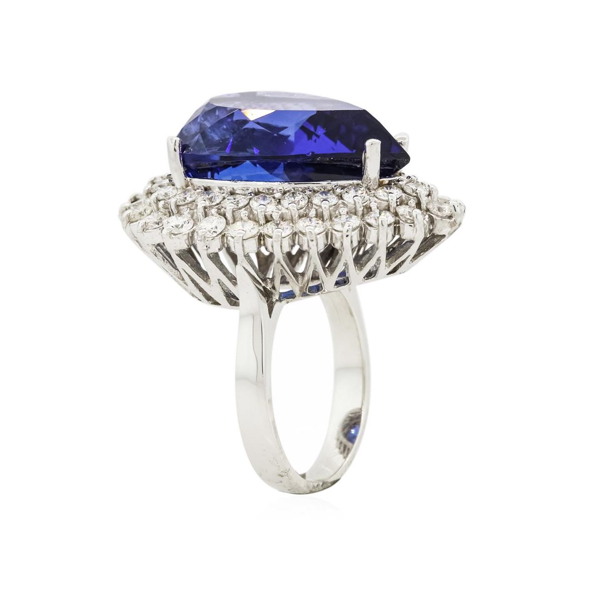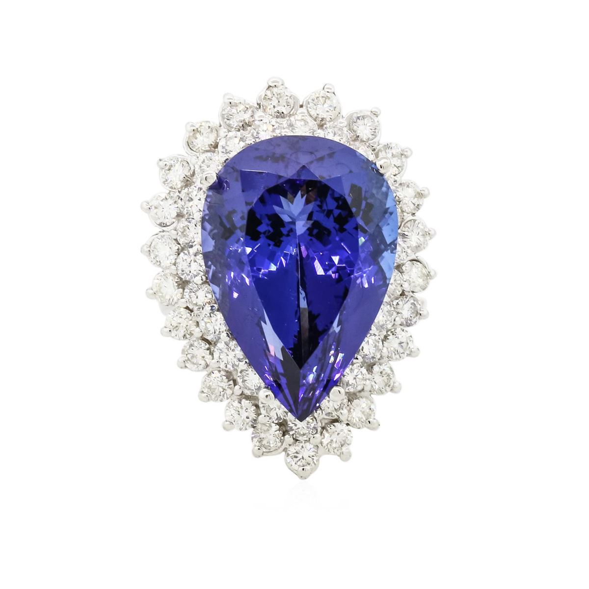 One electronically tested 14KT white gold ladies cast tanzanite and diamond ring with a bright polish finish. Condition is new, good workmanship. The featured tanzanite is set within two tiered diamond bezels, completed by a three millimeter wide band. Identified with markings of "K14". Containing: One prong set pear modified brilliant cut natural tanzanite, measuring 22.57 x 15.46 x 11.55mm, exact weight 24.90ct., clarity is eye clean, type I, dark, moderately strong, violetish blue color, (GIA vB 7/4), cut is good. Transmitting light with no distortion, transparent. GIA Gemological Report attached. Graded loose prior to setting in the GIA Laboratory, Report #2161077461.Tanzanite is a very rare gemstone that is only found in the country of Tanzania. Originally discovered in 1967. Tiffany & Company, named the stone Tanzanite. It is found in the Usumburu Mountains that border the Umba Valley of northern Tanzania. Tanzanite occurs in gray, brown, violet, blue, reddish-purple, & green. The gem is interesting because of its exceptional pleochroism. Rotated in different directions a tanzanite will exhibit multiple changes of color. Tanzanite has a low tolerance to ultrasonic cleaning, and should not be cleaned using this method. Forty-Seven prong set round brilliant cut diamonds, measuring 2.50 - 2.40 x 1.47mm (depth est.) approximate total weight of 47 Stones = 2.62ct. Graded in the setting. Clarity: SI-1 to I-1 . Color: G - I. Total Weight of Colored Stones 24.90ct. Total Weight of Diamonds 2.62ct. Total Weight of Ring 17.12 grams. AIG Appraised at $72,530.00.