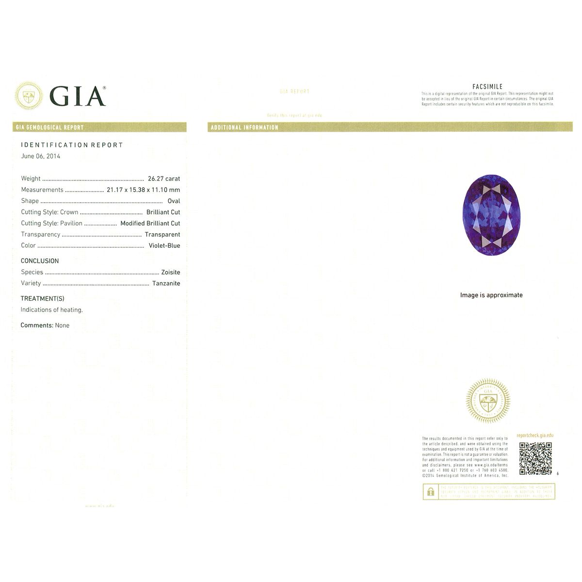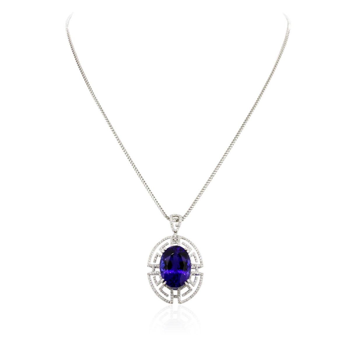 One electronically tested 14KT white gold ladies cast & assembled tanzanite and diamond pendant with chain. The pendant features a tanzanite set within a geometric diamond lattice gallery, completed by a diamond set bail. The pendant is supported by an eighteen inch length 14KT white gold designer style chain, terminating in a lobster claw clasp. Bright polish finish. Condition is new, good workmanship. Containing: One prong set oval modified brilliant cut natural tanzanite, measuring 21.17 x 15.38 x 11.10mm, exact weight 26.27ct., type I Clarity is eye clean, dark, moderately strong, violet-blue color, (GIA VB), cut is good. Transmitting light with no distortion, transparent. GIA Gemological Report attached. Graded loose prior to setting in the GIA Laboratory, Report #1166211912.Tanzanite is a very rare gemstone that is only found in the country of Tanzania. Originally discovered in 1967. Tiffany & Company, named the stone Tanzanite. It is found in the Usumburu Mountains that border the Umba Valley of northern Tanzania. Tanzanite occurs in gray, brown, violet, blue, reddish-purple, & green. The gem is interesting because of its exceptional pleochroism. Rotated in different directions a tanzanite will exhibit multiple changes of color. Tanzanite has a low tolerance to ultrasonic cleaning, and should not be cleaned using this method. Two Hundred Fourteen prong set round brilliant cut diamonds, measuring 1.10 - 1.10 x 0.66mm (depth est.) approximate total weight of 214 Stones = 1.06ct. Graded in the setting. Clarity: SI-1 to I-1. Color: G - I. Total Weight of Colored Stones 26.27ct. Total Weight of Diamonds 1.06ct. Total Weight of Pendant With Chain 19.27 grams. AIG Appraised at $72,775.00.