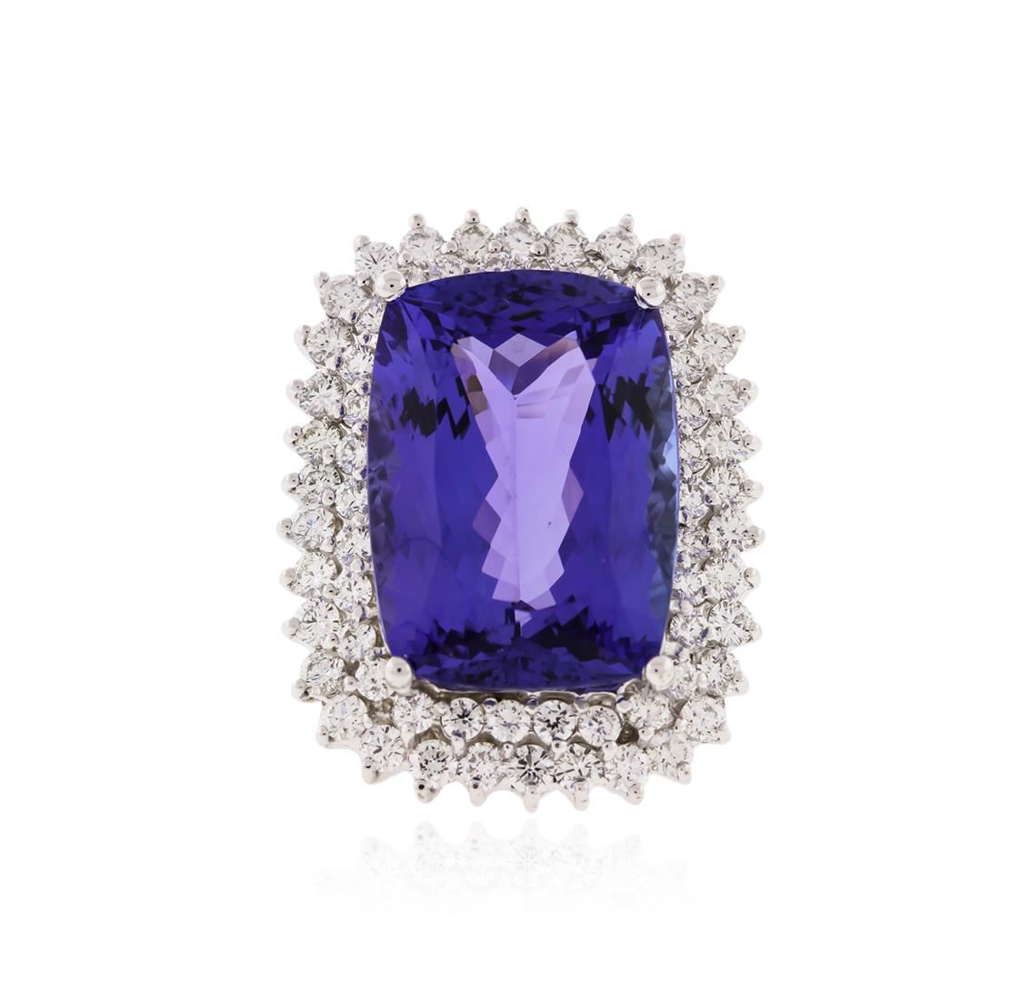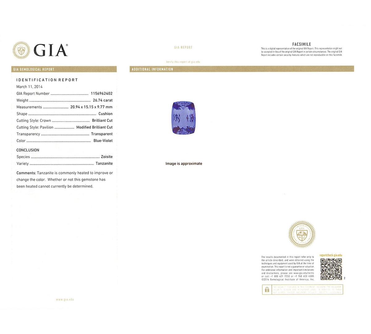 One electronically tested 14KT white gold ladies cast tanzanite and diamond ring with a bright polish finish. The featured tanzanite is set within a tiered diamond bezel, completed by a three millimeter wide band. Identified with markings of "K14". Condition is new, good workmanship. Containing: One prong set cushion mixed cut natural tanzanite, measuring 20.94 x 15.15 x 9.77mm, exact weight 26.74ct., type I Clarity is eye clean, dark, moderately strong, blue-violet color, (GIA BV), cut is good. Transmitting light with no distortion, transparent. GIA Gemological Report attached. Graded loose prior to setting in the GIA Laboratory, Report #1156962402. Tanzanite is a very rare gemstone that is only found in the country of Tanzania. Originally discovered in 1967. Tiffany & Company, named the stone Tanzanite. It is found in the Usumburu Mountains that border the Umba Valley of northern Tanzania. Tanzanite occurs in gray, brown, violet, blue, reddish-purple, & green. The gem is interesting because of its exceptional pleochroism. Rotated in different directions a tanzanite will exhibit multiple changes of color. Tanzanite has a low tolerance to ultrasonic cleaning, and should not be cleaned using this method.Sixty-Four prong set round brilliant cut diamonds, measuring 2.40 - 2.20 x 1.38mm (depth est.) approximate total weight of 64 Stones = 2.94ct. Graded in the setting. Clarity: VS-1 to VS-2. Color: H - J. Total Weight of Colored Stones 26.74ct. Total Weight of Diamonds 2.94ct. Total Weight of Ring 16.57 grams. AIG Appraised at $80,485.00.