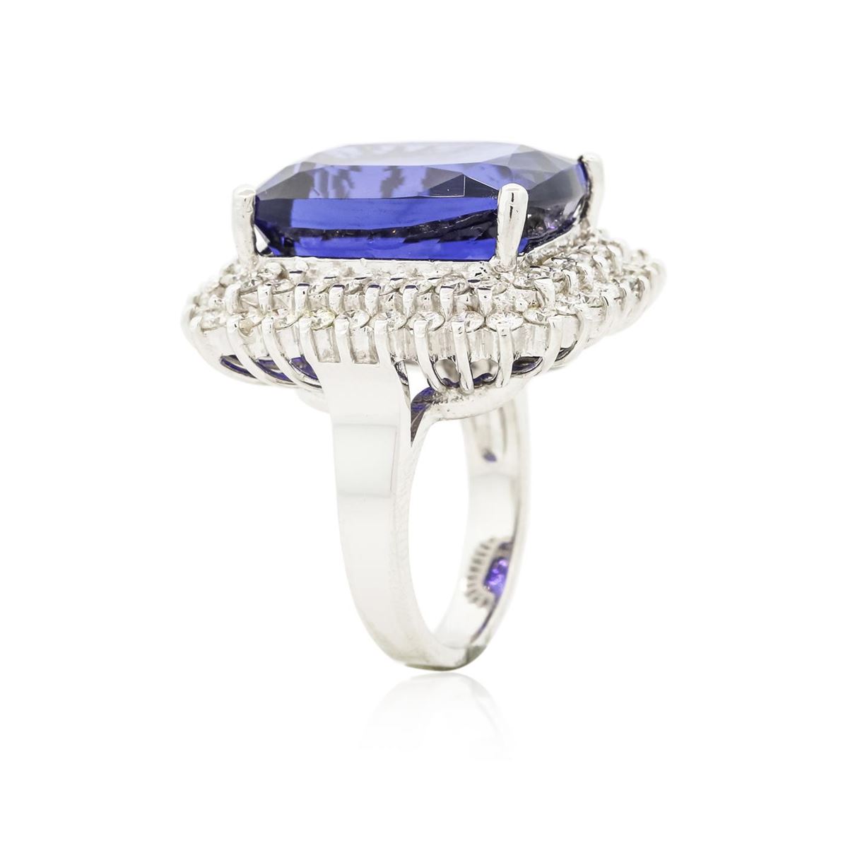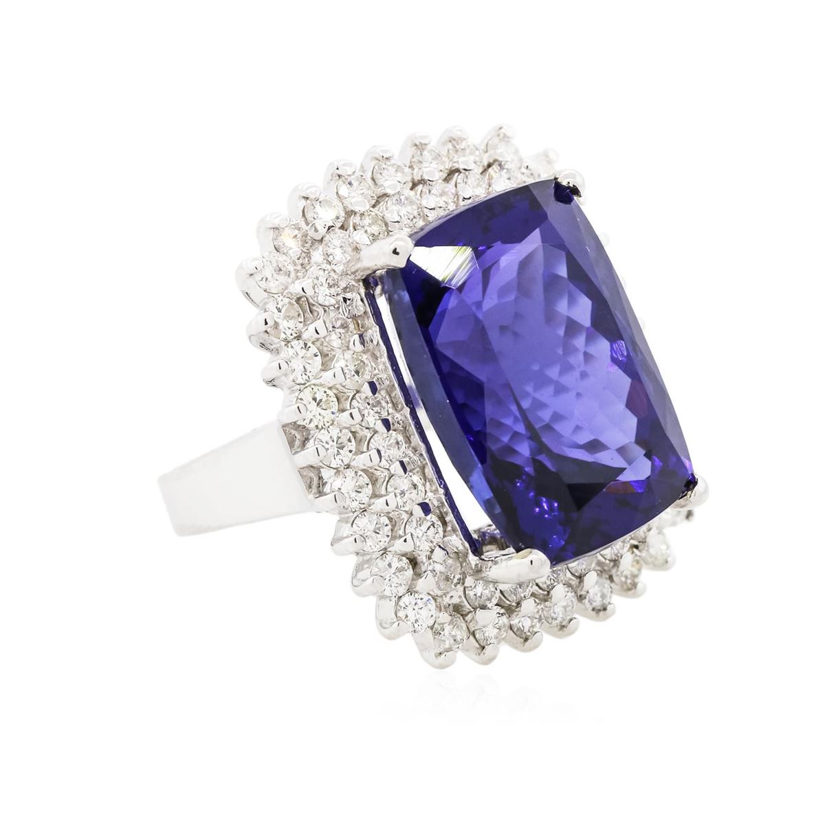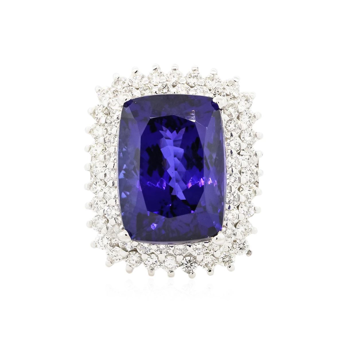 One electronically tested 14KT white gold ladies cast tanzanite and diamond ring with a bright polish finish. Condition is new, good workmanship. The featured tanzanite is set within a diamond lattice gallery, completed by a three millimeter wide. Identified with markings of "K14". Containing: One prong set rectangular cushion modified brilliant cut natural tanzanite, measuring 19.52 x 14.23 x 11.45mm, approximate weight of 27.79ct., clarity is eye clean, type I, medium dark, moderately strong, bluish violet color, (GIA bV 6/4), cut is good. Transmitting light with no distortion, transparent. GIA Gemological Report attached. Graded loose prior to setting in the GIA Laboratory, Report # 6167077697.Tanzanite is a very rare gemstone that is only found in the country of Tanzania. Originally discovered in 1967. Tiffany & Company, named the stone Tanzanite. It is found in the Usumburu Mountains that border the Umba Valley of northern Tanzania. Tanzanite occurs in gray, brown, violet, blue, reddish-purple, & green. The gem is interesting because of its exceptional pleochroism. Rotated in different directions a tanzanite will exhibit multiple changes of color. Tanzanite has a low tolerance to ultrasonic cleaning, and should not be cleaned using this method. Sixty prong set round brilliant cut diamonds, measuring 2.30 - 2.20 x 1.35mm (depth est.) approximate total weight of 60 Stones = 2.59ct. Graded in the setting. Clarity: I-1 to I-2 . Color: F - H. Total Weight of Colored Stones 27.79ct. Total Weight of Diamonds 2.59ct. Total Weight of Ring 19.40 grams. AIG Appraised at $86,785.00.