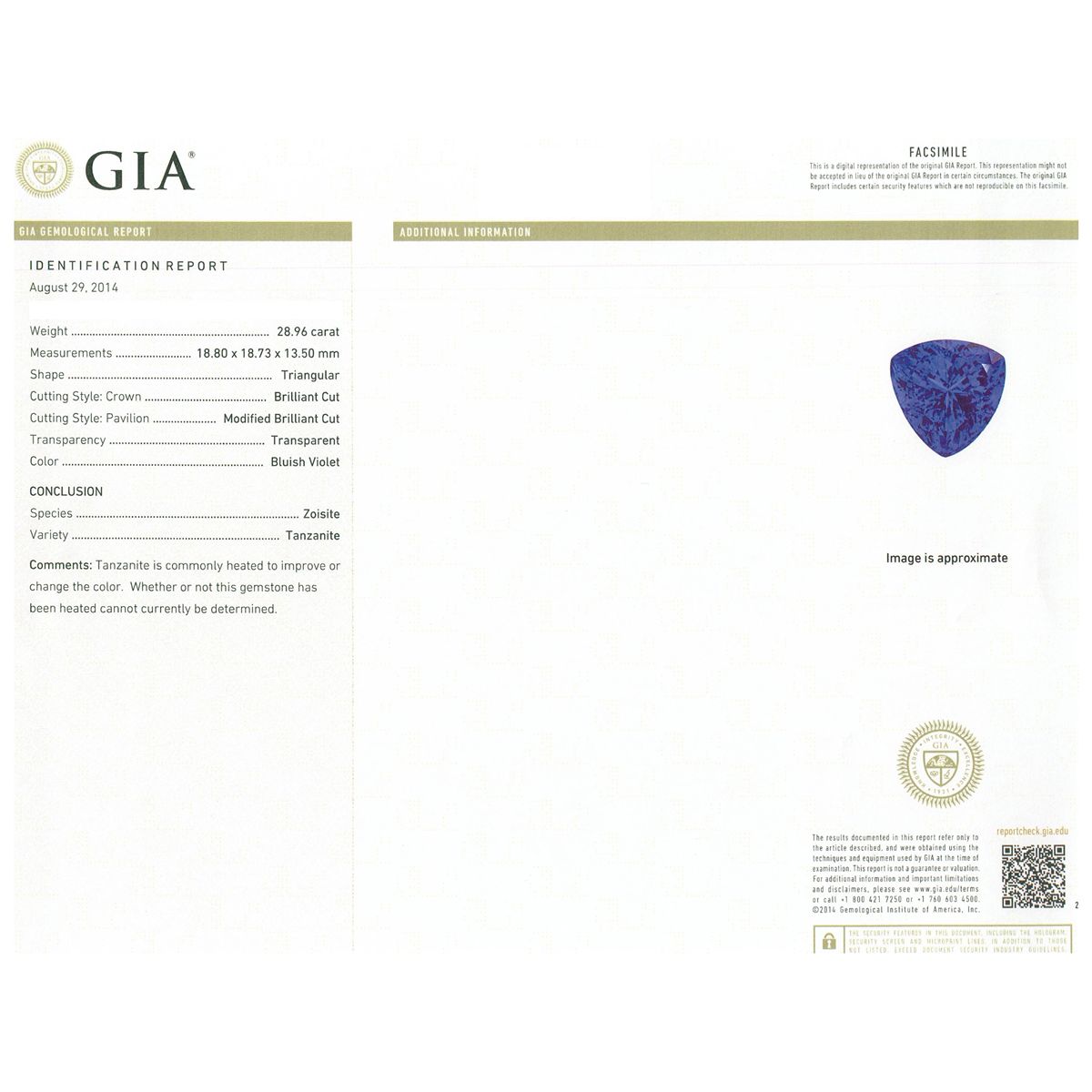 One electronically tested 14KT white gold ladies cast tanzanite and diamond ring with a bright polish finish. The featured tanzanite is set within two tiered diamond bezels, completed by a three millimeter wide band. Identified with markings of "K14". Condition is new, good workmanship. Containing: One prong set triangular modified brilliant cut natural tanzanite, measuring 18.80 x 18.73 x 13.50mm, exact weight 28.96ct., clarity is eye clean, type I, dark, moderately strong, bluish violet color, (GIA bV 7/4), cut is good. Transmitting light with no distortion, transparent. GIA Gemological Report attached. Graded loose prior to setting in the GIA Laboratory, Report #2161542758.Tanzanite is a very rare gemstone that is only found in the country of Tanzania. Originally discovered in 1967. Tiffany & Company, named the stone Tanzanite. It is found in the Usumburu Mountains that border the Umba Valley of northern Tanzania. Tanzanite occurs in gray, brown, violet, blue, reddish-purple, & green. The gem is interesting because of its exceptional pleochroism. Rotated in different directions a tanzanite will exhibit multiple changes of color. Tanzanite has a low tolerance to ultrasonic cleaning, and should not be cleaned using this method. Thirty-Three prong set round brilliant cut diamonds, measuring 2.30 - 2.20 x 1.35mm (depth est.) approximate total weight of 33 Stones = 1.47ct. Graded in the setting. Clarity: SI-1 to I-1. Color: G - I Thirty prong set round brilliant cut diamonds, measuring 2.00 - 1.90 x 1.17mm (depth est.) approximate total weight of 30 Stones = 0.91ct. Graded in the setting. Clarity: SI-1 to I-1. Color: G - I. Total Weight of Colored Stones 28.96ct. Total Weight of Diamonds 2.38ct. Total Weight of Ring 15.14 grams. AIG Appraised at $86,785.00.