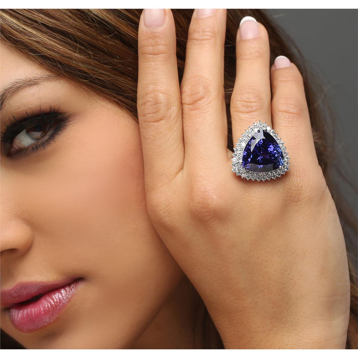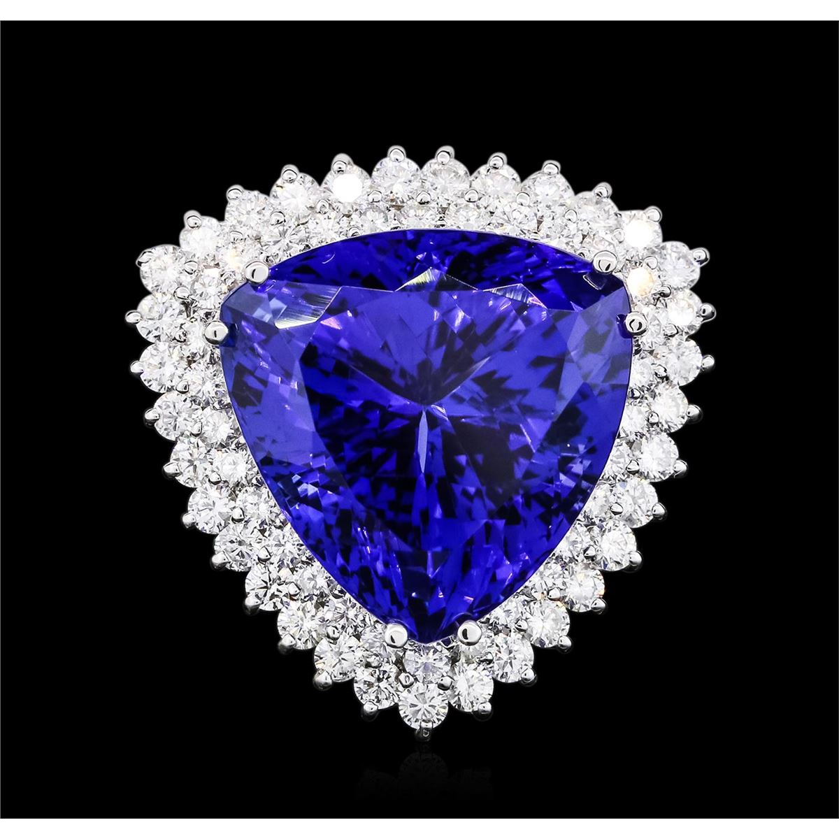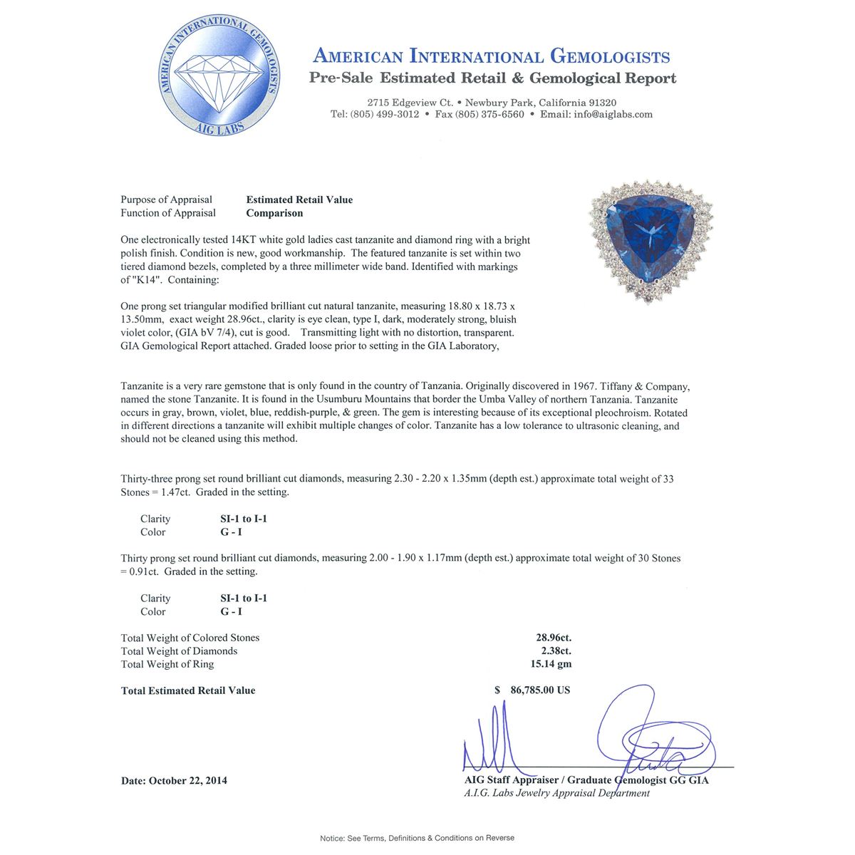 One electronically tested 14KT white gold ladies cast tanzanite and diamond ring with a bright polish finish. The featured tanzanite is set within two tiered diamond bezels, completed by a three millimeter wide band. Identified with markings of "K14". Condition is new, good workmanship. Containing: One prong set triangular modified brilliant cut natural tanzanite, measuring 18.80 x 18.73 x 13.50mm, exact weight 28.96ct., clarity is eye clean, type I, dark, moderately strong, bluish violet color, (GIA bV 7/4), cut is good. Transmitting light with no distortion, transparent. GIA Gemological Report attached. Graded loose prior to setting in the GIA Laboratory, Report #2161542758.Tanzanite is a very rare gemstone that is only found in the country of Tanzania. Originally discovered in 1967. Tiffany & Company, named the stone Tanzanite. It is found in the Usumburu Mountains that border the Umba Valley of northern Tanzania. Tanzanite occurs in gray, brown, violet, blue, reddish-purple, & green. The gem is interesting because of its exceptional pleochroism. Rotated in different directions a tanzanite will exhibit multiple changes of color. Tanzanite has a low tolerance to ultrasonic cleaning, and should not be cleaned using this method. Thirty-Three prong set round brilliant cut diamonds, measuring 2.30 - 2.20 x 1.35mm (depth est.) approximate total weight of 33 Stones = 1.47ct. Graded in the setting. Clarity: SI-1 to I-1. Color: G - I Thirty prong set round brilliant cut diamonds, measuring 2.00 - 1.90 x 1.17mm (depth est.) approximate total weight of 30 Stones = 0.91ct. Graded in the setting. Clarity: SI-1 to I-1. Color: G - I. Total Weight of Colored Stones 28.96ct. Total Weight of Diamonds 2.38ct. Total Weight of Ring 15.14 grams. AIG Appraised at $86,785.00.