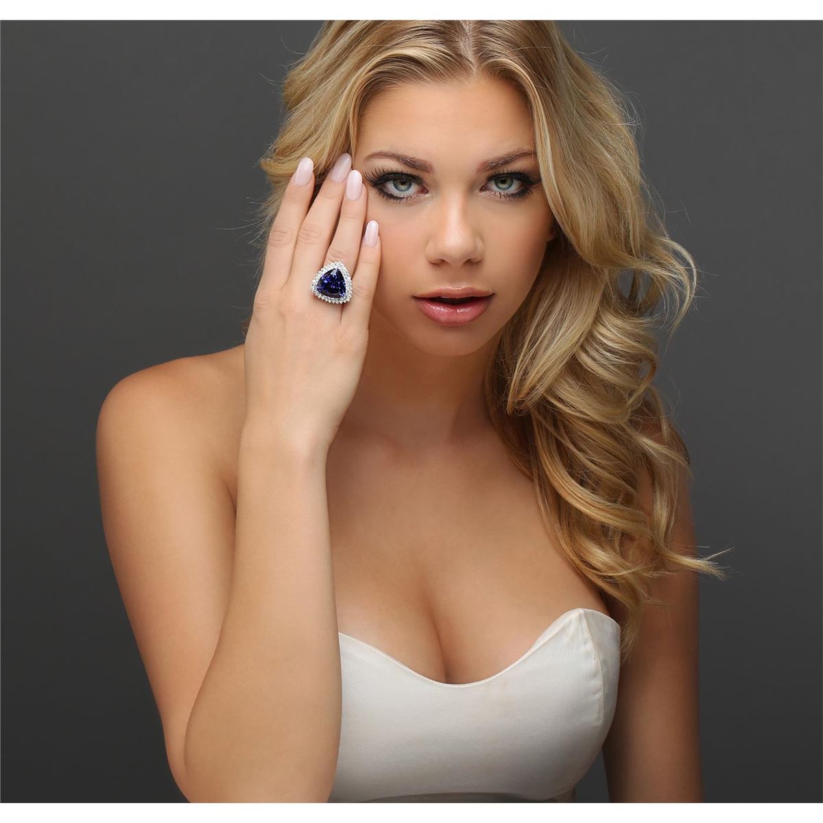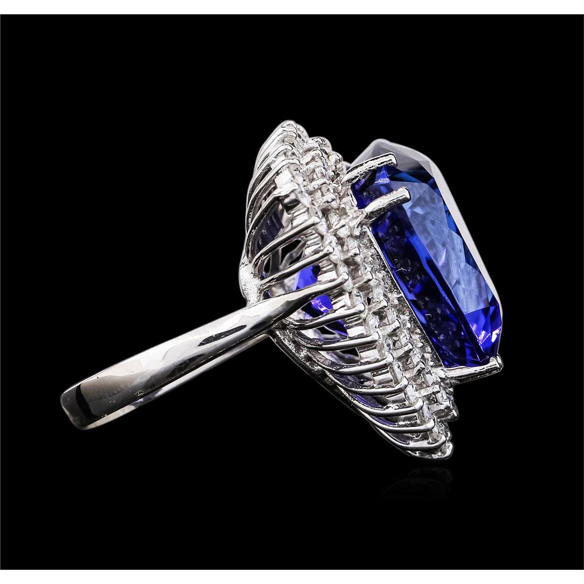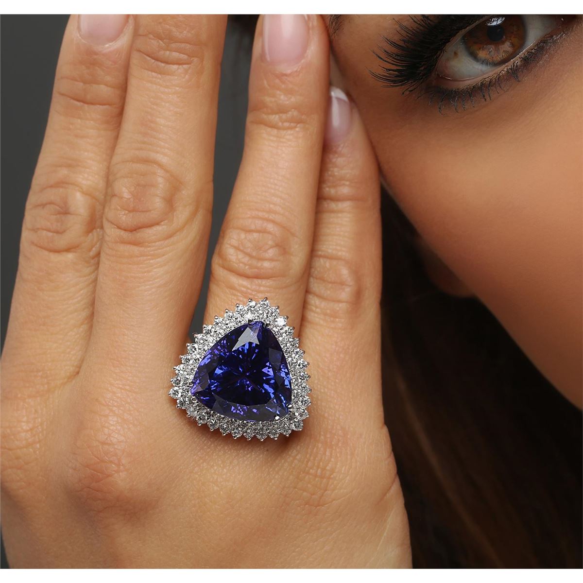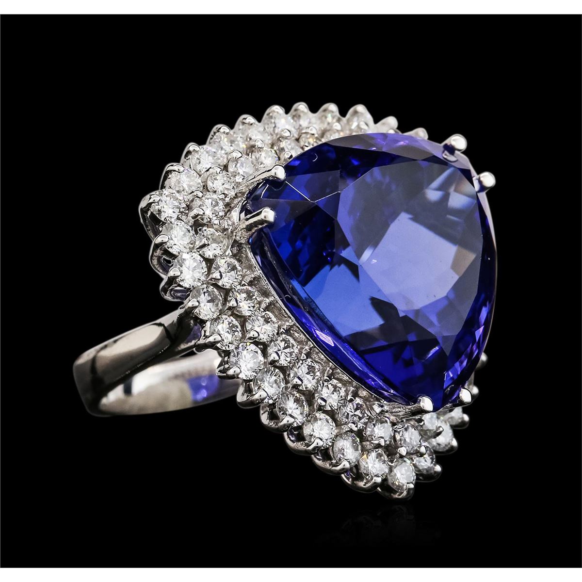One electronically tested 14KT white gold ladies cast tanzanite and diamond ring with a bright polish finish. The featured tanzanite is set within two tiered diamond bezels, completed by a three millimeter wide band. Identified with markings of "K14". Condition is new, good workmanship. Containing: One prong set triangular modified brilliant cut natural tanzanite, measuring 18.80 x 18.73 x 13.50mm, exact weight 28.96ct., clarity is eye clean, type I, dark, moderately strong, bluish violet color, (GIA bV 7/4), cut is good. Transmitting light with no distortion, transparent. GIA Gemological Report attached. Graded loose prior to setting in the GIA Laboratory, Report #2161542758.Tanzanite is a very rare gemstone that is only found in the country of Tanzania. Originally discovered in 1967. Tiffany & Company, named the stone Tanzanite. It is found in the Usumburu Mountains that border the Umba Valley of northern Tanzania. Tanzanite occurs in gray, brown, violet, blue, reddish-purple, & green. The gem is interesting because of its exceptional pleochroism. Rotated in different directions a tanzanite will exhibit multiple changes of color. Tanzanite has a low tolerance to ultrasonic cleaning, and should not be cleaned using this method. Thirty-Three prong set round brilliant cut diamonds, measuring 2.30 - 2.20 x 1.35mm (depth est.) approximate total weight of 33 Stones = 1.47ct. Graded in the setting. Clarity: SI-1 to I-1. Color: G - I Thirty prong set round brilliant cut diamonds, measuring 2.00 - 1.90 x 1.17mm (depth est.) approximate total weight of 30 Stones = 0.91ct. Graded in the setting. Clarity: SI-1 to I-1. Color: G - I. Total Weight of Colored Stones 28.96ct. Total Weight of Diamonds 2.38ct. Total Weight of Ring 15.14 grams. AIG Appraised at $86,785.00.