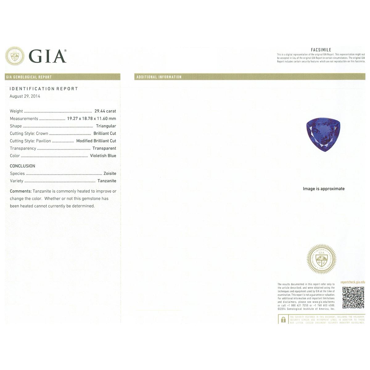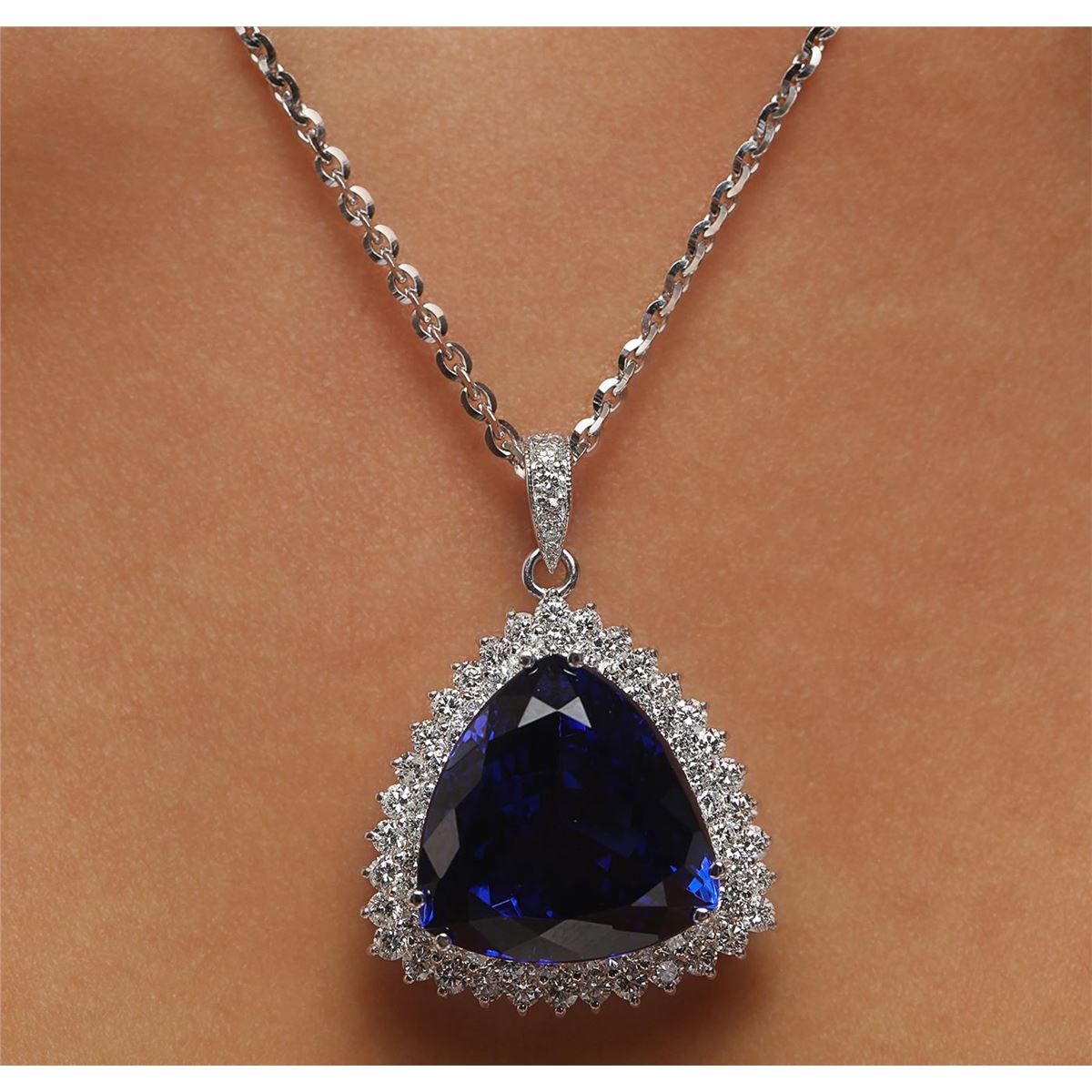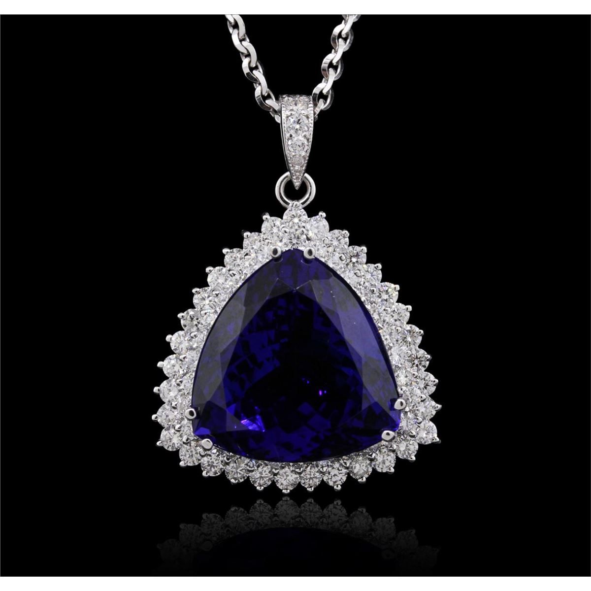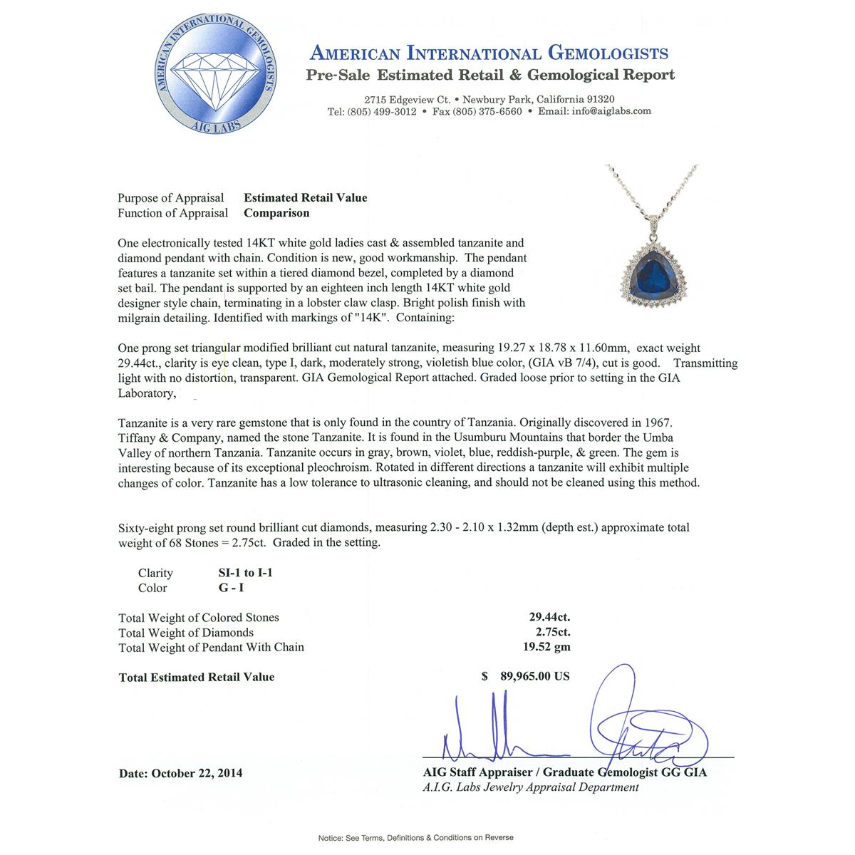One electronically tested 14KT white gold ladies cast & assembled tanzanite and diamond pendant with chain. The pendant features a tanzanite set within a tiered diamond bezel, completed by a diamond set bail. The pendant is supported by an eighteen inch length 14KT white gold designer style chain, terminating in a lobster claw clasp. Bright polish finish with milgrain detailing. Identified with markings of 14K. Condition is new, good workmanship. Containing: One prong set triangular modified brilliant cut natural tanzanite, measuring 19.27 x 18.78 x 11.60mm, exact weight 29.44ct., clarity is eye clean, type I, dark, moderately strong, violetish blue color, (GIA vB 7/4), cut is good. Transmitting light with no distortion, transparent. GIA Gemological Report attached. Graded loose prior to setting in the GIA Laboratory, Report #2161542707.Tanzanite is a very rare gemstone that is only found in the country of Tanzania. Originally discovered in 1967. Tiffany & Company, named the stone Tanzanite. It is found in the Usumburu Mountains that border the Umba Valley of northern Tanzania. Tanzanite occurs in gray, brown, violet, blue, reddish-purple, & green. The gem is interesting because of its exceptional pleochroism. Rotated in different directions a tanzanite will exhibit multiple changes of color. Tanzanite has a low tolerance to ultrasonic cleaning, and should not be cleaned using this method. Sixty-Eight prong set round brilliant cut diamonds, measuring 2.30 - 2.10 x 1.32mm (depth est.) approximate total weight of 68 Stones = 2.75ct. Graded in the setting. Clarity: SI-1 to I-1. Color: G - I. Total Weight of Colored Stones 29.44ct. Total Weight of Diamonds 2.75ct. Total Weight of Pendant With Chain 19.52 grams. AIG Appraised at $89,965.00.