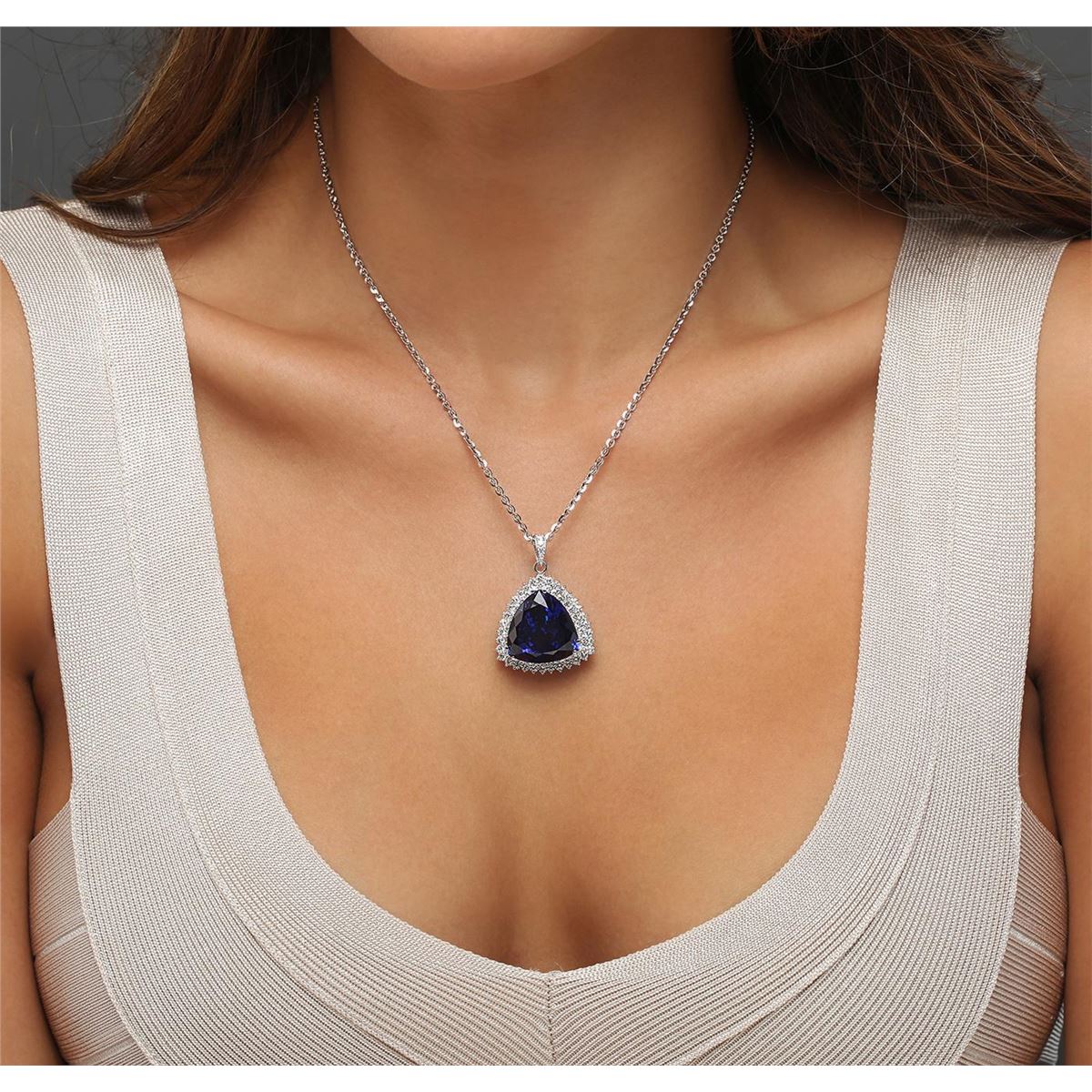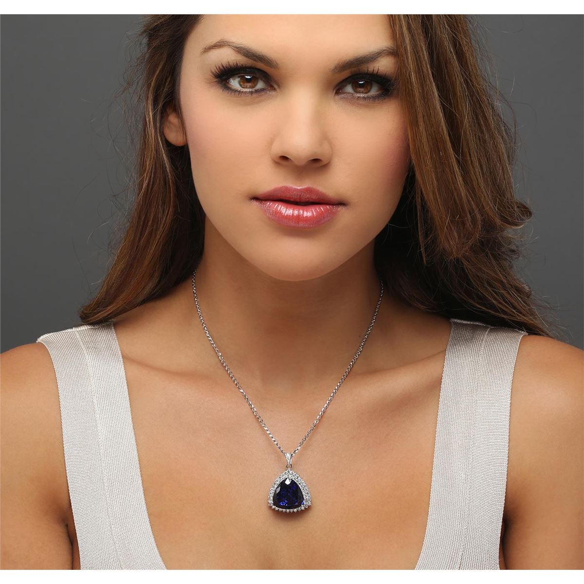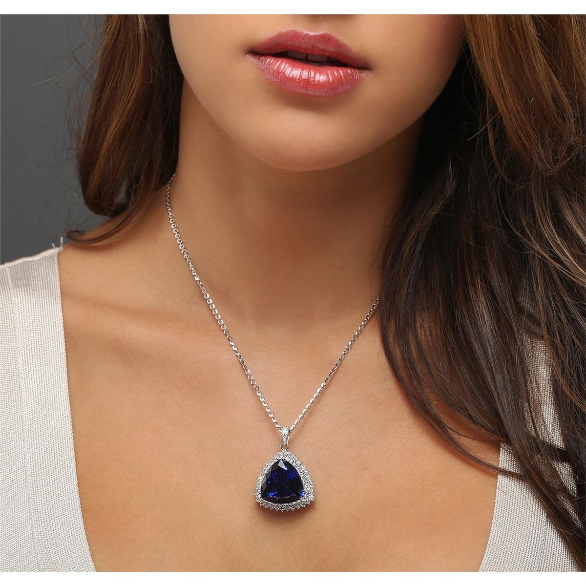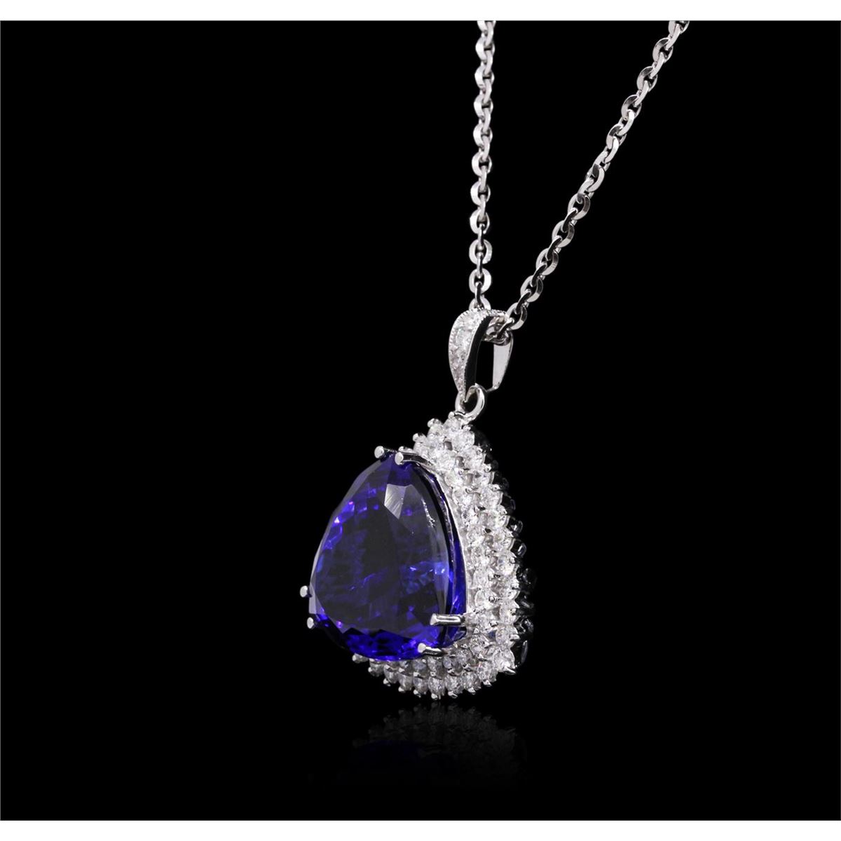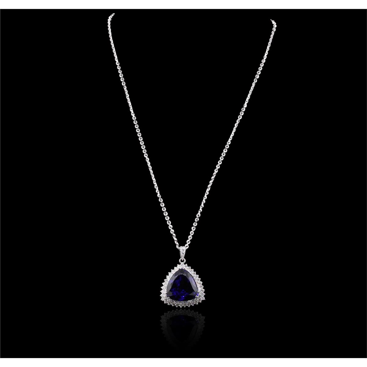 One electronically tested 14KT white gold ladies cast & assembled tanzanite and diamond pendant with chain. The pendant features a tanzanite set within a tiered diamond bezel, completed by a diamond set bail. The pendant is supported by an eighteen inch length 14KT white gold designer style chain, terminating in a lobster claw clasp. Bright polish finish with milgrain detailing. Identified with markings of 14K. Condition is new, good workmanship. Containing: One prong set triangular modified brilliant cut natural tanzanite, measuring 19.27 x 18.78 x 11.60mm, exact weight 29.44ct., clarity is eye clean, type I, dark, moderately strong, violetish blue color, (GIA vB 7/4), cut is good. Transmitting light with no distortion, transparent. GIA Gemological Report attached. Graded loose prior to setting in the GIA Laboratory, Report #2161542707.Tanzanite is a very rare gemstone that is only found in the country of Tanzania. Originally discovered in 1967. Tiffany & Company, named the stone Tanzanite. It is found in the Usumburu Mountains that border the Umba Valley of northern Tanzania. Tanzanite occurs in gray, brown, violet, blue, reddish-purple, & green. The gem is interesting because of its exceptional pleochroism. Rotated in different directions a tanzanite will exhibit multiple changes of color. Tanzanite has a low tolerance to ultrasonic cleaning, and should not be cleaned using this method. Sixty-Eight prong set round brilliant cut diamonds, measuring 2.30 - 2.10 x 1.32mm (depth est.) approximate total weight of 68 Stones = 2.75ct. Graded in the setting. Clarity: SI-1 to I-1. Color: G - I. Total Weight of Colored Stones 29.44ct. Total Weight of Diamonds 2.75ct. Total Weight of Pendant With Chain 19.52 grams. AIG Appraised at $89,965.00.