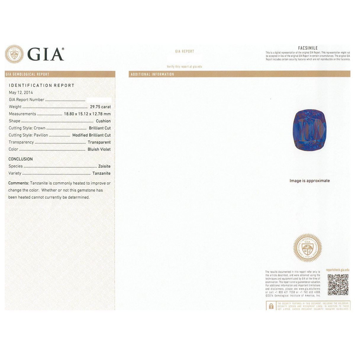 One electronically tested 14KT white gold ladies cast tanzanite and diamond ring with a bright polish finish. Condition is new, good workmanship. The featured tanzanite is set within two tiered diamond bezels, completed by a two and one-half millimeter wide band. Identified with markings of "K14". Containing: One prong set cushion modified brilliant cut natural tanzanite, measuring 18.80 x 15.12 x 12.78mm, exact weight 29.75ct., clarity is eye clean, type I, dark, moderately strong, bluish violet color, (GIA bV 7/4), cut is good. Transmitting light with no distortion, transparent. GIA Gemological Report attached. Graded loose prior to setting in the GIA Laboratory, Report #1166077450.Tanzanite is a very rare gemstone that is only found in the country of Tanzania. Originally discovered in 1967. Tiffany & Company, named the stone Tanzanite. It is found in the Usumburu Mountains that border the Umba Valley of northern Tanzania. Tanzanite occurs in gray, brown, violet, blue, reddish-purple, & green. The gem is interesting because of its exceptional pleochroism. Rotated in different directions a tanzanite will exhibit multiple changes of color. Tanzanite has a low tolerance to ultrasonic cleaning, and should not be cleaned using this method. Sixty prong set round brilliant cut diamonds, measuring 2.00 - 1.90 x 1.17mm (depth est.) approximate total weight of 60 Stones = 1.72ct. Graded in the setting. Clarity: SI-1 to I-1 . Color: G - I. Total Weight of Colored Stones 29.75ct. Total Weight of Diamonds 1.72ct. Total Weight of Ring 14.05 grams. AIG Appraised at $81,120.00.