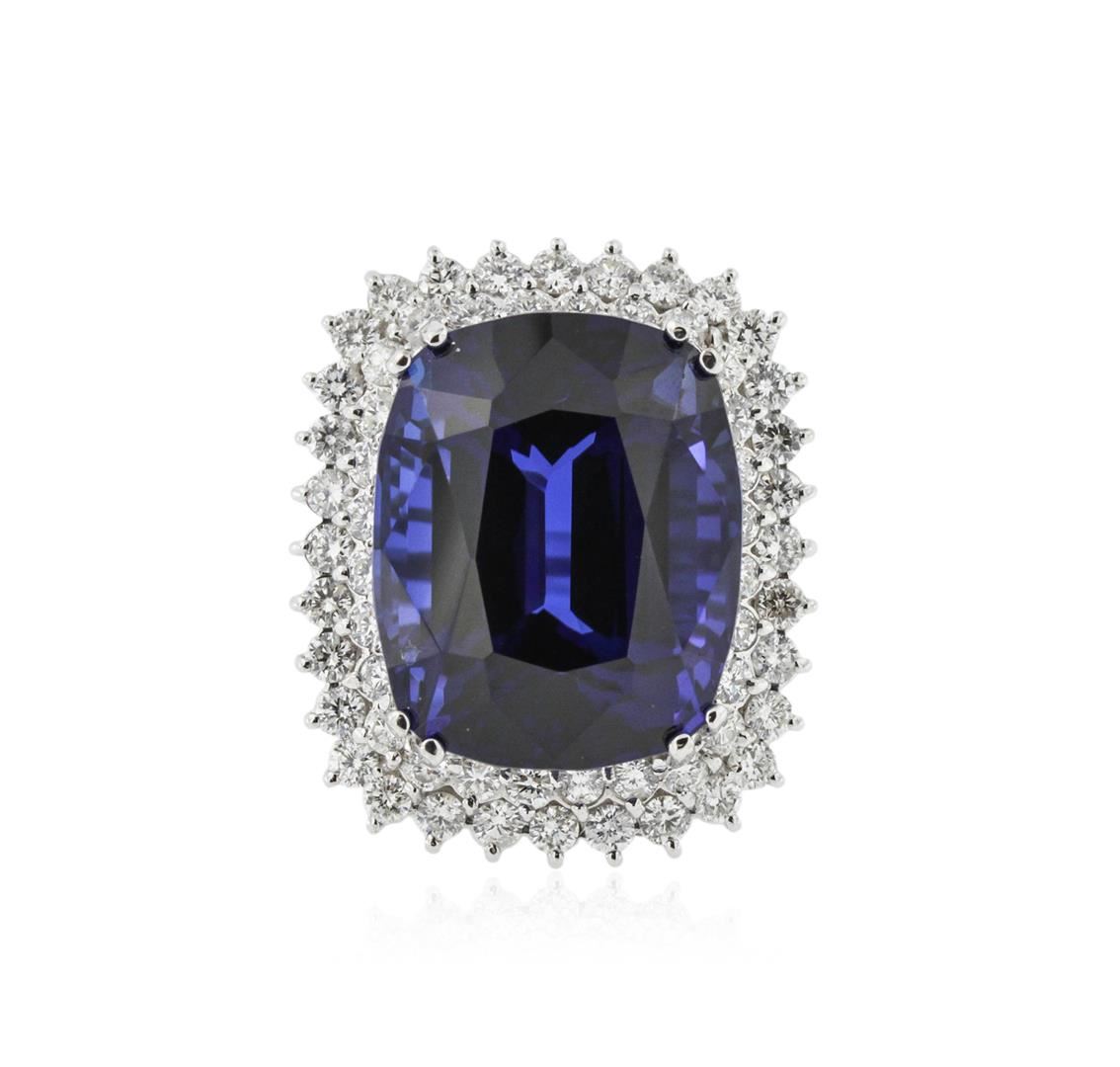One electronically tested 14KT white gold ladies cast tanzanite and diamond ring with a bright polish finish. Condition is new, good workmanship. The featured tanzanite is set within two tiered diamond bezels, completed by a two and one-half millimeter wide band. Identified with markings of "K14". Containing: One prong set cushion modified brilliant cut natural tanzanite, measuring 18.80 x 15.12 x 12.78mm, exact weight 29.75ct., clarity is eye clean, type I, dark, moderately strong, bluish violet color, (GIA bV 7/4), cut is good. Transmitting light with no distortion, transparent. GIA Gemological Report attached. Graded loose prior to setting in the GIA Laboratory, Report #1166077450.Tanzanite is a very rare gemstone that is only found in the country of Tanzania. Originally discovered in 1967. Tiffany & Company, named the stone Tanzanite. It is found in the Usumburu Mountains that border the Umba Valley of northern Tanzania. Tanzanite occurs in gray, brown, violet, blue, reddish-purple, & green. The gem is interesting because of its exceptional pleochroism. Rotated in different directions a tanzanite will exhibit multiple changes of color. Tanzanite has a low tolerance to ultrasonic cleaning, and should not be cleaned using this method. Sixty prong set round brilliant cut diamonds, measuring 2.00 - 1.90 x 1.17mm (depth est.) approximate total weight of 60 Stones = 1.72ct. Graded in the setting. Clarity: SI-1 to I-1 . Color: G - I. Total Weight of Colored Stones 29.75ct. Total Weight of Diamonds 1.72ct. Total Weight of Ring 14.05 grams. AIG Appraised at $81,120.00.