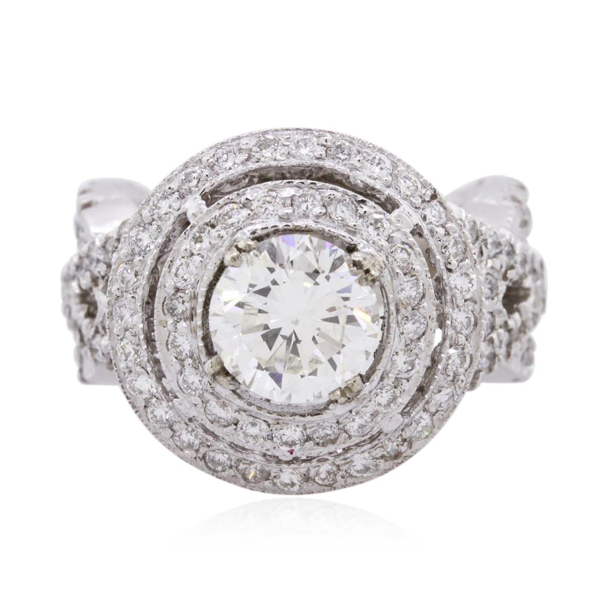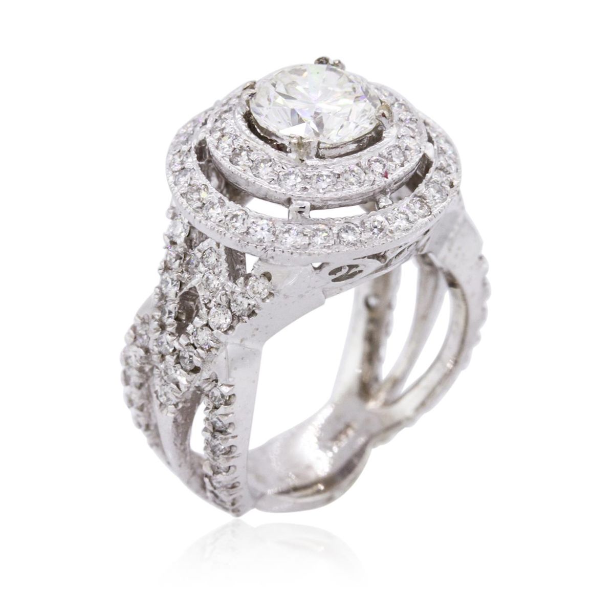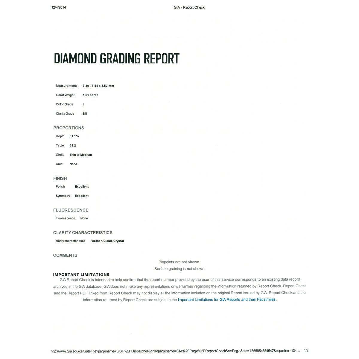 One electronically tested 14KT white gold ladies cast diamond unity ring. The featured diamond is set within two tiered diamond bezels supported by elaborate diamond set intertwining shoulders, completed by a five and one-half millimeter wide band. Bright polish finish with milgrain detailing. Identified with markings of "14K". Condition is new, good workmanship. Containing: One prong set round brilliant cut diamond, measuring 7.39 - 7.44 x 4.53mm exact weight 1.51ct. GIA Diamond Grading Report attached. Graded loose prior to setting in the GIA Laboratory, Report #13447777. Clarity: SI-1. Color: I. Depth 61.1%. Table 59.0%. One Hundred Eight prong set round brilliant cut diamonds, measuring 1.60 - 1.50 x 0.93mm (depth est.) approximate total weight of 108 Stones = 1.50ct. Graded in the setting. Clarity: SI-1 to I-1. Color: G - I. Total Weight of Diamonds 3.01ct. Total Weight of Ring 9.65 grams. AIG Appraised at $29,905.00.