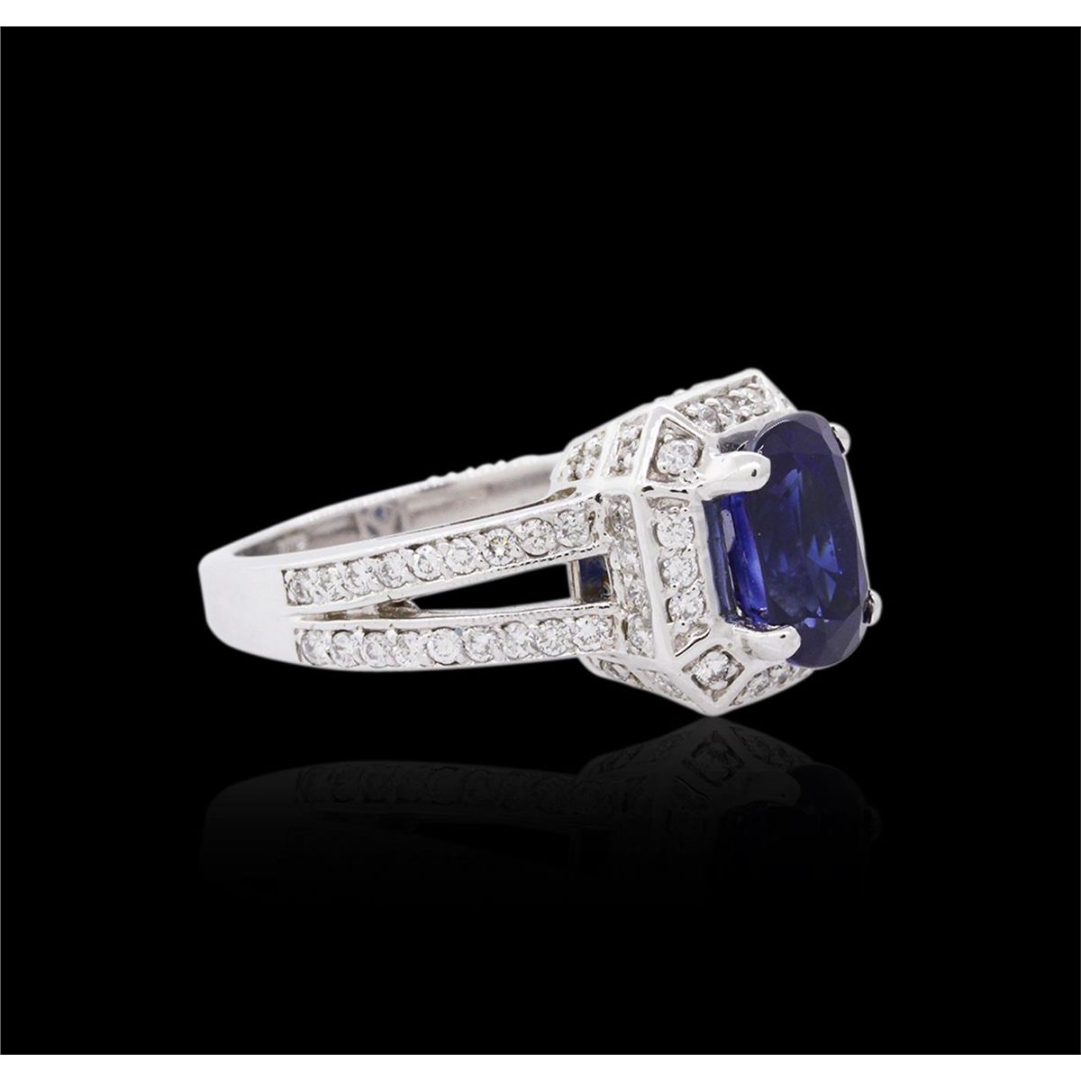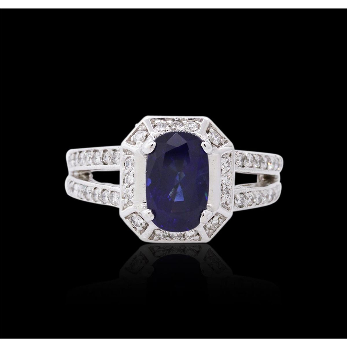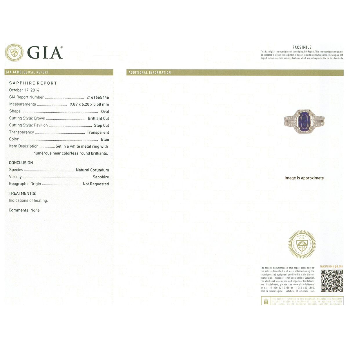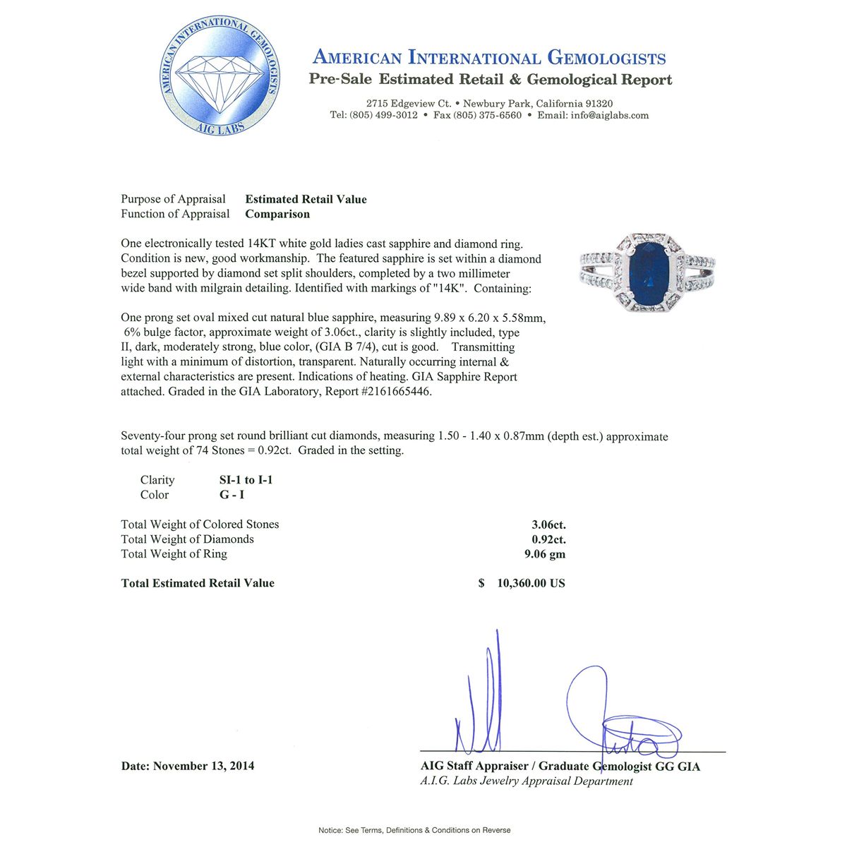 One electronically tested 14KT white gold ladies cast sapphire and diamond ring. The featured sapphire is set within a diamond bezel supported by diamond set split shoulders, completed by a two millimeter wide band with milgrain detailing. Identified with markings of "14K". Condition is new, good workmanship. Containing: One prong set oval mixed cut natural blue sapphire, measuring 9.89 x 6.20 x 5.58mm, 6% bulge factor, approximate weight of 3.06ct., clarity is slightly included, type II, dark, moderately strong, blue color, (GIA B 7/4), cut is good. Transmitting light with a minimum of distortion, transparent. Naturally occurring internal & external characteristics are present. Indications of heating. GIA Sapphire Report attached. Graded in the GIA Laboratory, Report #2161665446.Seventy-Four prong set round brilliant cut diamonds, measuring 1.50 - 1.40 x 0.87mm (depth est.) approximate total weight of 74 Stones = 0.92ct. Graded in the setting. Clarity: SI-1 to I-1. Color: G - I. Total Weight of Colored Stones 3.06ct. Total Weight of Diamonds 0.92ct. Total Weight of Ring 9.06 grams. AIG Appraised at $10,360.00.