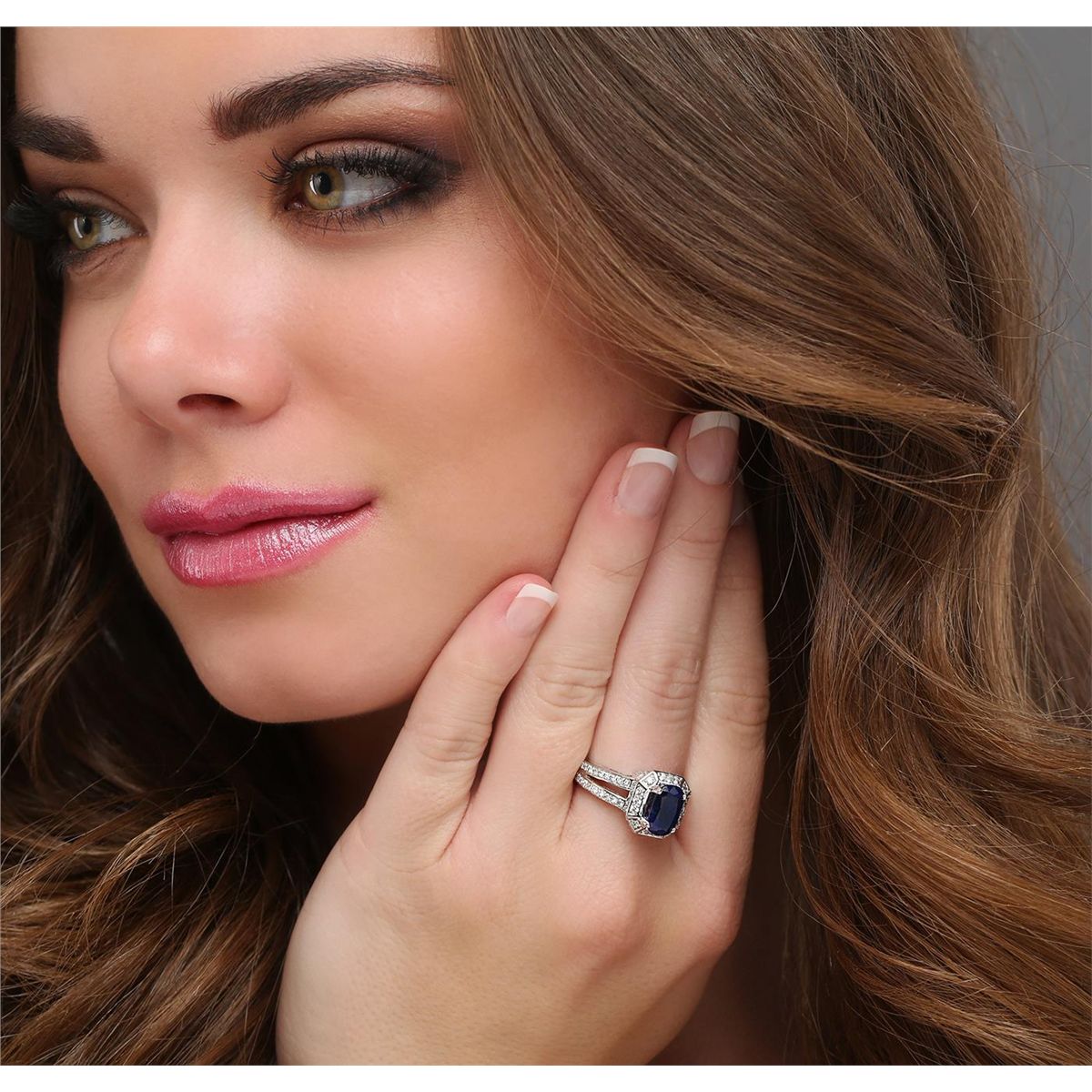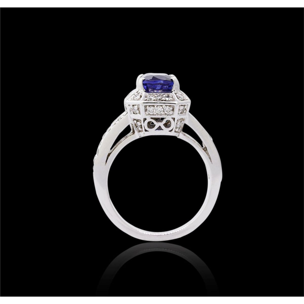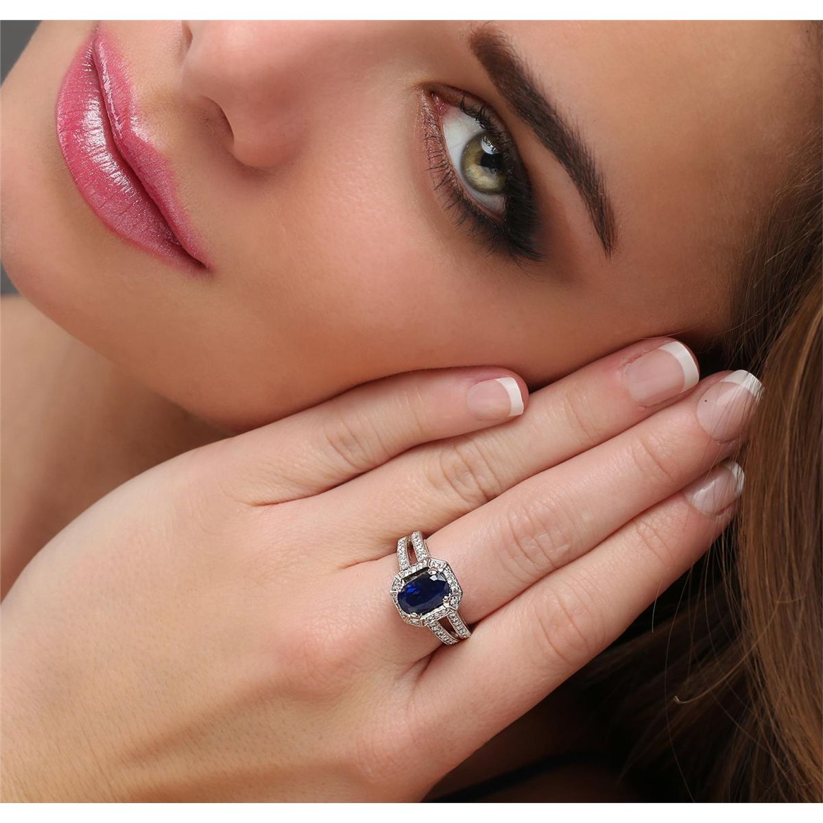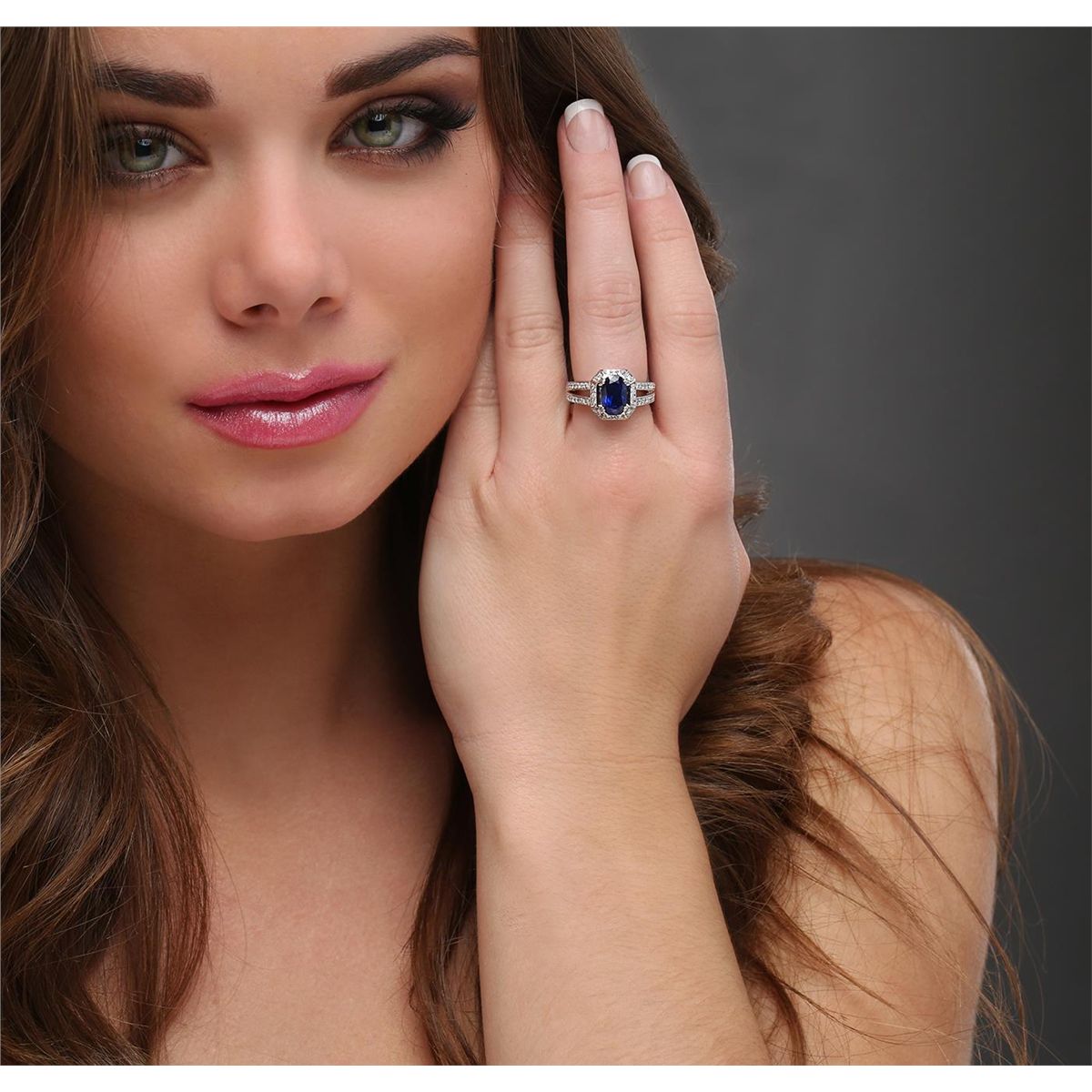 One electronically tested 14KT white gold ladies cast sapphire and diamond ring. The featured sapphire is set within a diamond bezel supported by diamond set split shoulders, completed by a two millimeter wide band with milgrain detailing. Identified with markings of "14K". Condition is new, good workmanship. Containing: One prong set oval mixed cut natural blue sapphire, measuring 9.89 x 6.20 x 5.58mm, 6% bulge factor, approximate weight of 3.06ct., clarity is slightly included, type II, dark, moderately strong, blue color, (GIA B 7/4), cut is good. Transmitting light with a minimum of distortion, transparent. Naturally occurring internal & external characteristics are present. Indications of heating. GIA Sapphire Report attached. Graded in the GIA Laboratory, Report #2161665446.Seventy-Four prong set round brilliant cut diamonds, measuring 1.50 - 1.40 x 0.87mm (depth est.) approximate total weight of 74 Stones = 0.92ct. Graded in the setting. Clarity: SI-1 to I-1. Color: G - I. Total Weight of Colored Stones 3.06ct. Total Weight of Diamonds 0.92ct. Total Weight of Ring 9.06 grams. AIG Appraised at $10,360.00.