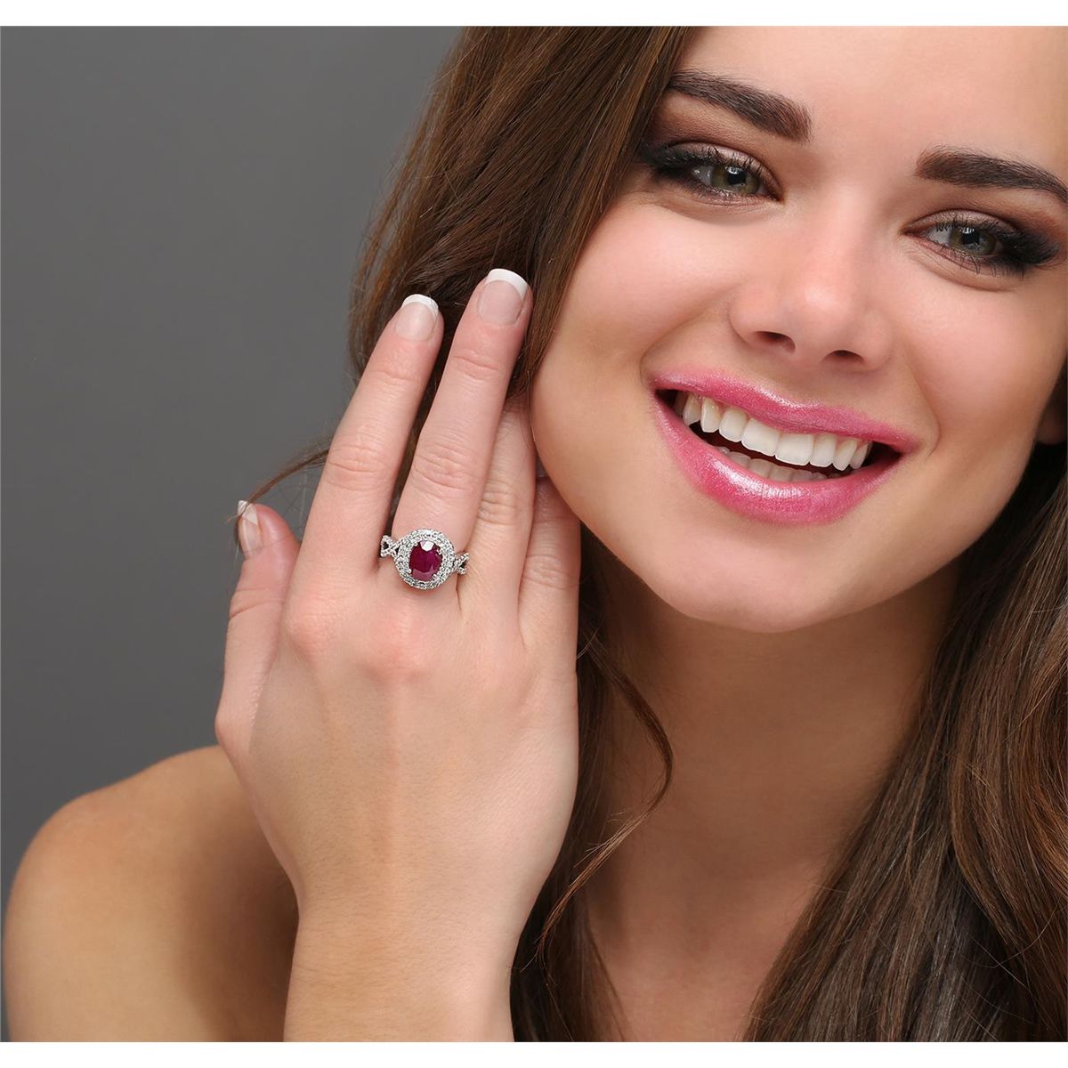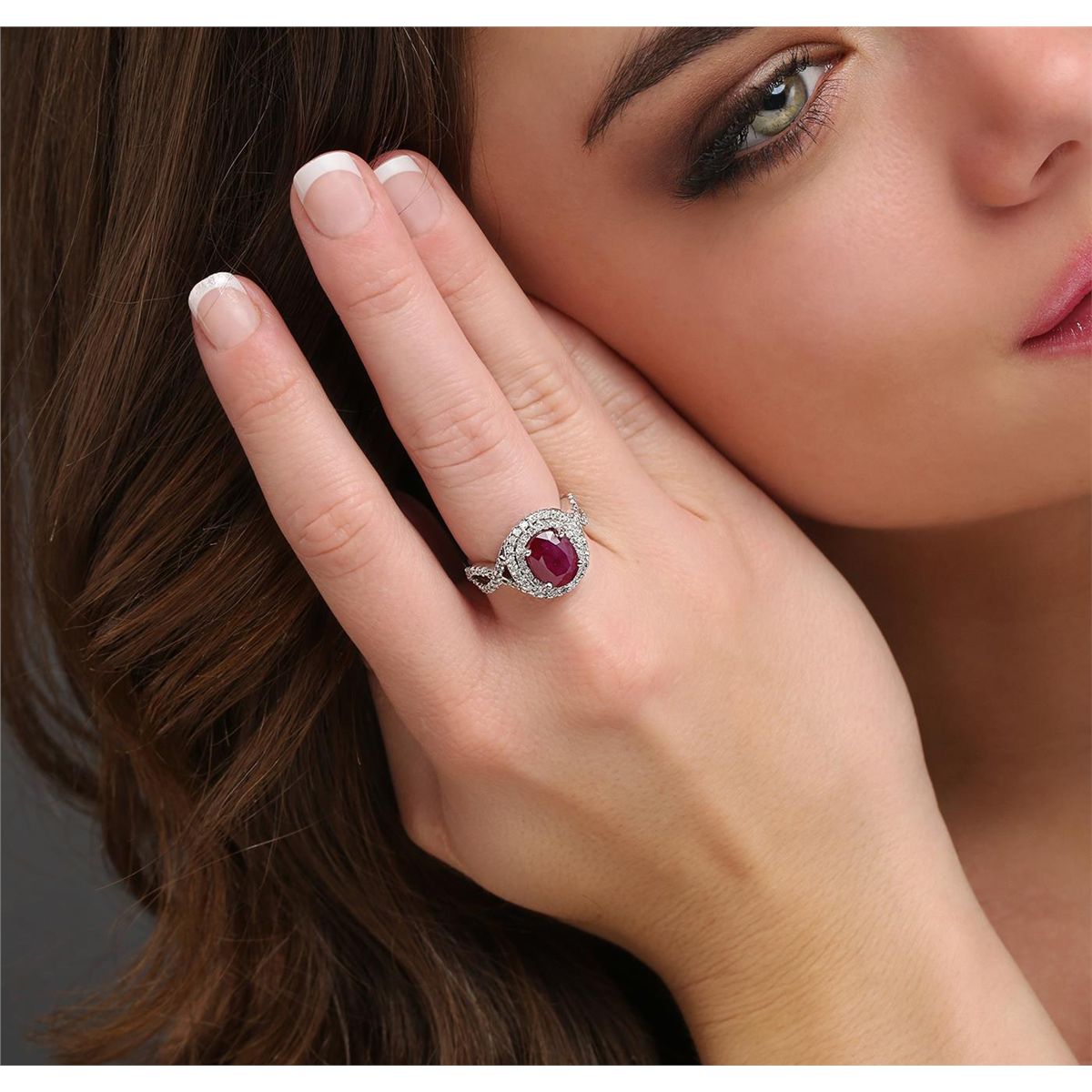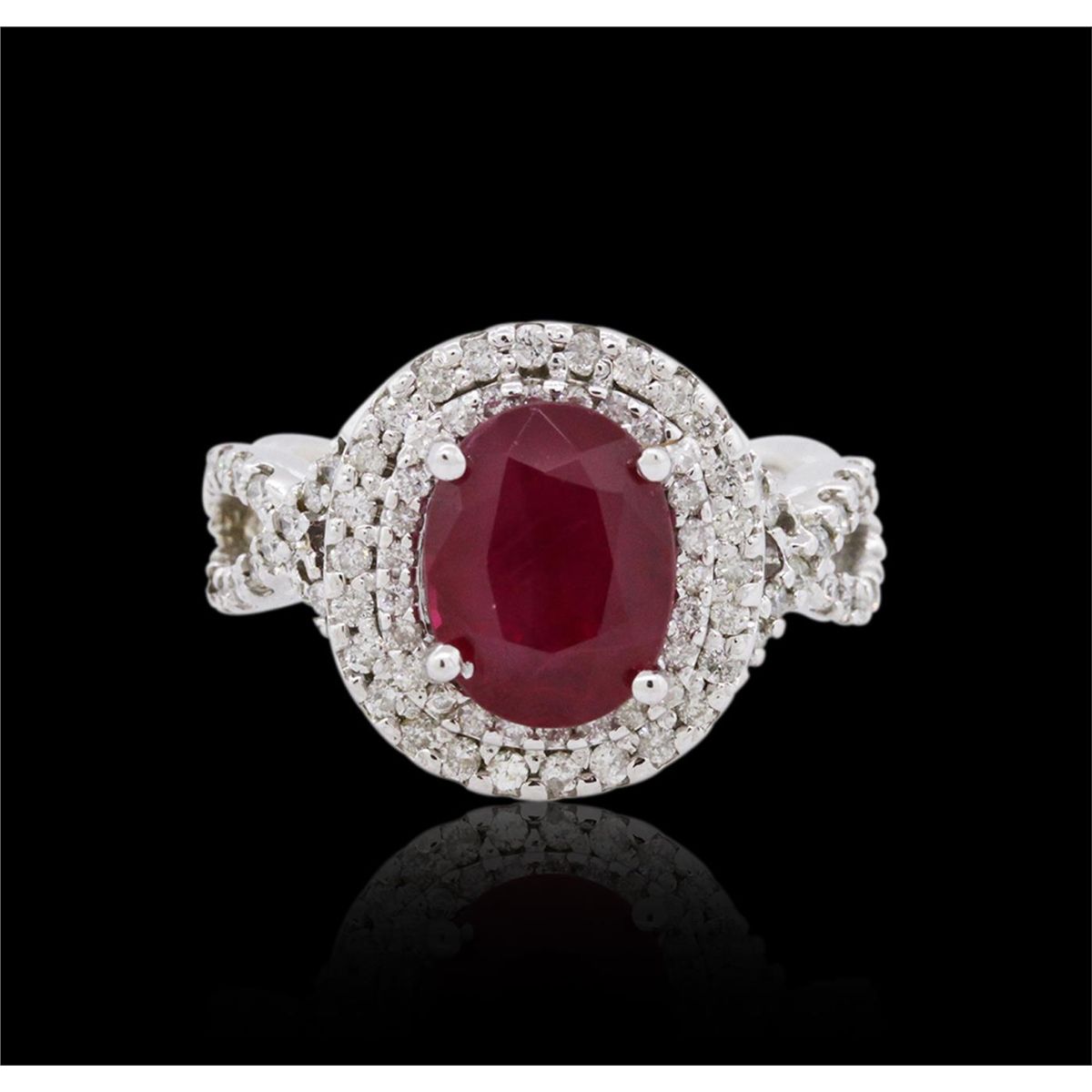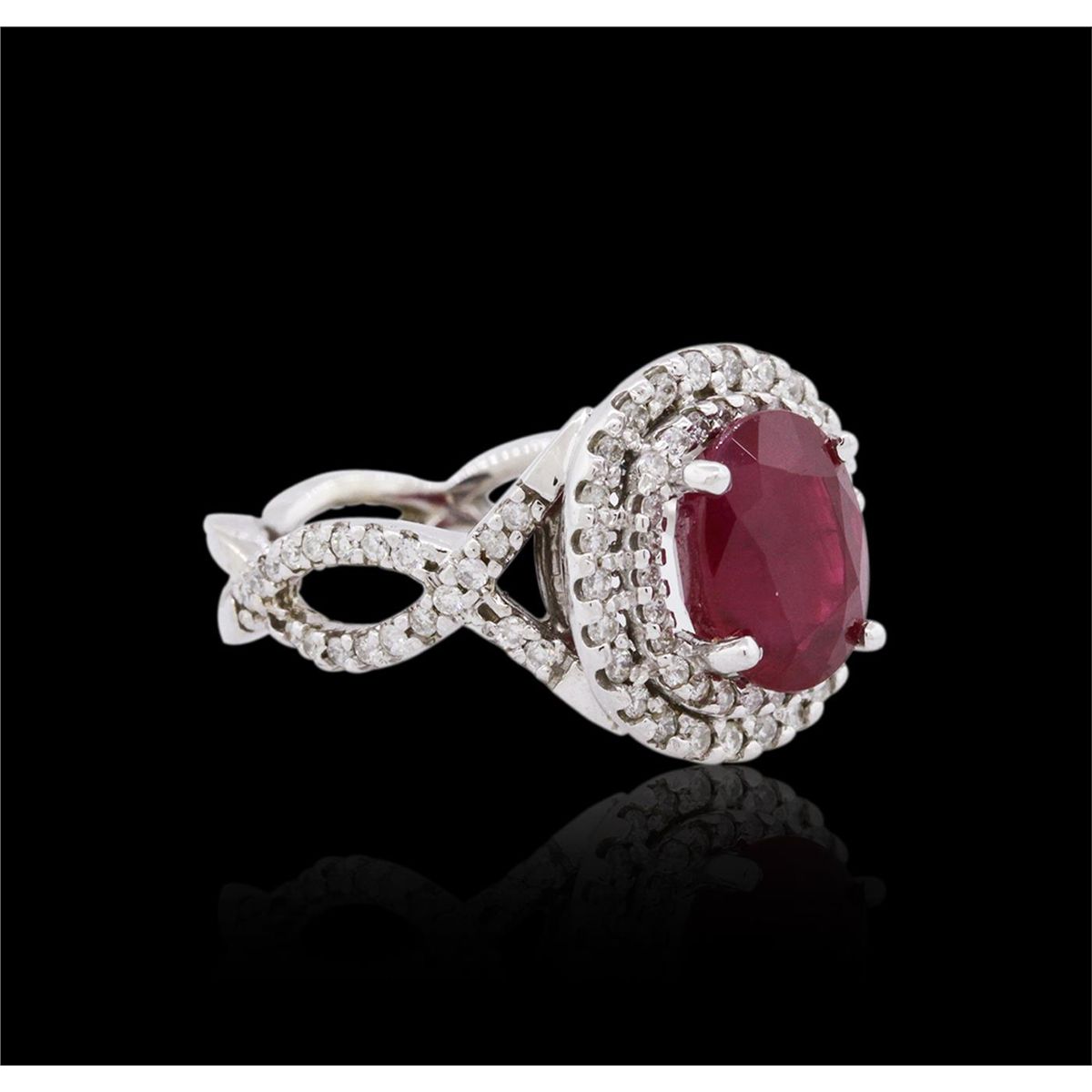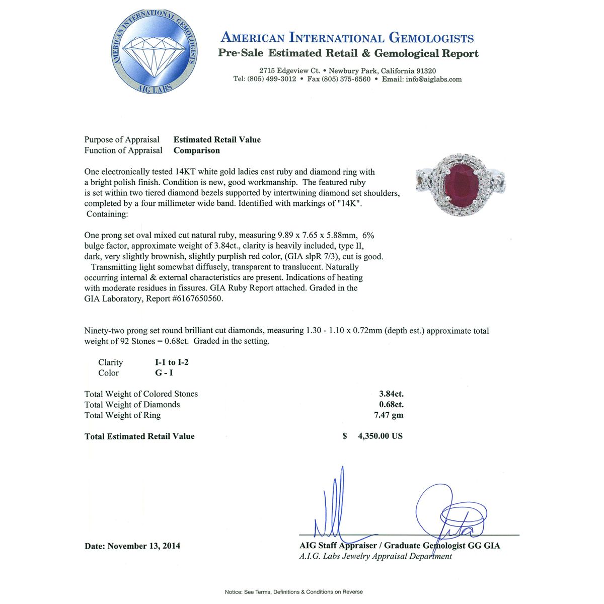 One electronically tested 14KT white gold ladies cast ruby and diamond ring with a bright polish finish. The featured ruby is set within two tiered diamond bezels supported by intertwining diamond set shoulders, completed by a four millimeter wide band. Identified with markings of "14K". Condition is new, good workmanship. Containing: One prong set oval mixed cut natural ruby, measuring 9.89 x 7.65 x 5.88mm, 6% bulge factor, approximate weight of 3.84ct., clarity is heavily included, type II, dark, very slightly brownish, slightly purplish red color, (GIA slpR 7/3), cut is good. Transmitting light somewhat diffusely, transparent to translucent. Naturally occurring internal & external characteristics are present. Indications of heating with moderate residues in fissures. GIA Ruby Report attached. Graded in the GIA Laboratory, Report #6167650560.Ninety-Two prong set round brilliant cut diamonds, measuring 1.30 - 1.10 x 0.72mm (depth est.) approximate total weight of 92 Stones = 0.68ct. Graded in the setting. Clarity: I-1 to I-2. Color: G - I. Total Weight of Colored Stones 3.84ct. Total Weight of Diamonds 0.68ct. Total Weight of Ring 7.47 grams. AIG Appraised at $4,350.00.