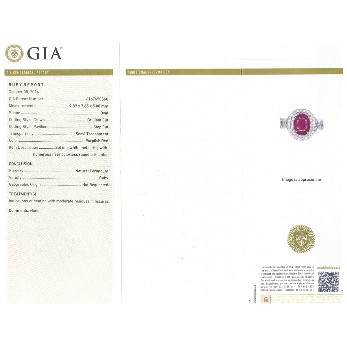 One electronically tested 14KT white gold ladies cast ruby and diamond ring with a bright polish finish. The featured ruby is set within two tiered diamond bezels supported by intertwining diamond set shoulders, completed by a four millimeter wide band. Identified with markings of "14K". Condition is new, good workmanship. Containing: One prong set oval mixed cut natural ruby, measuring 9.89 x 7.65 x 5.88mm, 6% bulge factor, approximate weight of 3.84ct., clarity is heavily included, type II, dark, very slightly brownish, slightly purplish red color, (GIA slpR 7/3), cut is good. Transmitting light somewhat diffusely, transparent to translucent. Naturally occurring internal & external characteristics are present. Indications of heating with moderate residues in fissures. GIA Ruby Report attached. Graded in the GIA Laboratory, Report #6167650560.Ninety-Two prong set round brilliant cut diamonds, measuring 1.30 - 1.10 x 0.72mm (depth est.) approximate total weight of 92 Stones = 0.68ct. Graded in the setting. Clarity: I-1 to I-2. Color: G - I. Total Weight of Colored Stones 3.84ct. Total Weight of Diamonds 0.68ct. Total Weight of Ring 7.47 grams. AIG Appraised at $4,350.00.