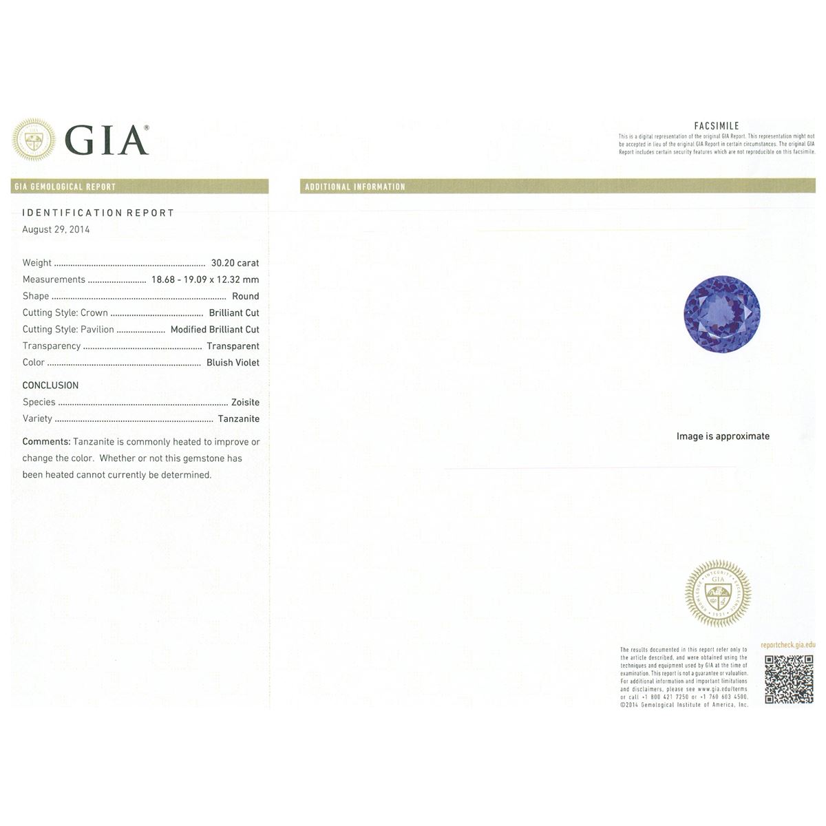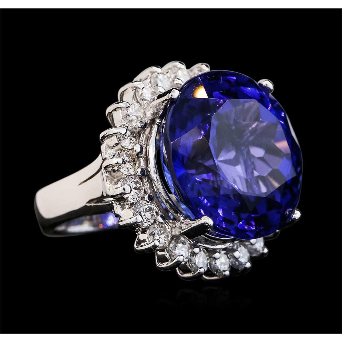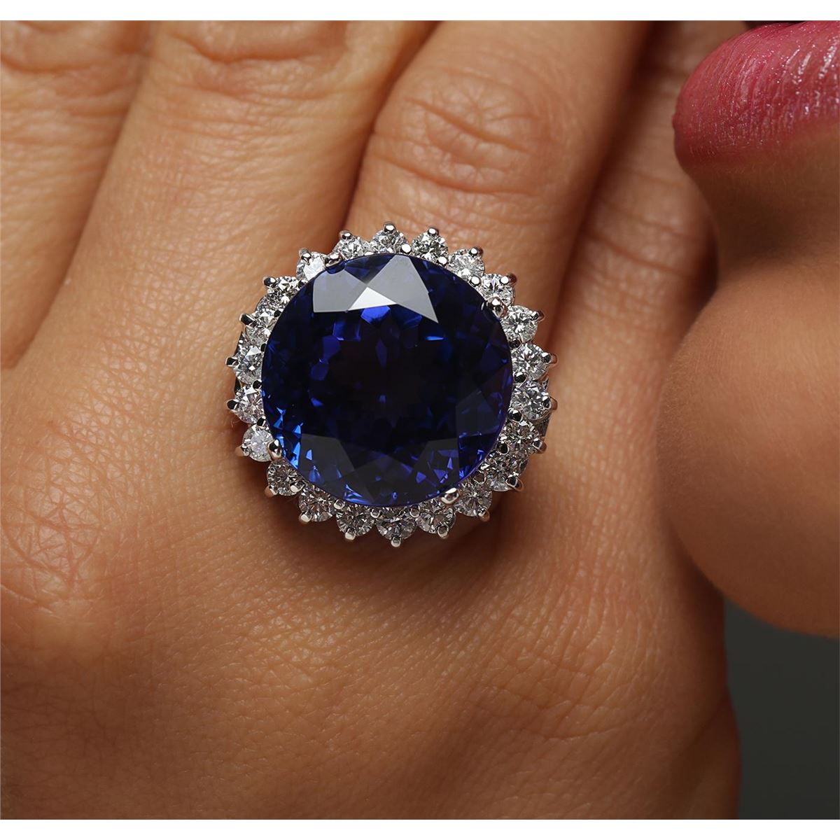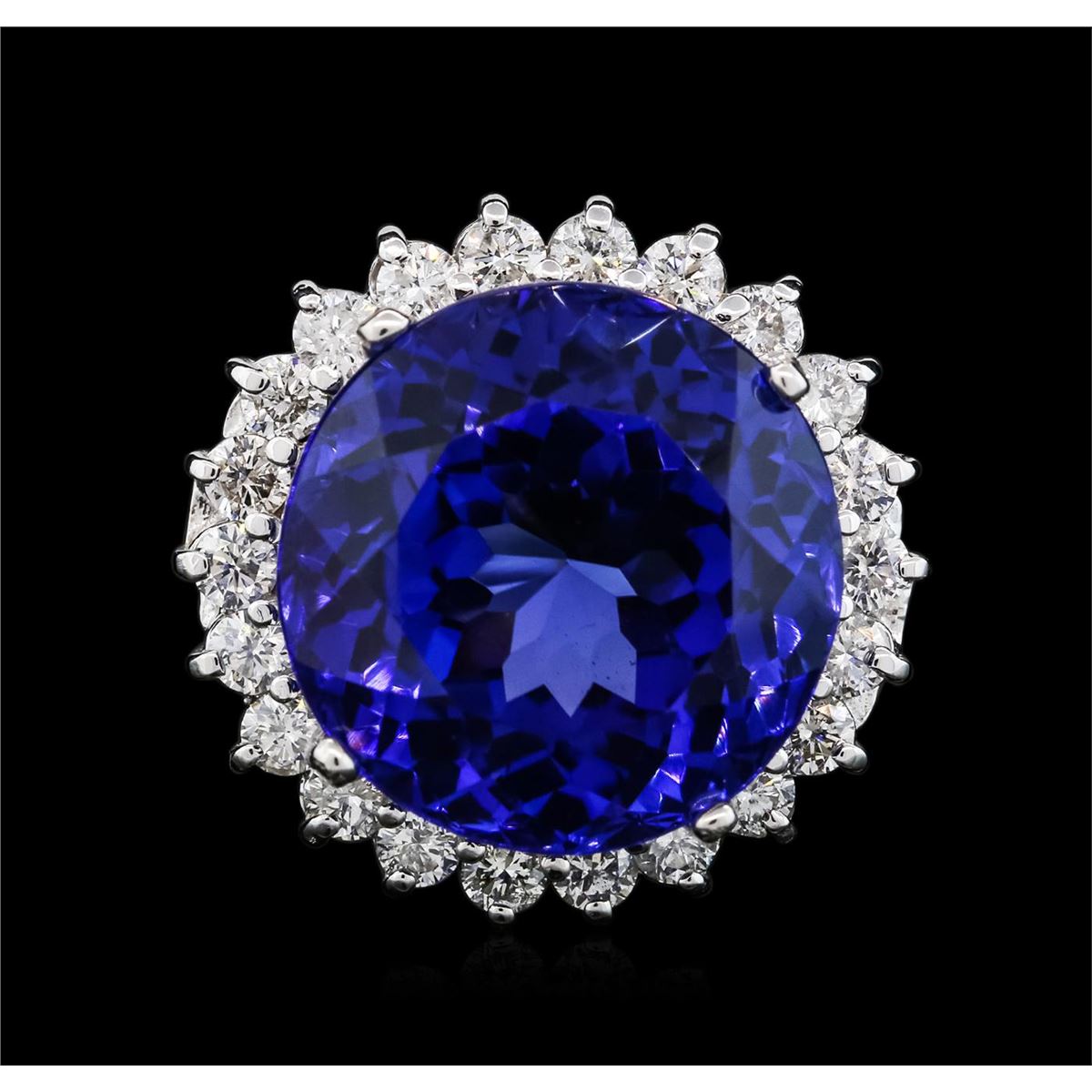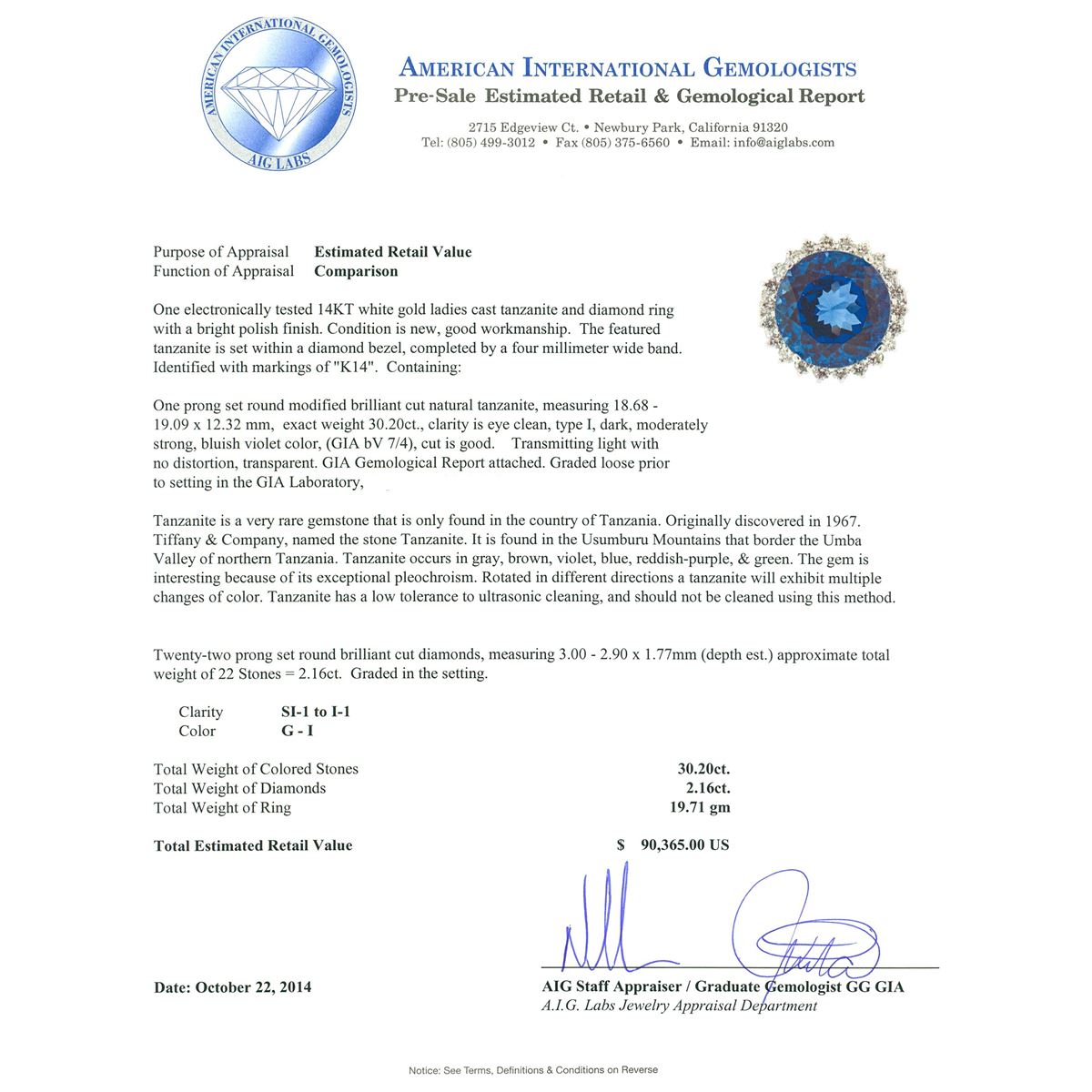One electronically tested 14KT white gold ladies cast tanzanite and diamond ring with a bright polish finish. The featured tanzanite is set within a diamond bezel, completed by a four millimeter wide band. Identified with markings of "K14". Condition is new, good workmanship. Containing: One prong set round modified brilliant cut natural tanzanite, measuring 18.68 - 19.09 x 12.32 mm, exact weight 30.20ct., clarity is eye clean, type I, dark, moderately strong, bluish violet color, (GIA bV 7/4), cut is good. Transmitting light with no distortion, transparent. GIA Gemological Report attached. Graded loose prior to setting in the GIA Laboratory, Report #1166542850.Tanzanite is a very rare gemstone that is only found in the country of Tanzania. Originally discovered in 1967. Tiffany & Company, named the stone Tanzanite. It is found in the Usumburu Mountains that border the Umba Valley of northern Tanzania. Tanzanite occurs in gray, brown, violet, blue, reddish-purple, & green. The gem is interesting because of its exceptional pleochroism. Rotated in different directions a tanzanite will exhibit multiple changes of color. Tanzanite has a low tolerance to ultrasonic cleaning, and should not be cleaned using this method. Twenty-Two prong set round brilliant cut diamonds, measuring 3.00 - 2.90 x 1.77mm (depth est.) approximate total weight of 22 Stones = 2.16ct. Graded in the setting. Clarity: SI-1 to I-1. Color: G - I. Total Weight of Colored Stones 30.20ct. Total Weight of Diamonds 2.16ct. Total Weight of Ring 19.71 grams. AIG Appraised at $90,365.00.