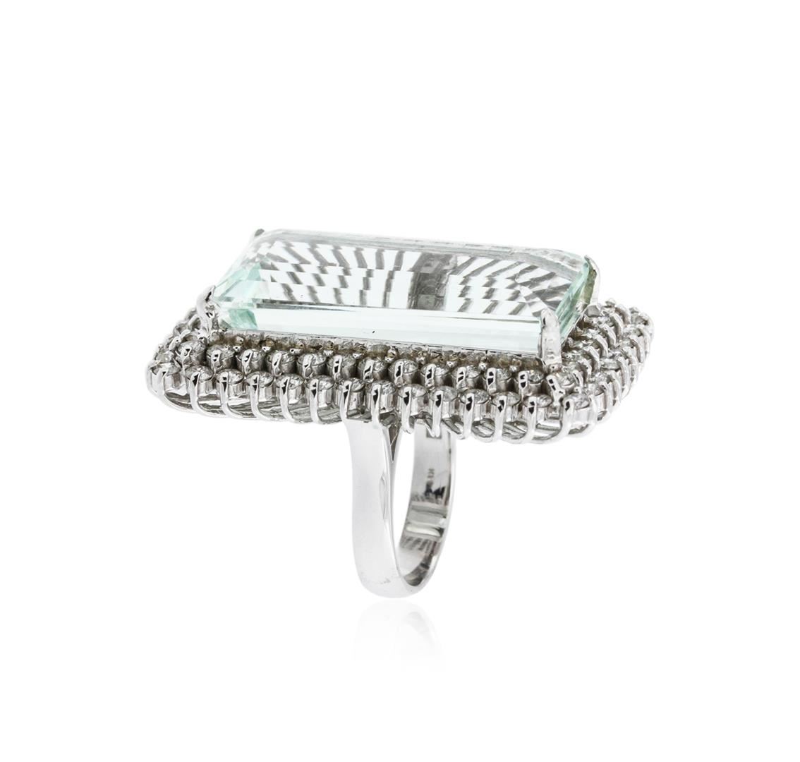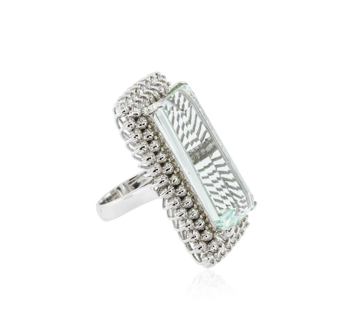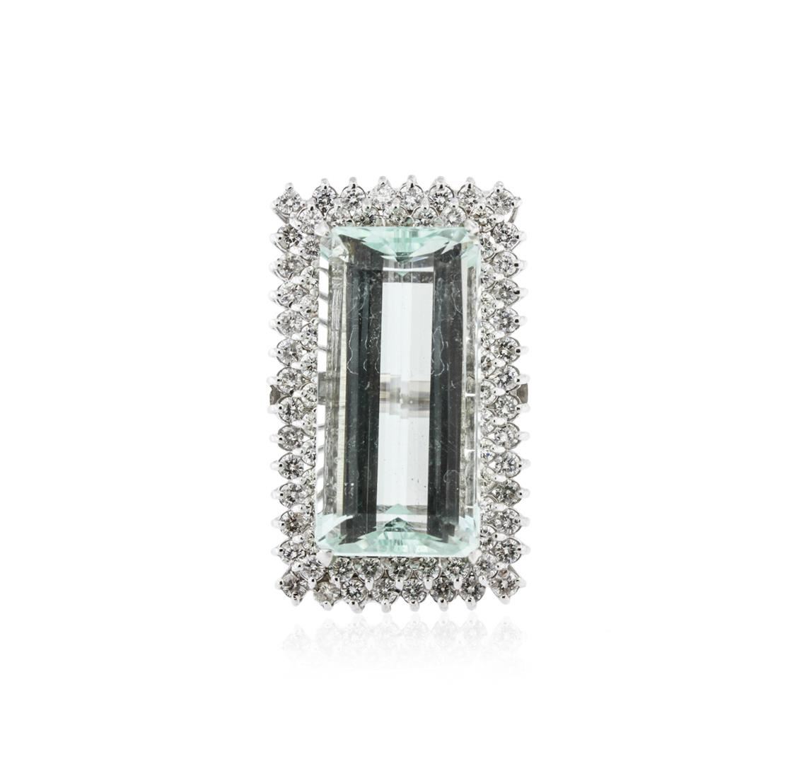 One electronically tested 14KT white gold ladies cast aquamarine and diamond ring with a bright polish finish. Condition is new, good workmanship. The featured aquamarine is set within two tiered diamond bezels, completed by a four millimeter wide band. Identified with markings of "K14". Containing: One prong set octagonal step cut natural aquamarine, measuring 30.20 x 15.12 x 10.46mm, exact weight 37.30ct., type I Clarity is slightly included, light, very slightly grayish, blue-green color, (GIA GB 3/3), cut is good. Transmitting light with a minimum of distortion, transparent. Naturally occurring internal & external characteristics are present. GIA Gemological Report attached. Graded loose prior to setting in the GIA Laboratory, Report #2161001546.Seventy-Six prong set round brilliant cut diamonds, measuring 2.60 - 2.50 x 1.53mm (depth est.) approximate total weight of 76 Stones = 4.70ct. Graded in the setting. Clarity: SI-1 to I-1. Color: G - I. Total Weight of Colored Stones 37.30ct. Total Weight of Diamonds 4.70ct. Total Weight of Ring 25.14 grams. AIG Appraised at $35,400.00.
