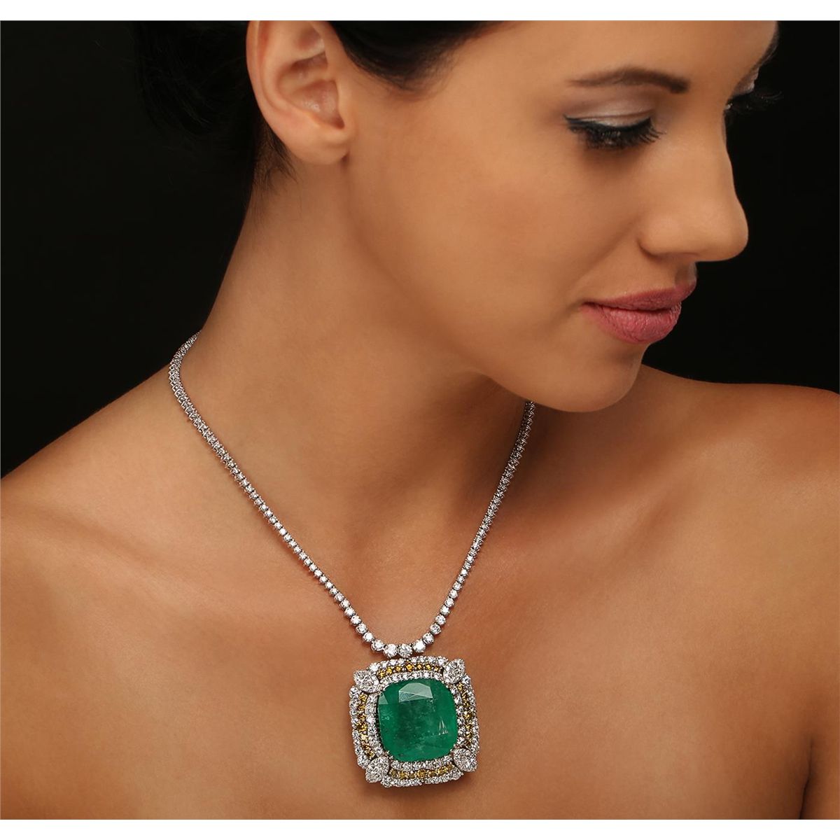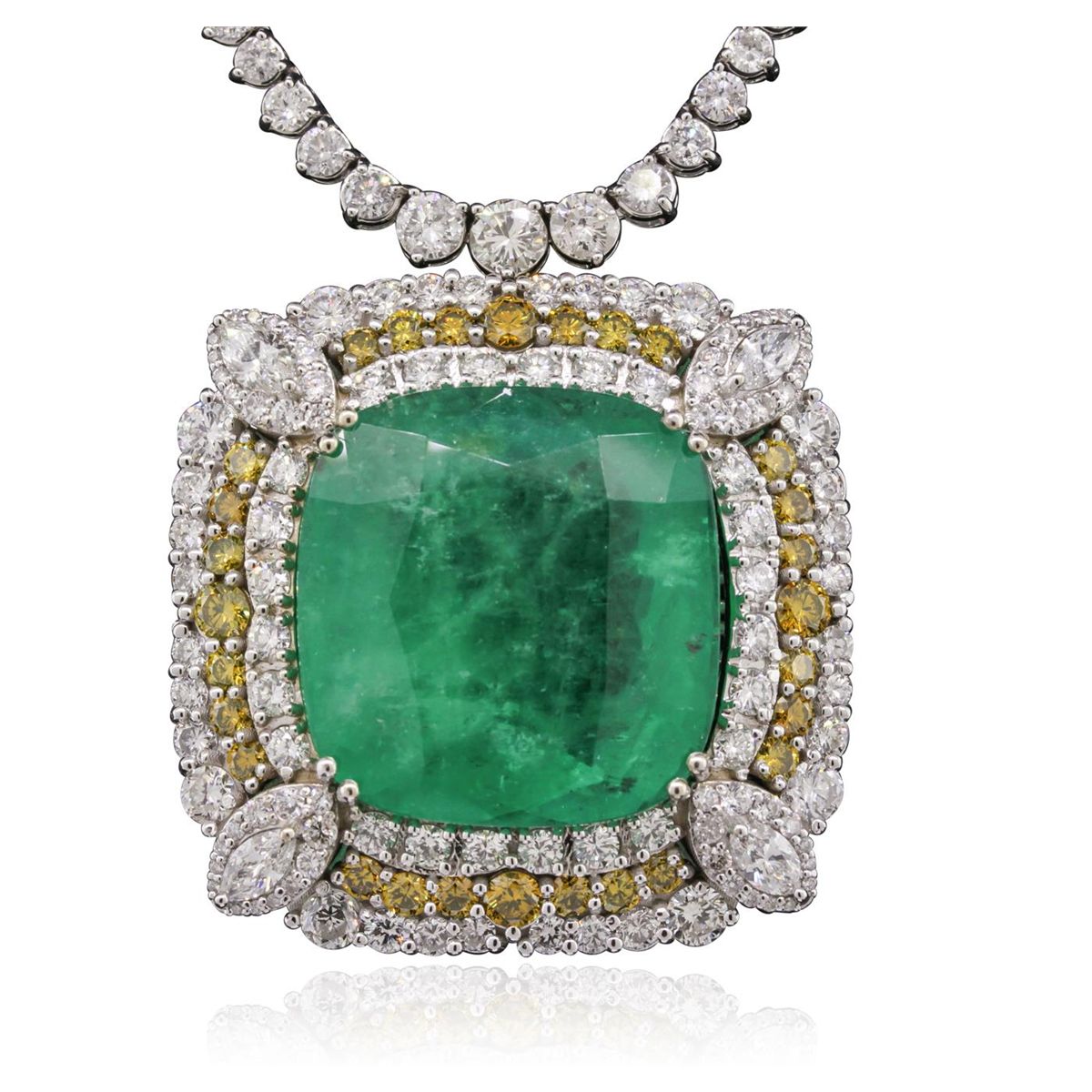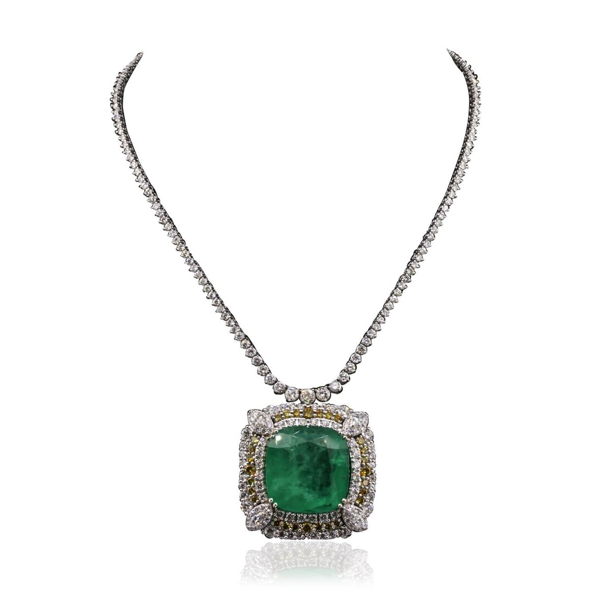 One electronically tested 14KT white gold ladies cast & assembled emerald and diamond necklace with a bright polish finish. Condition is new, good workmanship. The necklace features a pendant consisting of an emerald set within multiple diamond bezels supported by a tapering flexible diamond ribbon, terminating in a concealed clasp with safety bar. Identified with markings of "14K". Containing: One prong set cushion modified brilliant cut natural emerald, measuring 26.42 x 25.37 x 12.95mm, exact weight 59.23ct., clarity is heavily included, type III, medium dark, moderately strong, green color, (GIA G 6/4), cut is good. Transmitting light somewhat diffusely, transparent to translucent. Naturally occurring internal & external characteristics are present. Indications of oil residue GIA Gemological Report attached. Graded loose prior to setting in the GIA Laboratory, Report #1166211819. Twenty-Eight prong set round brilliant cut diamonds, measuring 3.70 - 3.00 x 2.01mm (depth est.) approximate total weight of 28 Stones = 3.06ct. Color grade is an average for the group. Indications of laboratory irradiated enhanced color. Graded in the setting. Clarity: VS-1 to VS-2 Four prong set marquise shaped cut diamonds, measuring 6.00 x 3.30 x 2.08mm (depth est.) approximate total weight of 4 Stones = 1.05ct. Graded in the setting. Clarity: SI-1 to SI-2. Color: G - I Three prong set round brilliant cut diamonds, measuring 4.70 - 4.10 x 2.64mm (depth est.) approximate total weight of 3 Stones = 1.03ct. The clarity grade reflects the entire range of clarity for this group. Graded in the setting. Clarity: VS-2 to I-1. Color: H - J Eight prong set round brilliant cut diamonds, measuring 3.90 - 3.80 x 2.31mm (depth est.) approximate total weight of 8 Stones = 1.77ct. Graded in the setting. Clarity: VS-1 to SI-1. Color: G - I Fifty-Eight prong set round brilliant cut diamonds, measuring 2.90 - 2.70 x 1.68mm (depth est.) approximate total weight of 58 Stones = 4.75ct. Graded in the setting. Clarity: VS-1 to SI-1. Color: G - I Ninety-Two prong set round brilliant cut diamonds, measuring 2.30 - 2.00 x 1.29mm (depth est.) approximate total weight of 92 Stones = 3.44ct. The clarity grade reflects the entire range of clarity for this group. Graded in the setting. Clarity: VS-2 to I-1. Color: G - I Eighty-Eight prong set round brilliant cut diamonds, measuring 1.90 - 1.70 x 1.08mm (depth est.) approximate total weight of 88 Stones = 1.97ct. Graded in the setting. Clarity: SI-1 to I-1. Color: G - I Twenty-Four prong set round brilliant cut diamonds, measuring 1.10 - 1.00 x 0.63mm (depth est.) approximate total weight of 24 Stones = 0.15ct. Graded in the setting. Clarity: VS-2 to SI-1. Color: G - I. Total Weight of Colored Stones 59.23ct. Total Weight of Diamonds 17.22ct. Total Weight of Necklace 57.87 grams. AIGAppraised at $288,625.00.