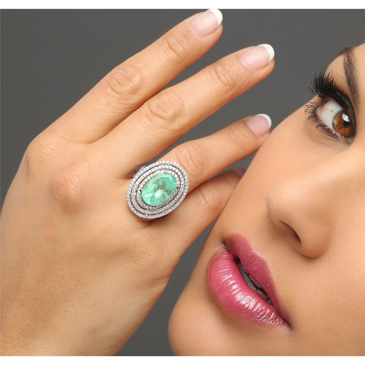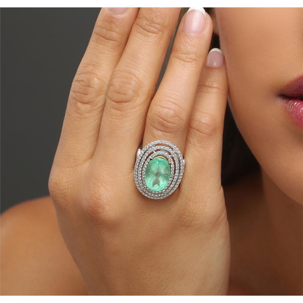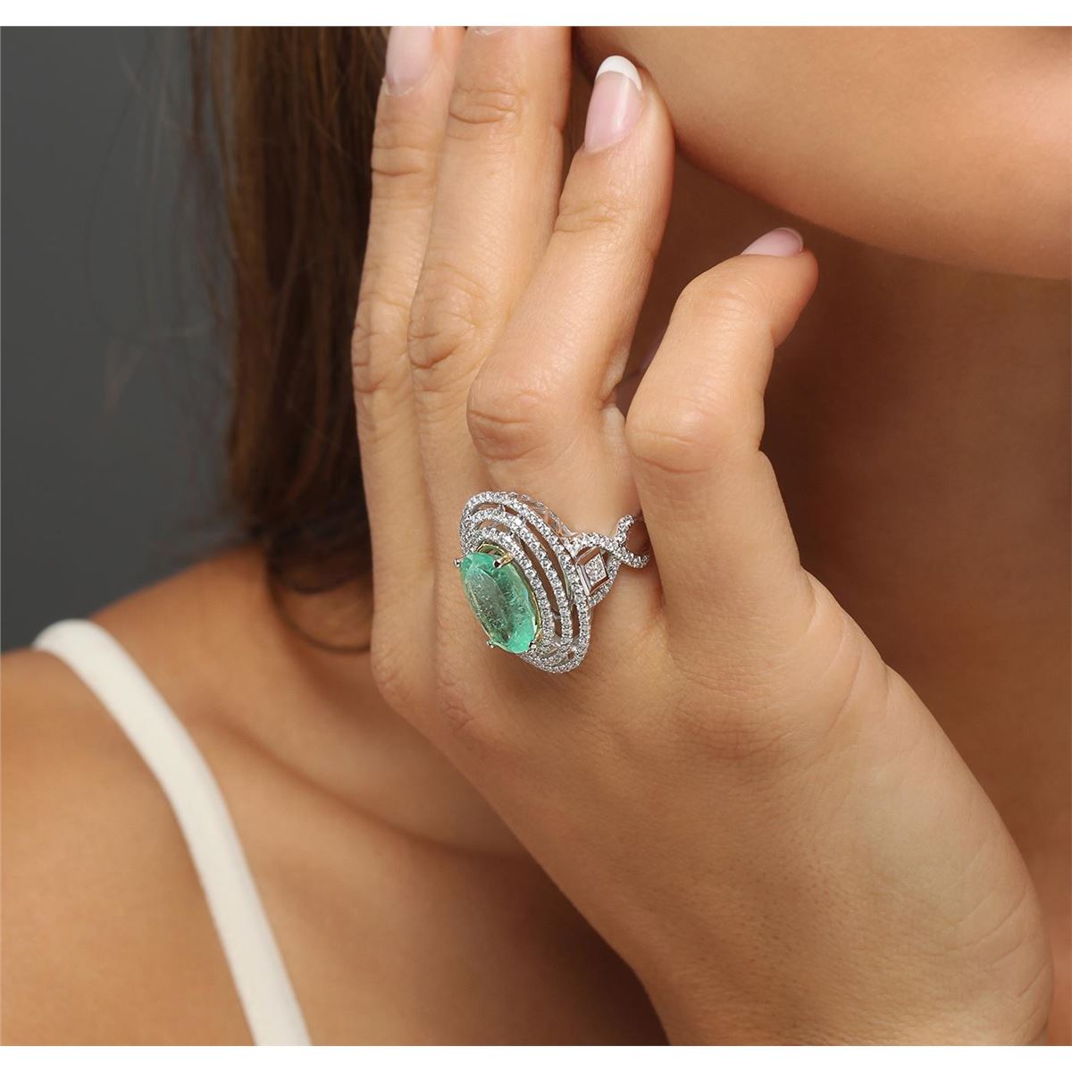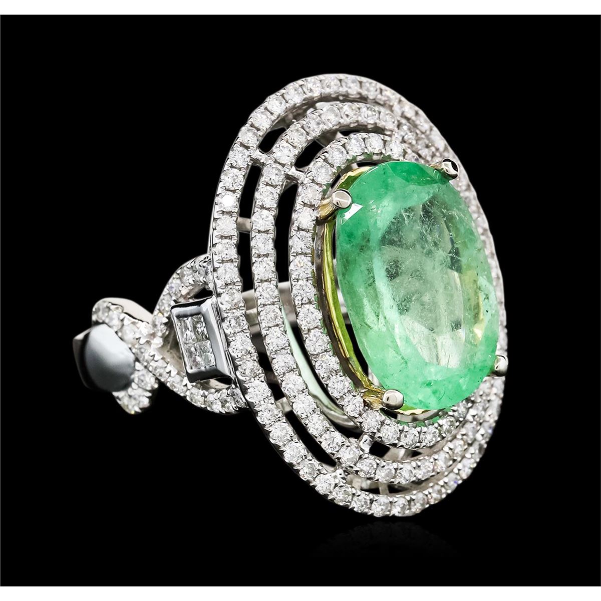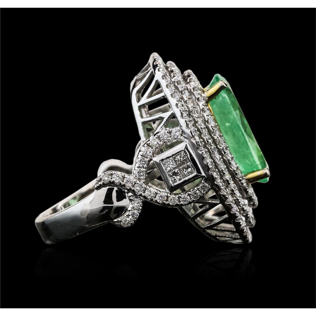 One electronically tested 14KT white gold ladies cast emerald and diamond ring with a bright polish finish. The featured emerald is set within tiered diamond bezels supported by intertwining diamond set shoulders, completed by a three and one-half millimeter wide band. Identified with markings of 14K. Condition is new, good workmanship. Containing: One prong set oval modified brilliant cut natural emerald, measuring 15.04 x 10.54 x 7.07mm, exact weight 6.28ct., clarity is heavily included, type III, medium, moderately strong, green color, (GIA G 5/4), cut is good. Transmitting light somewhat diffusely, transparent to translucent. Naturally occurring internal & external characteristics are present. Indications of clarity enhancement. GIA Gemological Report attached. Graded loose prior to setting in the GIA Laboratory, Report #1166542623.One Hundred Sixty-Two post set round brilliant cut diamonds, measuring 1.30 - 1.20 x 0.75mm (depth est.) approximate total weight of 162 Stones = 1.25ct. Graded in the setting. Clarity: SI-2 to I-2. Color: G - I Eight invisible set princess cut diamonds, measuring 1.80 x 1.80 x 1.35mm (depth est.) approximate total weight of 8 Stones = 0.35ct. Graded in the setting. Clarity: SI-2 to I-1. Color: G - I. Total Weight of Colored Stones 6.28ct. Total Weight of Diamonds 1.60ct. Total Weight of Ring 10.54 grams. AIG Appraised at $18,510.00.