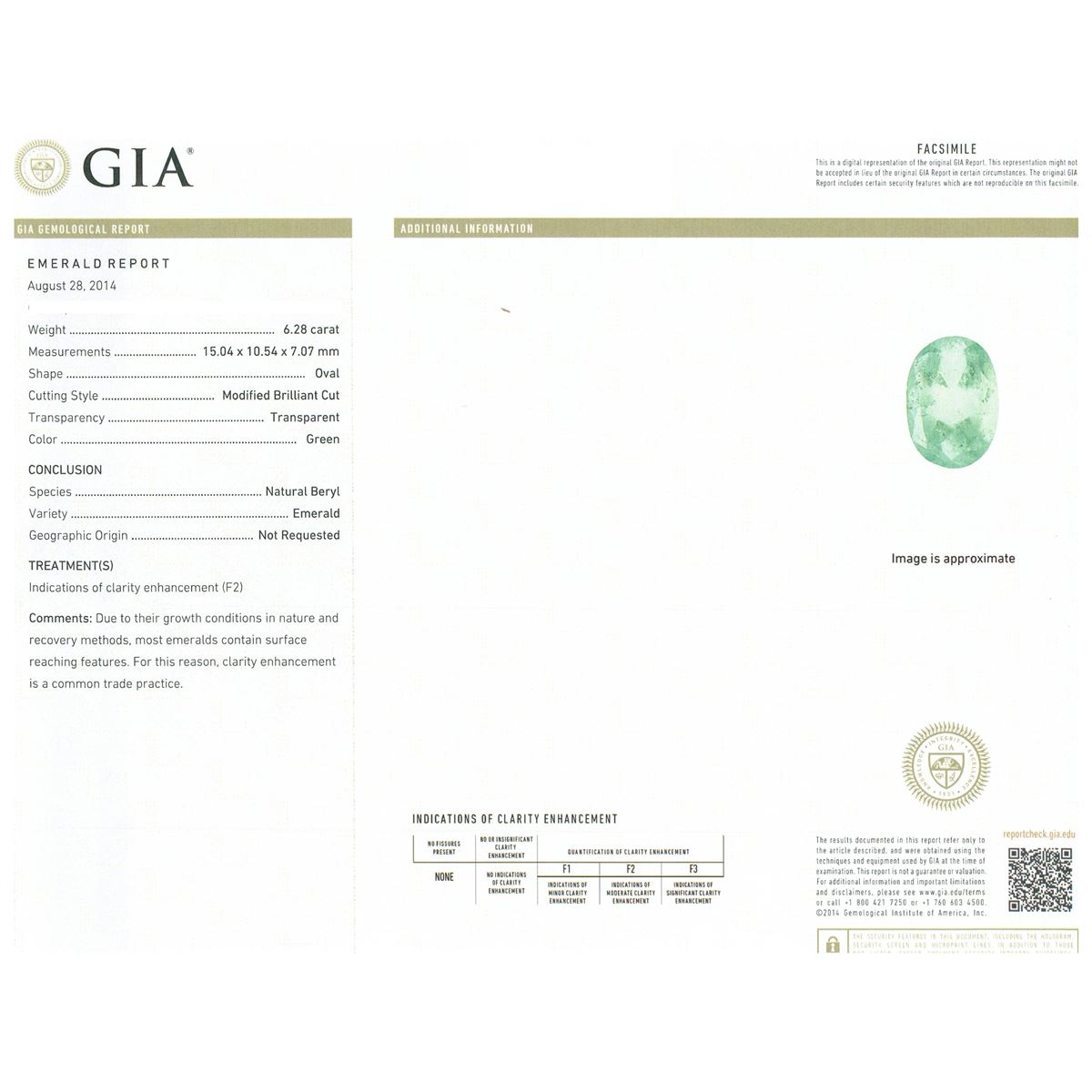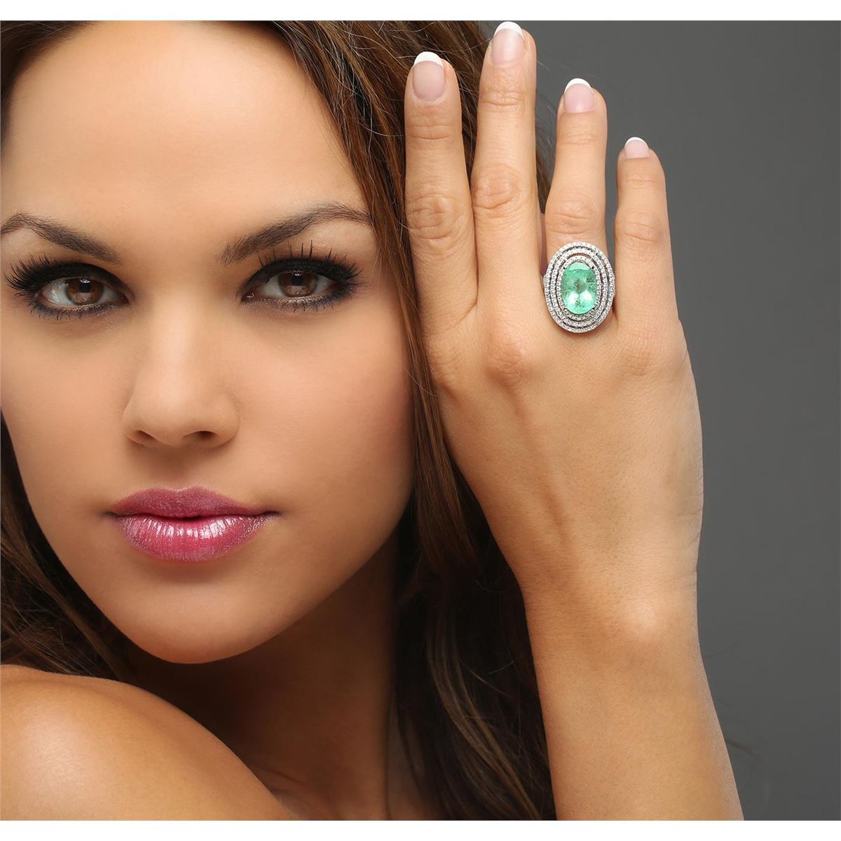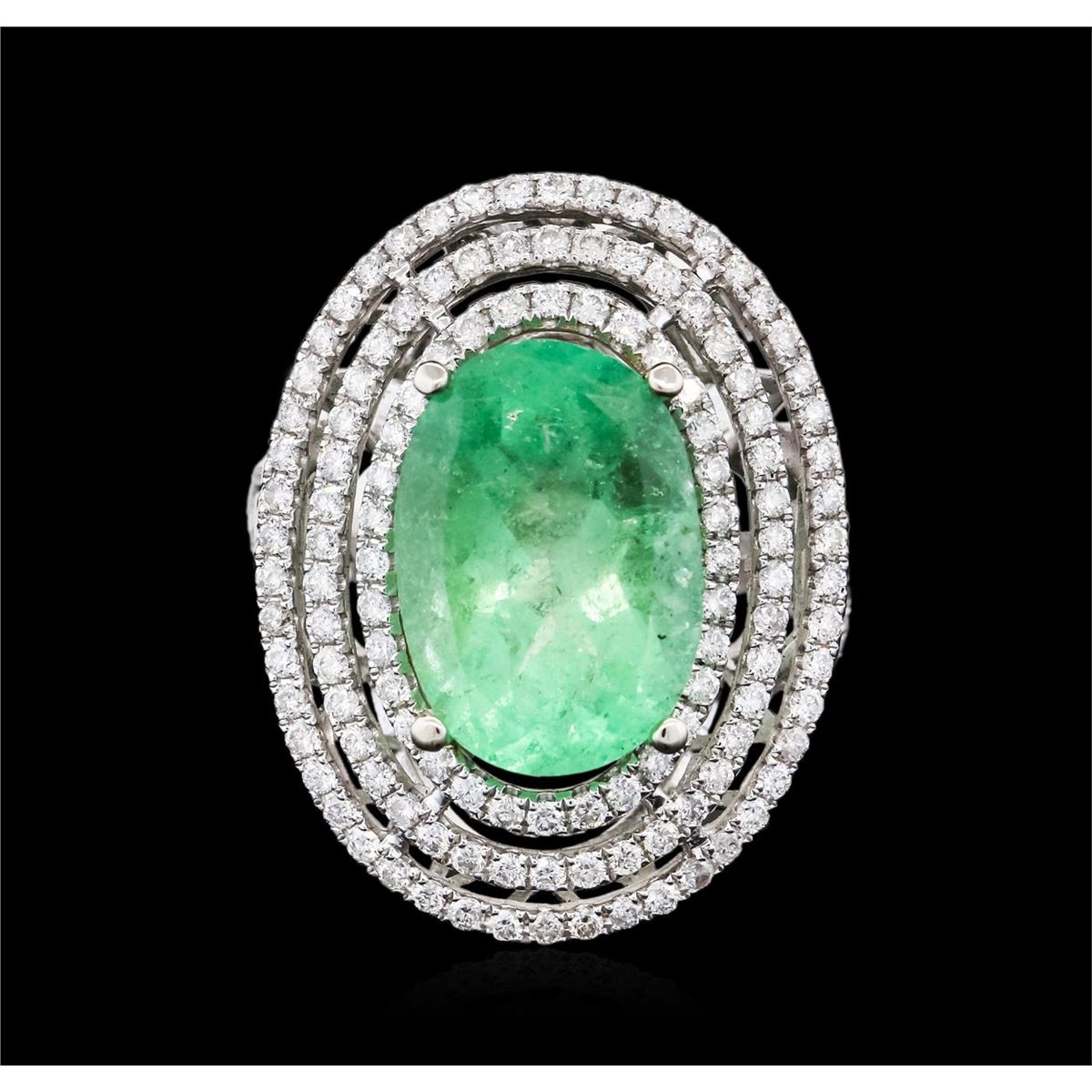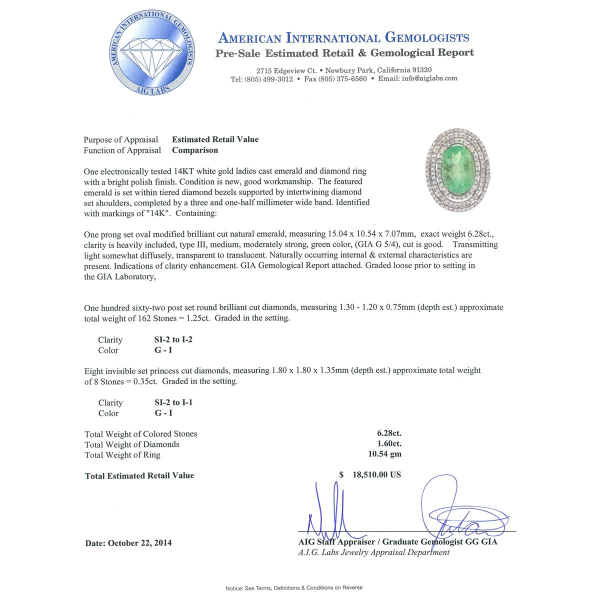 One electronically tested 14KT white gold ladies cast emerald and diamond ring with a bright polish finish. The featured emerald is set within tiered diamond bezels supported by intertwining diamond set shoulders, completed by a three and one-half millimeter wide band. Identified with markings of 14K. Condition is new, good workmanship. Containing: One prong set oval modified brilliant cut natural emerald, measuring 15.04 x 10.54 x 7.07mm, exact weight 6.28ct., clarity is heavily included, type III, medium, moderately strong, green color, (GIA G 5/4), cut is good. Transmitting light somewhat diffusely, transparent to translucent. Naturally occurring internal & external characteristics are present. Indications of clarity enhancement. GIA Gemological Report attached. Graded loose prior to setting in the GIA Laboratory, Report #1166542623.One Hundred Sixty-Two post set round brilliant cut diamonds, measuring 1.30 - 1.20 x 0.75mm (depth est.) approximate total weight of 162 Stones = 1.25ct. Graded in the setting. Clarity: SI-2 to I-2. Color: G - I Eight invisible set princess cut diamonds, measuring 1.80 x 1.80 x 1.35mm (depth est.) approximate total weight of 8 Stones = 0.35ct. Graded in the setting. Clarity: SI-2 to I-1. Color: G - I. Total Weight of Colored Stones 6.28ct. Total Weight of Diamonds 1.60ct. Total Weight of Ring 10.54 grams. AIG Appraised at $18,510.00.
