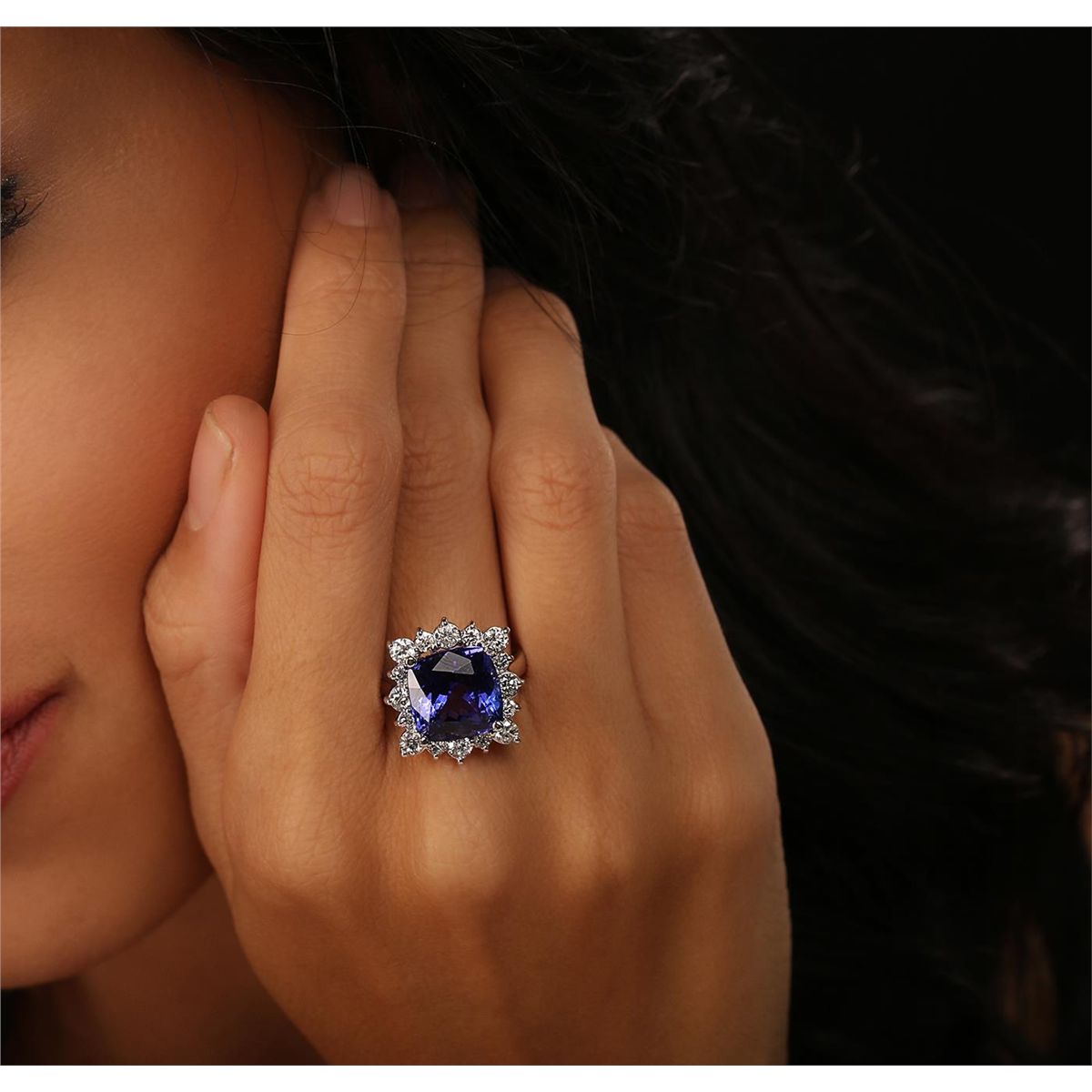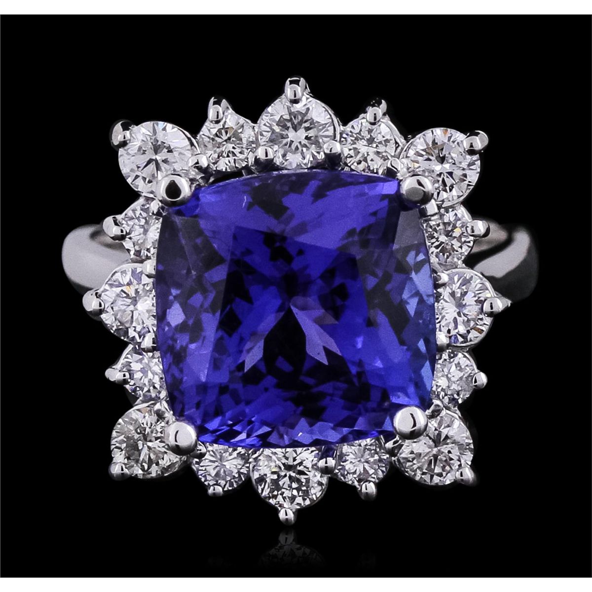 One electronically tested 14KT white gold ladies cast tanzanite and diamond ring with a bright polish finish. Condition is new, good workmanship. The featured tanzanite is set within a diamond lattice gallery, completed by a two and one-half millimeter wide band. Identified with markings of "K14". Containing: One prong set square cushion modified brilliant cut natural tanzanite, measuring 11.25 x 11.20 x 7.90mm, exact weight 7.53ct., clarity is eye clean, type I, medium dark, moderately strong, bluish violet color, (GIA bV 6/4), cut is good. Transmitting light with no distortion, transparent. GIA Gemological Report attached. Graded loose prior to setting in the GIA Laboratory, Report # 6167097858.Tanzanite is a very rare gemstone that is only found in the country of Tanzania. Originally discovered in 1967. Tiffany & Company, named the stone Tanzanite. It is found in the Usumburu Mountains that border the Umba Valley of northern Tanzania. Tanzanite occurs in gray, brown, violet, blue, reddish-purple, & green. The gem is interesting because of its exceptional pleochroism. Rotated in different directions a tanzanite will exhibit multiple changes of color. Tanzanite has a low tolerance to ultrasonic cleaning, and should not be cleaned using this method. Sixteen prong set round brilliant cut diamonds, measuring 3.00 - 2.30 x 1.59mm (depth est.) approximate total weight of 16 Stones = 1.26ct. Graded in the setting. Clarity: SI-2 to I-1 . Color: F - H. Total Weight of Colored Stones 7.53ct. Total Weight of Diamonds 1.26ct. Total Weight of Ring 6.80 grams. AIGAppraised at $25,545.00.
