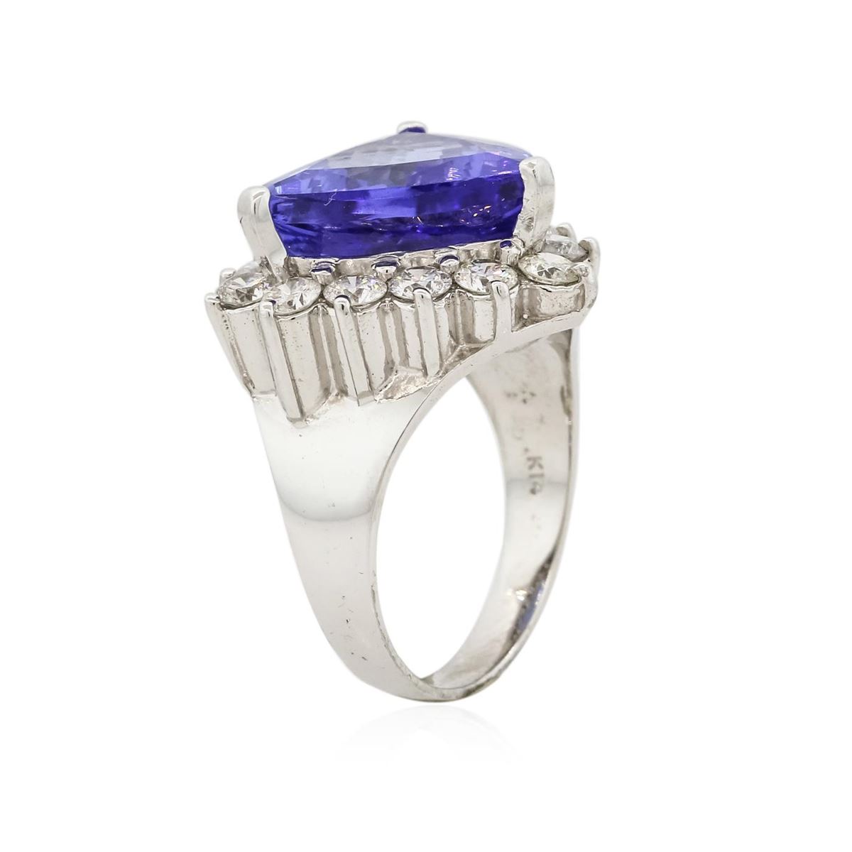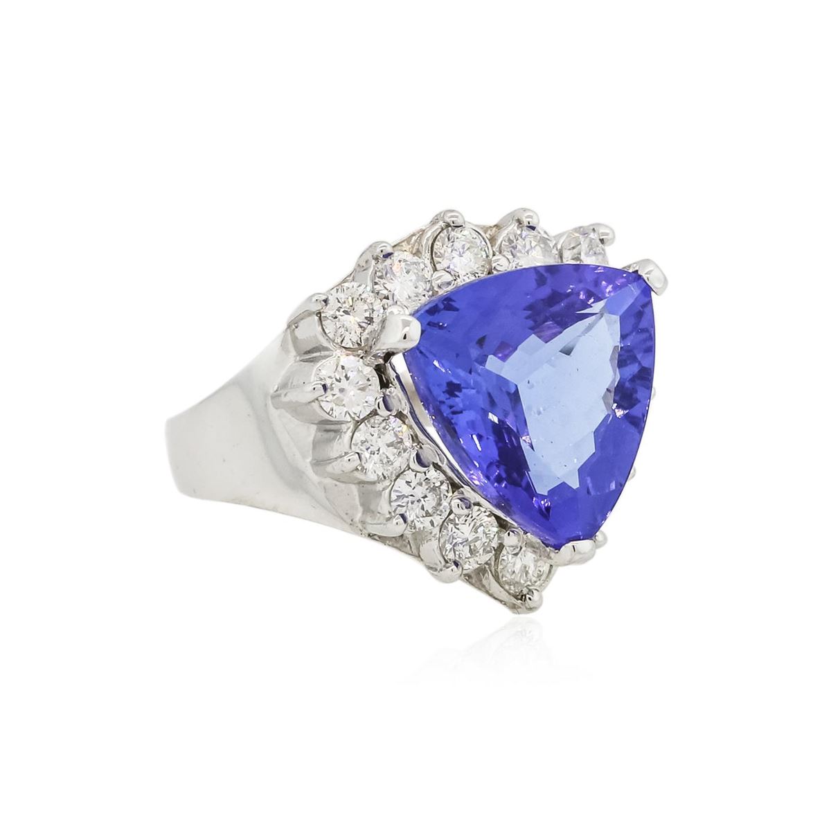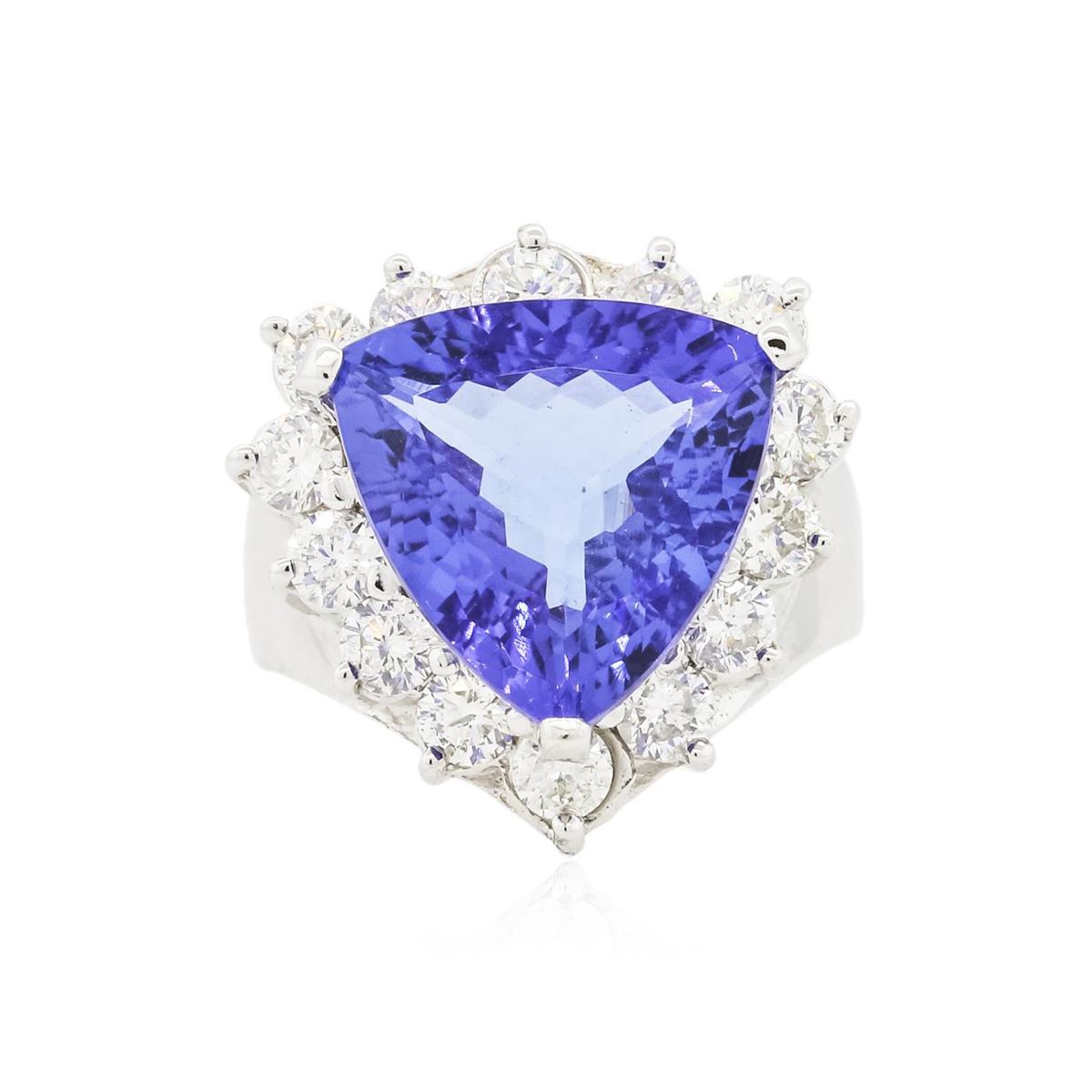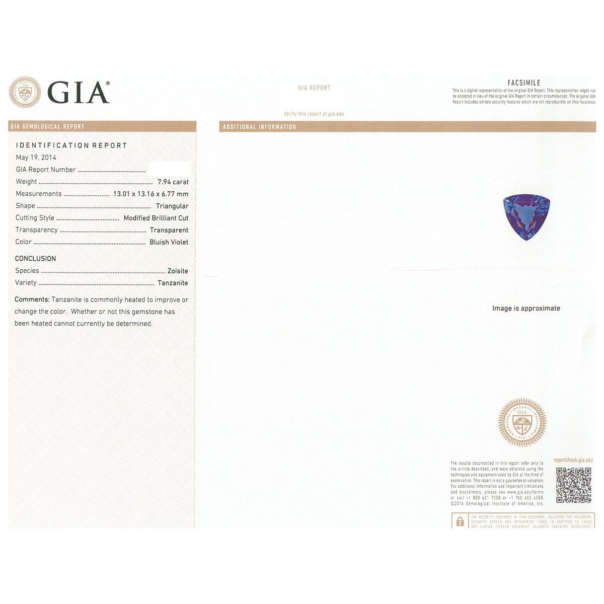 One electronically tested 14KT white gold ladies cast tanzanite and diamond ring with a bright polish finish. Condition is new, good workmanship. The featured tanzanite is set within a diamond bezel completed by a three millimeter wide band. Identified with markings of "K14". Containing: One prong set triangle modified brilliant cut natural tanzanite, measuring 13.01 x 13.16 x 6.77mm, approximate weight of 7.94ct., clarity is eye clean, type I, medium dark, very slightly grayish, bluish violet color, (GIA bV 6/3), cut is good. Transmitting light with no distortion, transparent. GIA Gemological Report attached. Graded loose prior to setting in the GIA Laboratory, Report # 2161097572.Tanzanite is a very rare gemstone that is only found in the country of Tanzania. Originally discovered in 1967. Tiffany & Company, named the stone Tanzanite. It is found in the Usumburu Mountains that border the Umba Valley of northern Tanzania. Tanzanite occurs in gray, brown, violet, blue, reddish-purple, & green. The gem is interesting because of its exceptional pleochroism. Rotated in different directions a tanzanite will exhibit multiple changes of color. Tanzanite has a low tolerance to ultrasonic cleaning, and should not be cleaned using this method. Fourteen prong set round brilliant cut diamonds, measuring 3.00 - 2.90 x 1.77mm (depth est.) approximate total weight of 14 Stones = 1.42ct. Graded in the setting. Clarity: SI-2 to I-1. Color: F - H. Total Weight of Colored Stones 7.94ct. Total Weight of Diamonds 1.42ct. Total Weight of Ring 7.90 grams. AIG Appraised at $25,930.00.