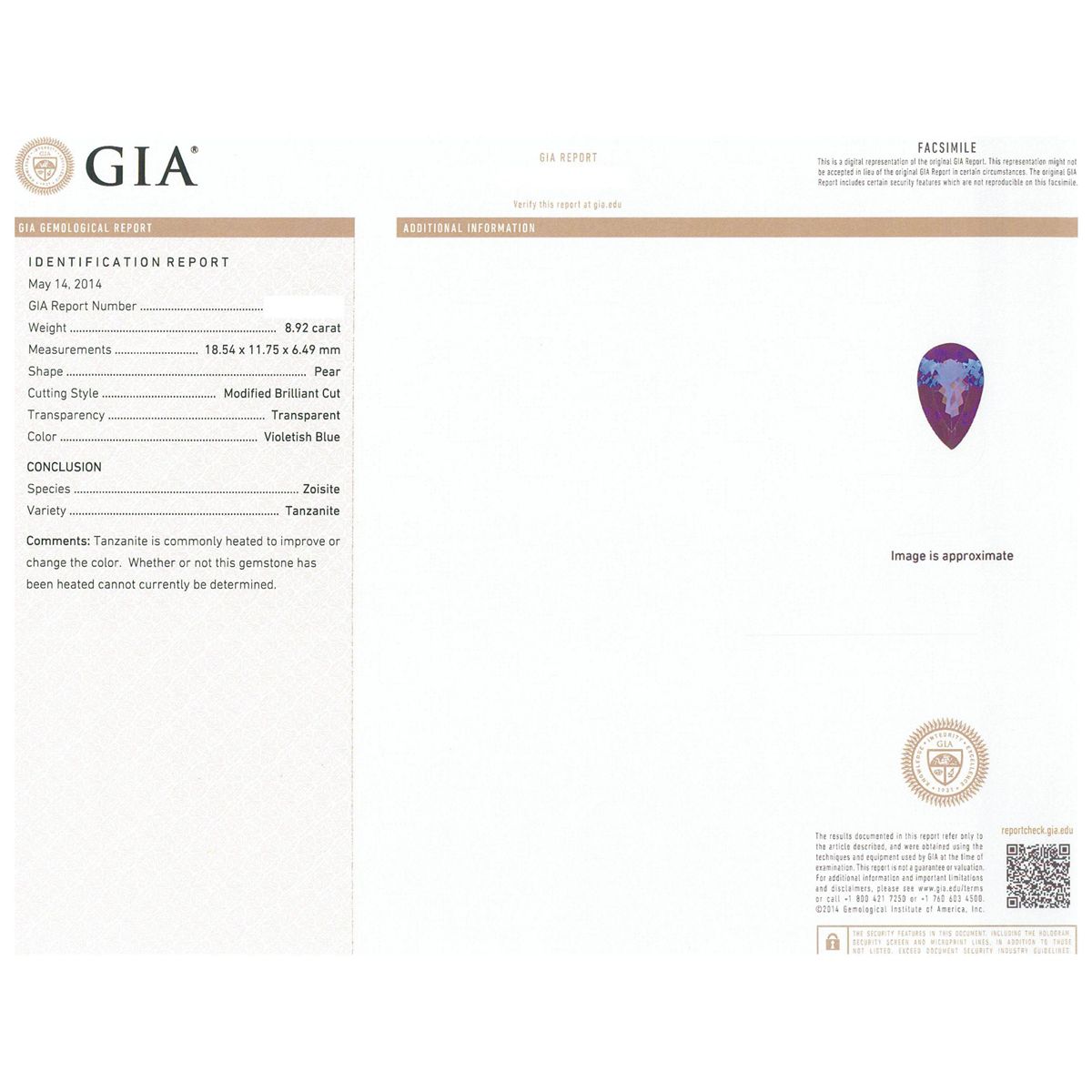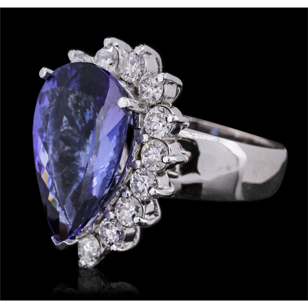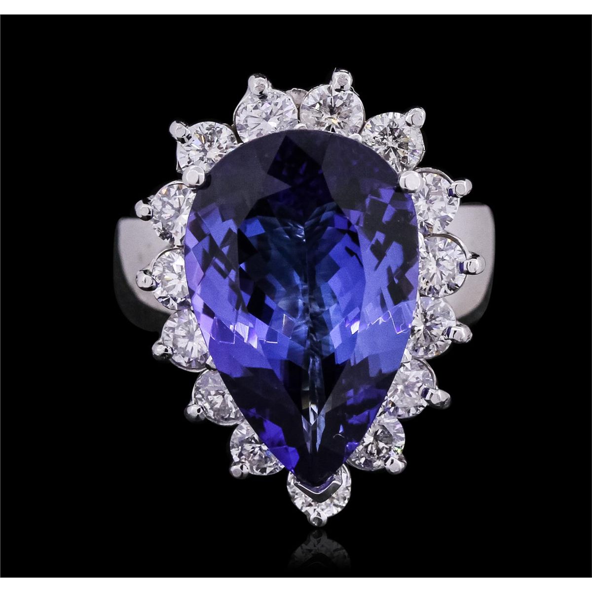 One electronically tested 14KT white gold ladies cast tanzanite and diamond ring with a bright polish finish. Condition is new, good workmanship. The featured tanzanite is set within a diamond bezel, completed by a four millimeter wide band. Identified with markings of "K14". Containing: One prong set pear modified brilliant cut natural tanzanite, measuring 18.05 x 11.67 x 6.18mm, exact weight 8.26ct., clarity is eye clean, type I, medium dark, moderately strong, bluish violet color, (GIA bV 6/4), cut is good. Transmitting light with no distortion, transparent. GIA Gemological Report attached. Graded loose prior to setting in the GIA Laboratory, Report #2161097612.Tanzanite is a very rare gemstone that is only found in the country of Tanzania. Originally discovered in 1967. Tiffany & Company, named the stone Tanzanite. It is found in the Usumburu Mountains that border the Umba Valley of northern Tanzania. Tanzanite occurs in gray, brown, violet, blue, reddish-purple, & green. The gem is interesting because of its exceptional pleochroism. Rotated in different directions a tanzanite will exhibit multiple changes of color. Tanzanite has a low tolerance to ultrasonic cleaning, and should not be cleaned using this method. Fifteen prong set round brilliant cut diamonds, measuring 3.30 - 3.10 x 1.92mm (depth est.) approximate total weight of 15 Stones = 1.90ct. Graded in the setting. Clarity: SI-1 to I-1. Color: G - I. Total Weight of Colored Stones 8.26ct. Total Weight of Diamonds 1.90ct. Total Weight of Ring 12.42 grams. AIGAppraised at $28,445.00.
