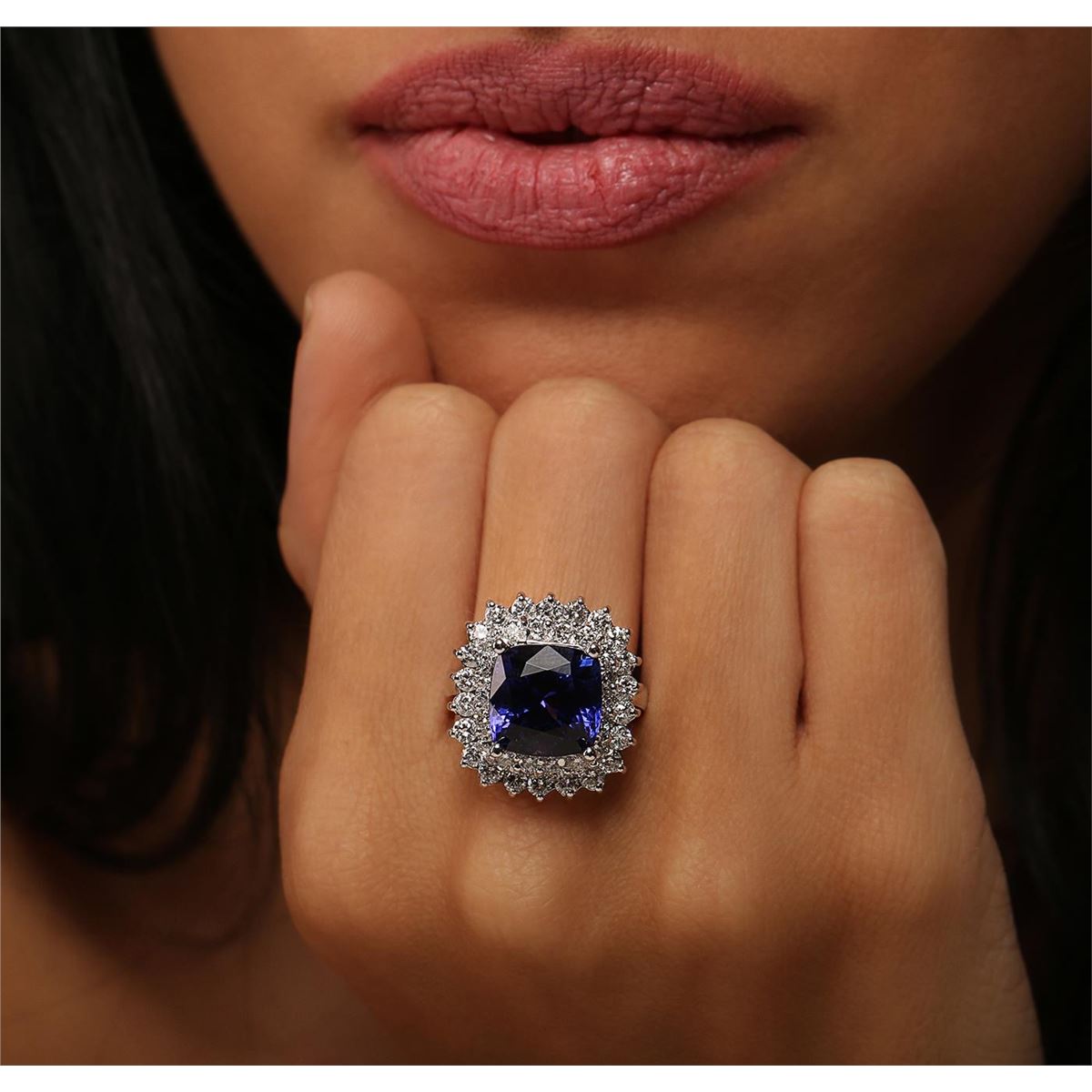 One electronically tested 14KT white gold ladies cast tanzanite and diamond ring with a bright polish finish. Condition is new, good workmanship. The featured tanzanite is set within a diamond lattice gallery, completed by a two and one-half millimeter wide band. Identified with markings of "K14". Containing: One prong set square cushion modified brilliant cut natural tanzanite, measuring 11.25 x 11.20 x 8.72mm, exact weight 8.39ct., clarity is eye clean, type I, medium dark, moderately strong, violet color, (GIA V 6/4), cut is good. Transmitting light with no distortion, transparent. GIA Gemological Report attached. Graded loose prior to setting in the GIA Laboratory, Report # 1166097601.Tanzanite is a very rare gemstone that is only found in the country of Tanzania. Originally discovered in 1967. Tiffany & Company, named the stone Tanzanite. It is found in the Usumburu Mountains that border the Umba Valley of northern Tanzania. Tanzanite occurs in gray, brown, violet, blue, reddish-purple, & green. The gem is interesting because of its exceptional pleochroism. Rotated in different directions a tanzanite will exhibit multiple changes of color. Tanzanite has a low tolerance to ultrasonic cleaning, and should not be cleaned using this method. Forty prong set round brilliant cut diamonds, measuring 2.50 - 2.10 x 1.38mm (depth est.) approximate total weight of 40 Stones = 2.03ct. Graded in the setting. Clarity: SI-2 to I-2. Color: F - H. Total Weight of Colored Stones 8.39ct. Total Weight of Diamonds 2.03ct. Total Weight of Ring 12.90 grams. AIG Appraised at $30,600.00.