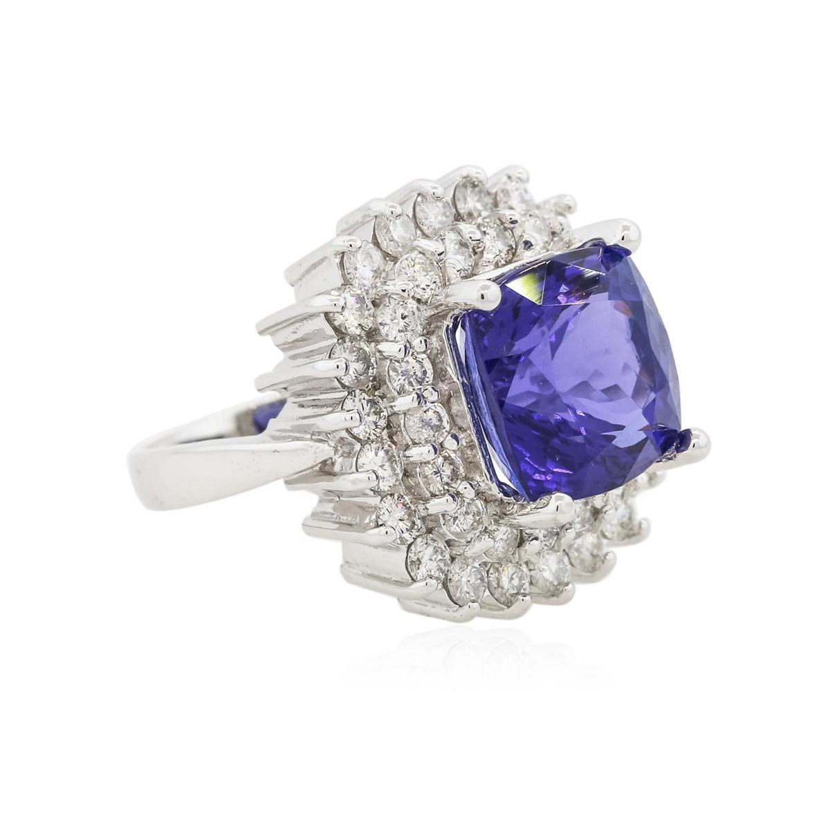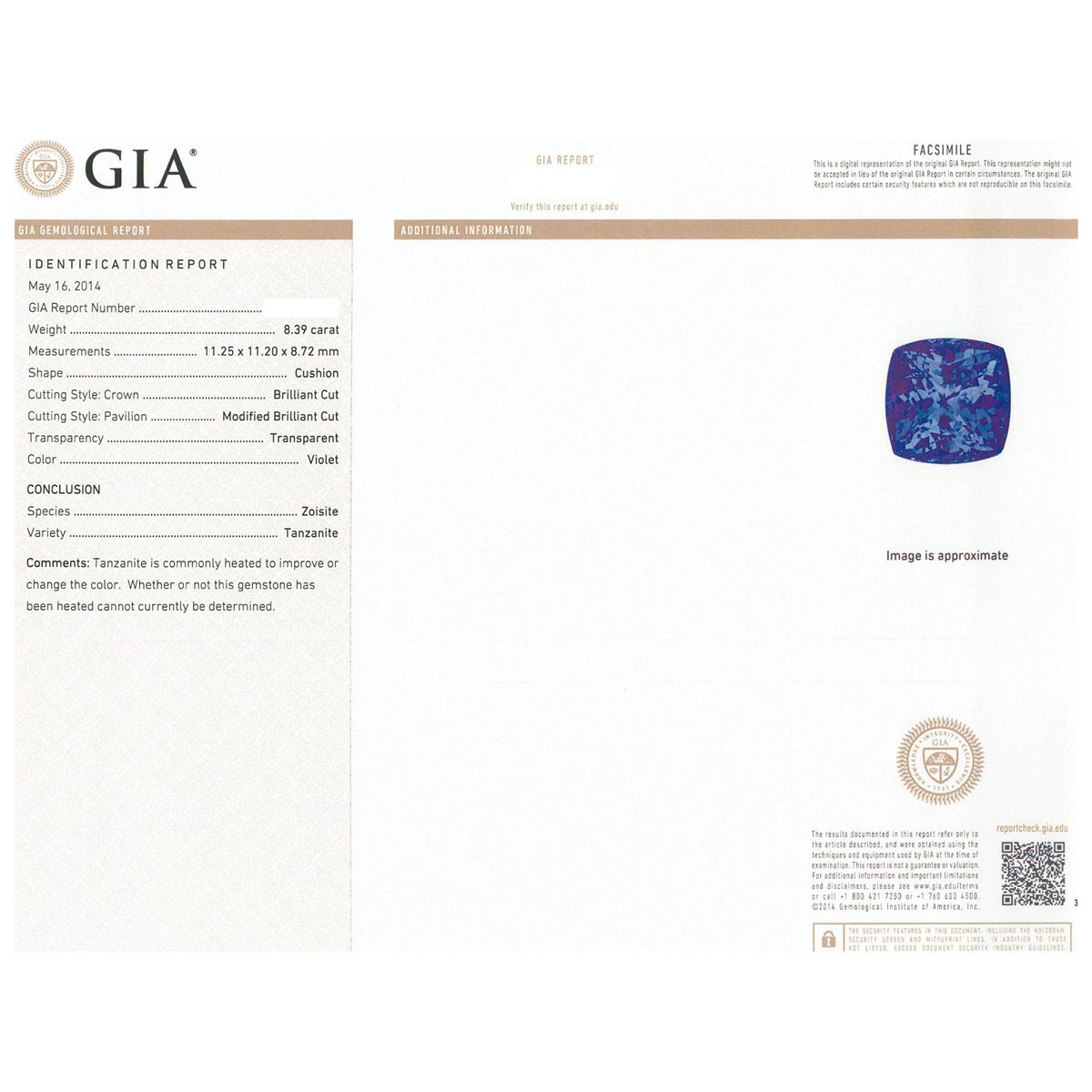 One electronically tested 14KT white gold ladies cast tanzanite and diamond ring with a bright polish finish. Condition is new, good workmanship. The featured tanzanite is set within a diamond lattice gallery, completed by a two and one-half millimeter wide band. Identified with markings of "K14". Containing: One prong set square cushion modified brilliant cut natural tanzanite, measuring 11.25 x 11.20 x 8.72mm, exact weight 8.39ct., clarity is eye clean, type I, medium dark, moderately strong, violet color, (GIA V 6/4), cut is good. Transmitting light with no distortion, transparent. GIA Gemological Report attached. Graded loose prior to setting in the GIA Laboratory, Report # 1166097601.Tanzanite is a very rare gemstone that is only found in the country of Tanzania. Originally discovered in 1967. Tiffany & Company, named the stone Tanzanite. It is found in the Usumburu Mountains that border the Umba Valley of northern Tanzania. Tanzanite occurs in gray, brown, violet, blue, reddish-purple, & green. The gem is interesting because of its exceptional pleochroism. Rotated in different directions a tanzanite will exhibit multiple changes of color. Tanzanite has a low tolerance to ultrasonic cleaning, and should not be cleaned using this method. Forty prong set round brilliant cut diamonds, measuring 2.50 - 2.10 x 1.38mm (depth est.) approximate total weight of 40 Stones = 2.03ct. Graded in the setting. Clarity: SI-2 to I-2. Color: F - H. Total Weight of Colored Stones 8.39ct. Total Weight of Diamonds 2.03ct. Total Weight of Ring 12.90 grams. AIG Appraised at $30,600.00.