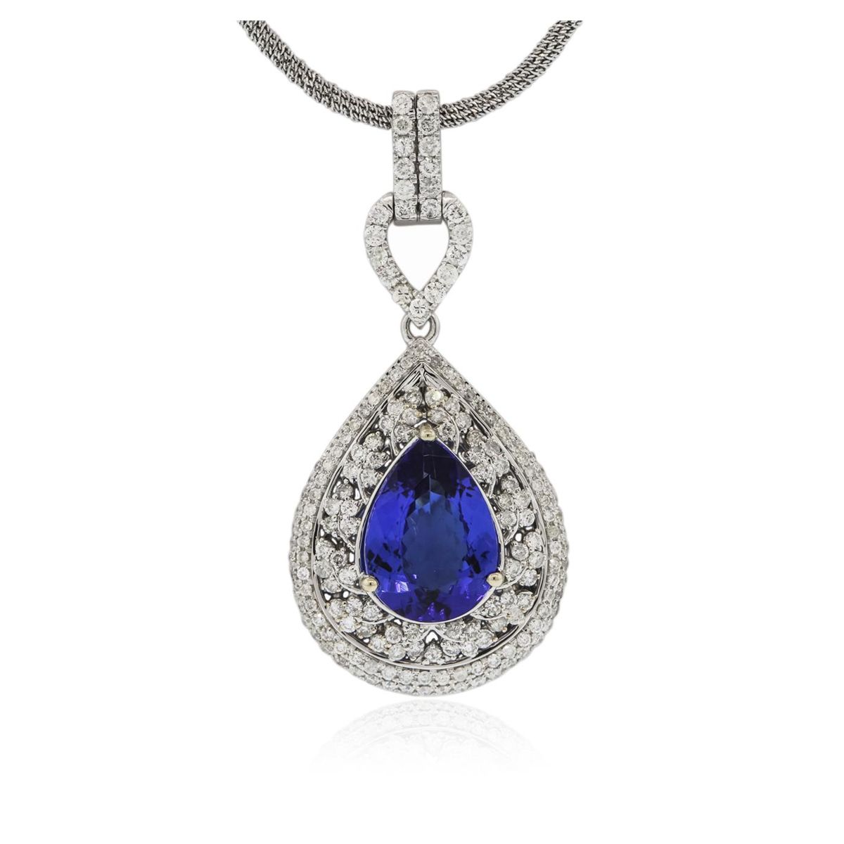 One electronically tested 14KT white gold ladies cast & assembled tanzanite and diamond pendant with chain. Condition is new, good workmanship. The pendant features a tanzanite set within a stylized diamond set lattice gallery, completed by a diamond set bail. The pendant is supported by an eighteen inch length 14KT white gold designer style chain, terminating in a lobster claw clasp. Bright polish finish. Trademark is Orianne. Identified with markings of "14K". Containing: One prong set pear modified brilliant cut natural tanzanite, measuring 16.60 x 11.77 x 6.35mm, exact weight 8.63ct., clarity is eye clean, type I, dark, moderately strong, violetish blue color, (GIA vB 7/4), cut is good. Transmitting light with no distortion, transparent. GIA Gemological Report attached. Graded loose prior to setting in the GIA Laboratory, Report #6157964566.Tanzanite is a very rare gemstone that is only found in the country of Tanzania. Originally discovered in 1967. Tiffany & Company, named the stone Tanzanite. It is found in the Usumburu Mountains that border the Umba Valley of northern Tanzania. Tanzanite occurs in gray, brown, violet, blue, reddish-purple, & green. The gem is interesting because of its exceptional pleochroism. Rotated in different directions a tanzanite will exhibit multiple changes of color. Tanzanite has a low tolerance to ultrasonic cleaning, and should not be cleaned using this method. One Hundred Seventy-Five prong set round brilliant cut diamonds, measuring 1.90 - 1.20 x 0.93mm (depth est.) approximate total weight of 175 Stones = 2.32ct. Graded in the setting. Clarity: SI-2 to I-2. Color: G - I. Total Weight of Colored Stones 8.63ct. Total Weight of Diamonds 2.32ct. Total Weight of Pendant With Chain 22.87 grams. AIG Appraised at $31,805.00.