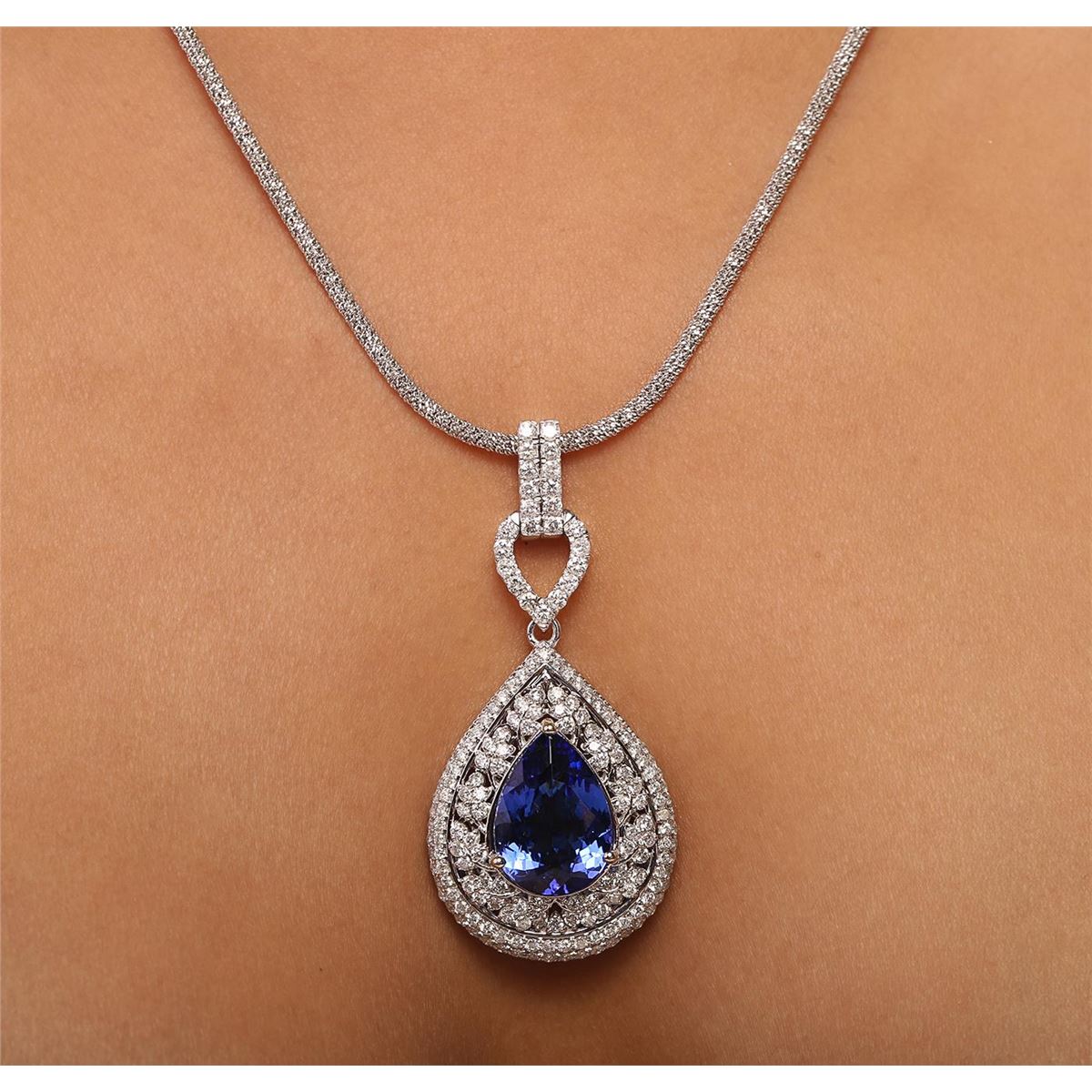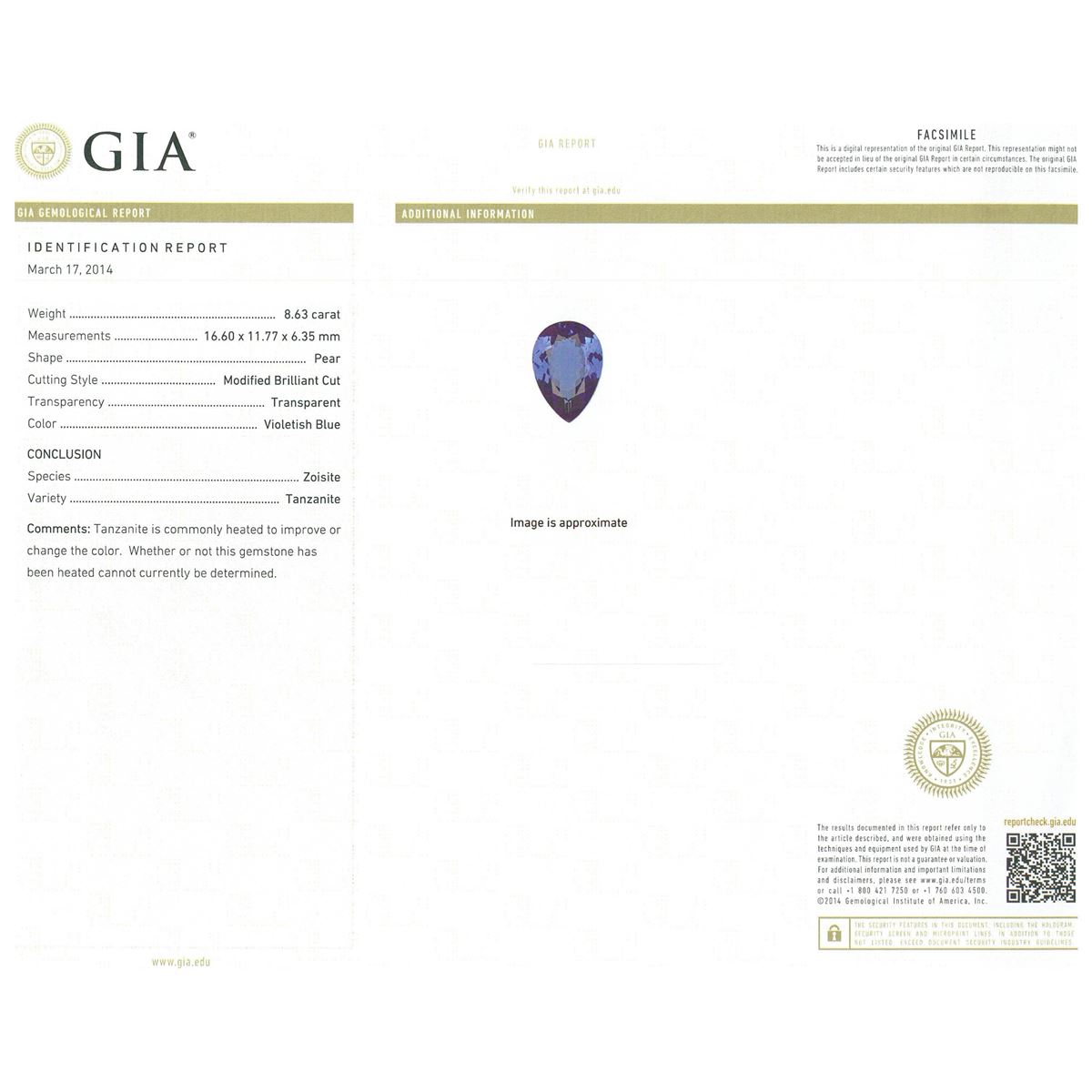 One electronically tested 14KT white gold ladies cast & assembled tanzanite and diamond pendant with chain. Condition is new, good workmanship. The pendant features a tanzanite set within a stylized diamond set lattice gallery, completed by a diamond set bail. The pendant is supported by an eighteen inch length 14KT white gold designer style chain, terminating in a lobster claw clasp. Bright polish finish. Trademark is Orianne. Identified with markings of "14K". Containing: One prong set pear modified brilliant cut natural tanzanite, measuring 16.60 x 11.77 x 6.35mm, exact weight 8.63ct., clarity is eye clean, type I, dark, moderately strong, violetish blue color, (GIA vB 7/4), cut is good. Transmitting light with no distortion, transparent. GIA Gemological Report attached. Graded loose prior to setting in the GIA Laboratory, Report #6157964566.Tanzanite is a very rare gemstone that is only found in the country of Tanzania. Originally discovered in 1967. Tiffany & Company, named the stone Tanzanite. It is found in the Usumburu Mountains that border the Umba Valley of northern Tanzania. Tanzanite occurs in gray, brown, violet, blue, reddish-purple, & green. The gem is interesting because of its exceptional pleochroism. Rotated in different directions a tanzanite will exhibit multiple changes of color. Tanzanite has a low tolerance to ultrasonic cleaning, and should not be cleaned using this method. One Hundred Seventy-Five prong set round brilliant cut diamonds, measuring 1.90 - 1.20 x 0.93mm (depth est.) approximate total weight of 175 Stones = 2.32ct. Graded in the setting. Clarity: SI-2 to I-2. Color: G - I. Total Weight of Colored Stones 8.63ct. Total Weight of Diamonds 2.32ct. Total Weight of Pendant With Chain 22.87 grams. AIG Appraised at $31,805.00.