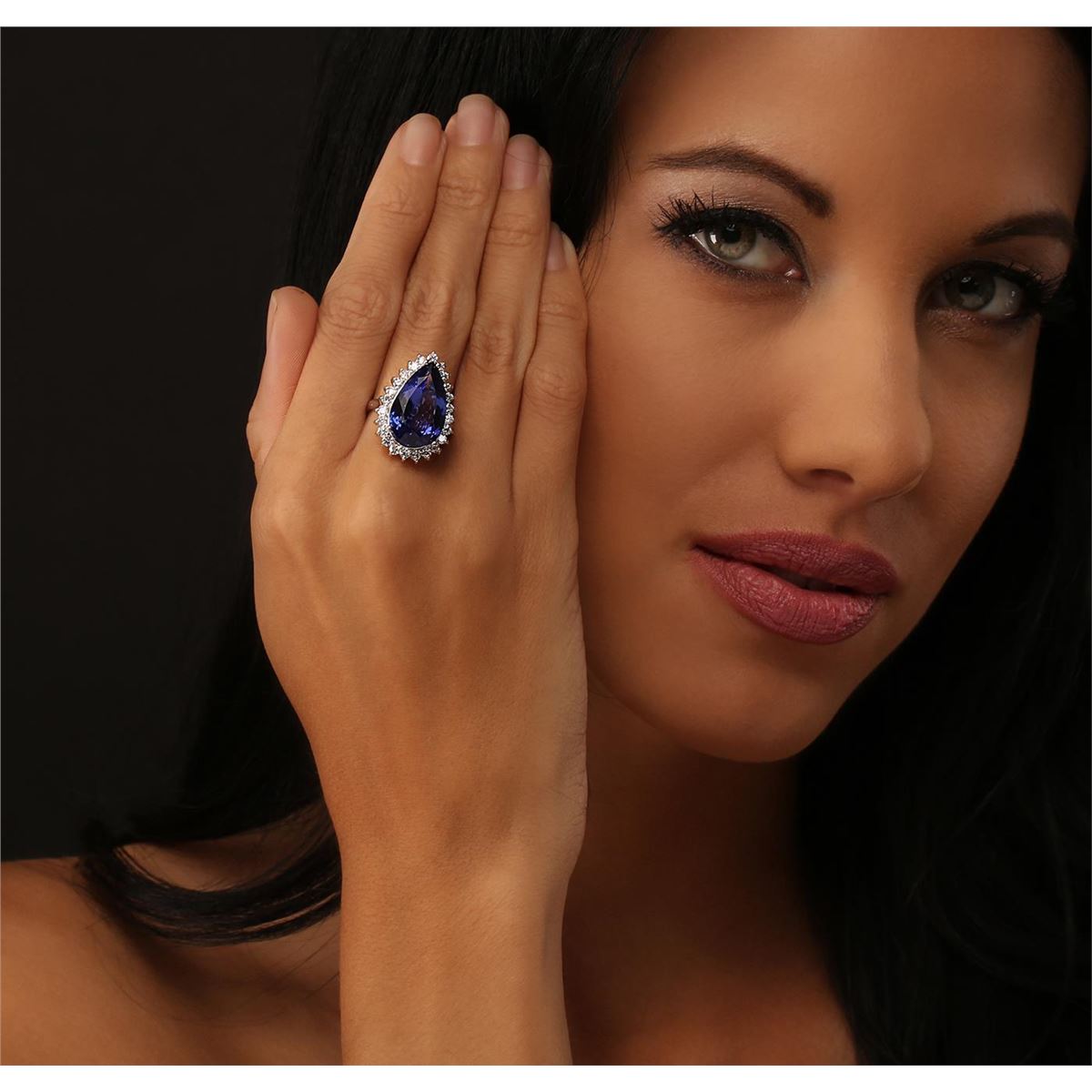 One electronically tested 14KT white gold ladies cast tanzanite and diamond ring with a bright polish finish. Condition is new, good workmanship. The featured tanzanite is set within a diamond bezel, completed by a two and one-half millimeter wide band. Identified with markings of "K14". Containing: One prong set pear modified brilliant cut natural tanzanite, measuring 18.54 x 11.75 x 6.49mm, exact weight 8.92ct., clarity is eye clean, type I, medium dark, moderately strong, violetish blue color, (GIA vB 6/4), cut is good. Transmitting light with no distortion, transparent. GIA Gemological Report attached. Graded loose prior to setting in the GIA Laboratory, Report #6167097837.Tanzanite is a very rare gemstone that is only found in the country of Tanzania. Originally discovered in 1967. Tiffany & Company, named the stone Tanzanite. It is found in the Usumburu Mountains that border the Umba Valley of northern Tanzania. Tanzanite occurs in gray, brown, violet, blue, reddish-purple, & green. The gem is interesting because of its exceptional pleochroism. Rotated in different directions a tanzanite will exhibit multiple changes of color. Tanzanite has a low tolerance to ultrasonic cleaning, and should not be cleaned using this method. Twenty-Four prong set round brilliant cut diamonds, measuring 2.20 - 2.00 x 1.26mm (depth est.) approximate total weight of 24 Stones = 0.91ct. Graded in the setting. Clarity: SI-1 to I-1. Color: G - I. Total Weight of Colored Stones 8.92ct. Total Weight of Diamonds 0.91ct. Total Weight of Ring 8.10 grams. AIG Appraised at $26,235.00.