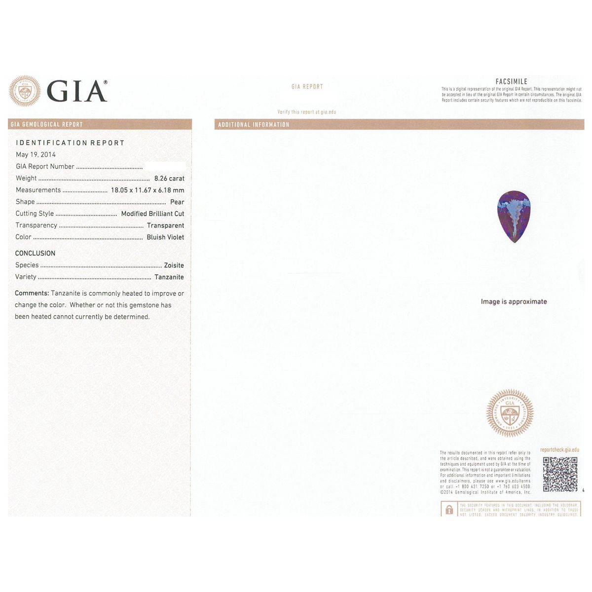 One electronically tested 14KT white gold ladies cast tanzanite and diamond ring with a bright polish finish. Condition is new, good workmanship. The featured tanzanite is set within a diamond bezel, completed by a two and one-half millimeter wide band. Identified with markings of "K14". Containing: One prong set pear modified brilliant cut natural tanzanite, measuring 18.54 x 11.75 x 6.49mm, exact weight 8.92ct., clarity is eye clean, type I, medium dark, moderately strong, violetish blue color, (GIA vB 6/4), cut is good. Transmitting light with no distortion, transparent. GIA Gemological Report attached. Graded loose prior to setting in the GIA Laboratory, Report #6167097837.Tanzanite is a very rare gemstone that is only found in the country of Tanzania. Originally discovered in 1967. Tiffany & Company, named the stone Tanzanite. It is found in the Usumburu Mountains that border the Umba Valley of northern Tanzania. Tanzanite occurs in gray, brown, violet, blue, reddish-purple, & green. The gem is interesting because of its exceptional pleochroism. Rotated in different directions a tanzanite will exhibit multiple changes of color. Tanzanite has a low tolerance to ultrasonic cleaning, and should not be cleaned using this method. Twenty-Four prong set round brilliant cut diamonds, measuring 2.20 - 2.00 x 1.26mm (depth est.) approximate total weight of 24 Stones = 0.91ct. Graded in the setting. Clarity: SI-1 to I-1. Color: G - I. Total Weight of Colored Stones 8.92ct. Total Weight of Diamonds 0.91ct. Total Weight of Ring 8.10 grams. AIG Appraised at $26,235.00.