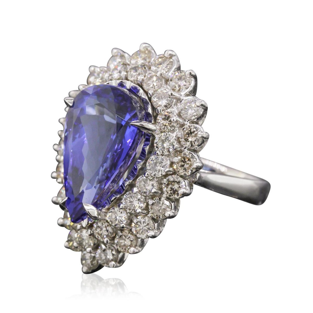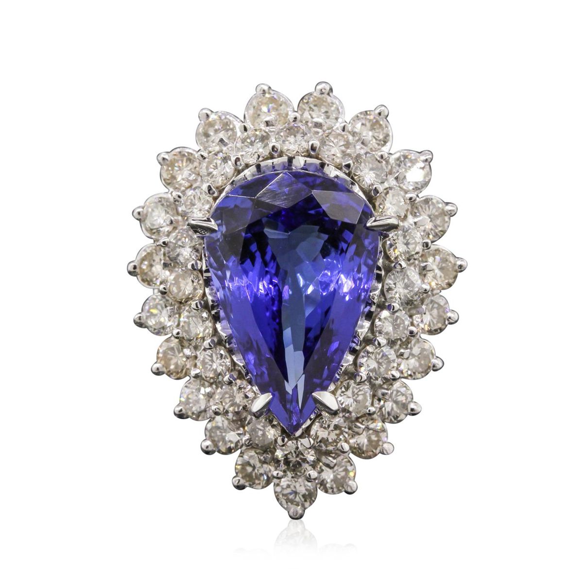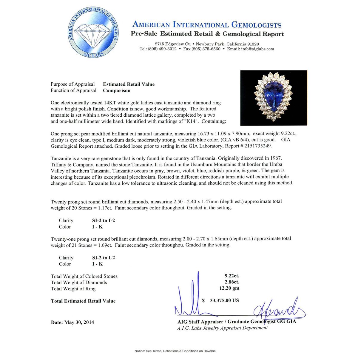 One electronically tested 14KT white gold ladies cast tanzanite and diamond ring with a bright polish finish. Condition is new, good workmanship. The featured tanzanite is set within a two tiered diamond lattice gallery, completed by a two and one-half millimeter wide band. Identified with markings of "K14". Containing: One prong set pear modified brilliant cut natural tanzanite, measuring 16.73 x 11.09 x 7.90mm, exact weight 9.22ct., clarity is eye clean, type I, medium dark, moderately strong, violetish blue color, (GIA vB 6/4), cut is good. GIA Gemological Report attached. Graded loose prior to setting in the GIA Laboratory, Report # 2151735249.Tanzanite is a very rare gemstone that is only found in the country of Tanzania. Originally discovered in 1967. Tiffany & Company, named the stone Tanzanite. It is found in the Usumburu Mountains that border the Umba Valley of northern Tanzania. Tanzanite occurs in gray, brown, violet, blue, reddish-purple, & green. The gem is interesting because of its exceptional pleochroism. Rotated in different directions a tanzanite will exhibit multiple changes of color. Tanzanite has a low tolerance to ultrasonic cleaning, and should not be cleaned using this method. Twenty prong set round brilliant cut diamonds, measuring 2.50 - 2.40 x 1.47mm (depth est.) approximate. Total Weight of 20 Stones = 1.17ct. Faint secondary color throughout. Graded in the setting. Clarity: SI-2 to I-2. Color: I - K Twenty-One prong set round brilliant cut diamonds, measuring 2.80 - 2.70 x 1.65mm (depth est.) approximate. Total Weight of 21 Stones = 1.69ct. Faint secondary color throughout. Graded in the setting. Clarity: SI-2 to I-2. Color: I - K. Total Weight of Colored Stones 9.22ct. Total Weight of Diamonds 2.86ct. Total Weight of Ring 12.20 grams. AIG Appraised at $33,375.00.