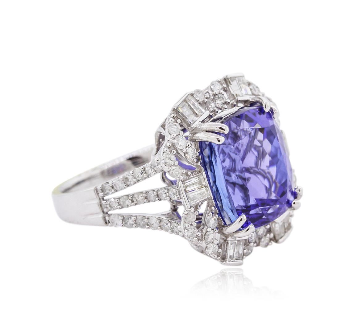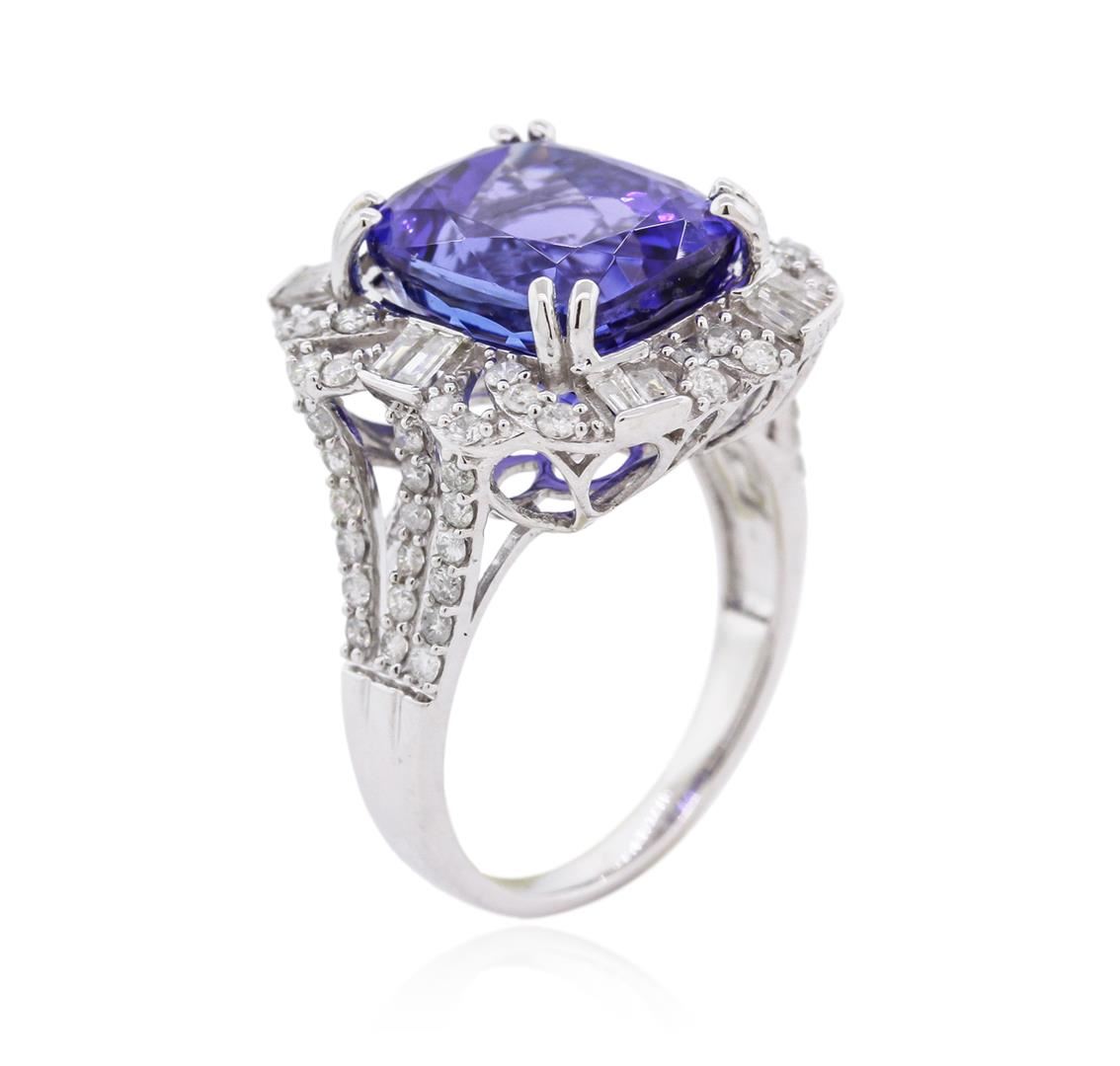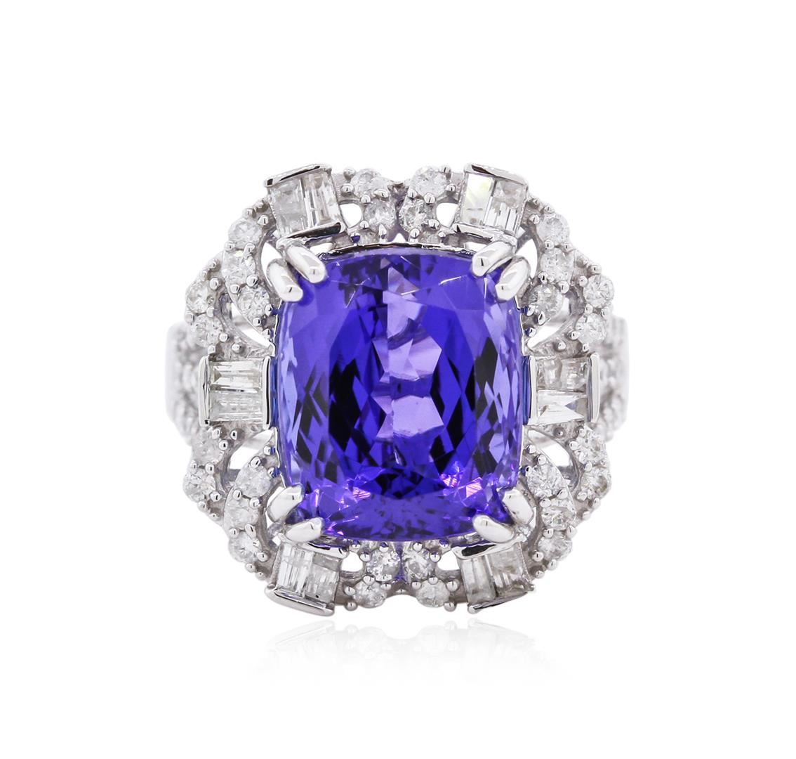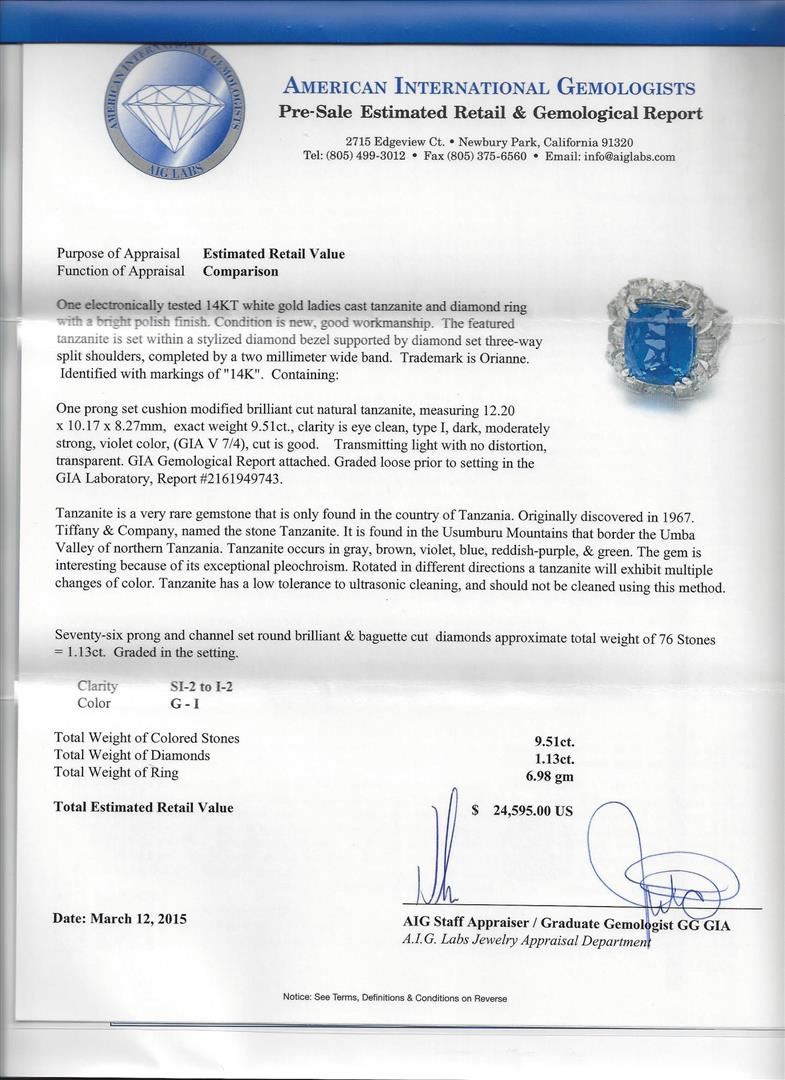 One electronically tested 14KT white gold ladies cast tanzanite and diamond ring with a bright polish finish. The featured tanzanite is set within a stylized diamond bezel supported by diamond set three-way split shoulders, completed by a two millimeter wide band. Trademark is Orianne. Identified with markings of "14K". Condition is new, good workmanship. Containing: One prong set cushion modified brilliant cut natural tanzanite, measuring 12.20 x 10.17 x 8.27mm, exact weight 9.51ct., clarity is eye clean, type I, dark, moderately strong, violet color, (GIA V 7/4), cut is good. Transmitting light with no distortion, transparent. GIA Gemological Report attached. Graded loose prior to setting in the GIA Laboratory, Report #2161949743.Tanzanite is a very rare gemstone that is only found in the country of Tanzania. Originally discovered in 1967. Tiffany & Company, named the stone Tanzanite. It is found in the Usumburu Mountains that border the Umba Valley of northern Tanzania. Tanzanite occurs in gray, brown, violet, blue, reddish-purple, & green. The gem is interesting because of its exceptional pleochroism. Rotated in different directions a tanzanite will exhibit multiple changes of color. Tanzanite has a low tolerance to ultrasonic cleaning, and should not be cleaned using this method. Seventy-Six prong and channel set round brilliant & baguette cut diamonds approximate total weight of 76 Stones = 1.13ct. Graded in the setting. Clarity: SI-2 to I-2. Color: G - I. Total Weight of Colored Stones 9.51ct. Total Weight of Diamonds 1.13ct. Total Weight of Ring 6.98 grams. AIG Appraised at $24,595.00.