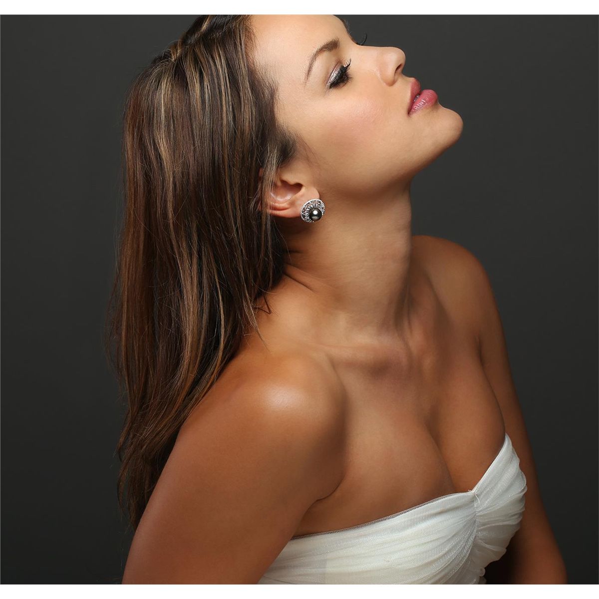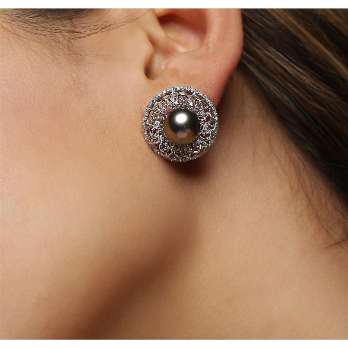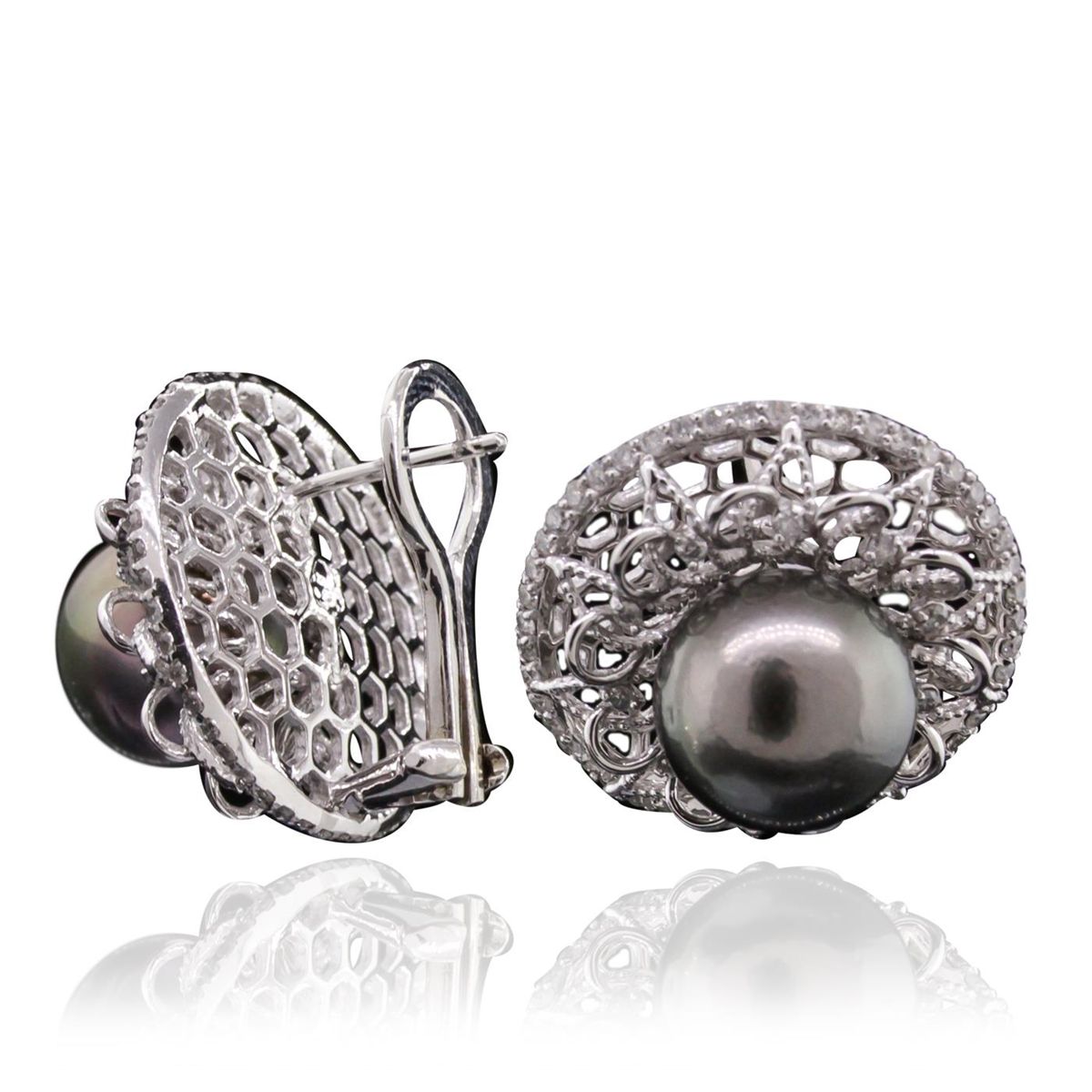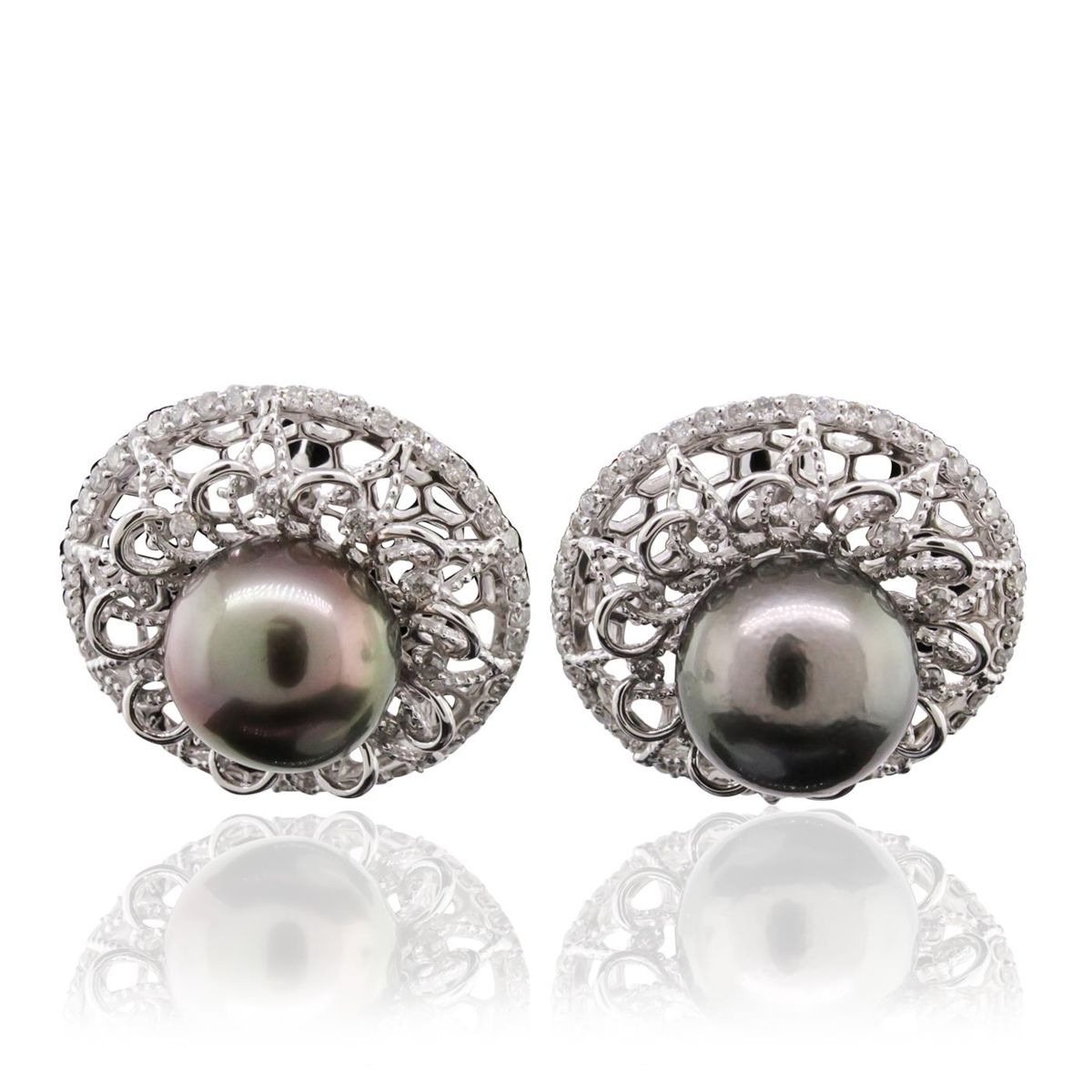 One pair electronically tested 14KT white gold Ladies earrings with Omega clip backs with a bright polish finish. Condition is new. Containing: Two Tahitian pearls, 10.6mm in size to 10.6mm in size. The pearls are silver in color with a good luster, round, moderately blemished. One Hundred prong set round brilliant cut diamonds, measuring 1.10 - 1.10 x 0.66mm (depth est.) approximate. Total Weight of 100 Stones = 0.48ct. Clarity: I-1 to I-2. Color: I - J, Cut is Good. Total Weight of Diamonds 0.48ct. Total Weight of Earrings 11.80 grams. GGL Appraised at $7,580.00.