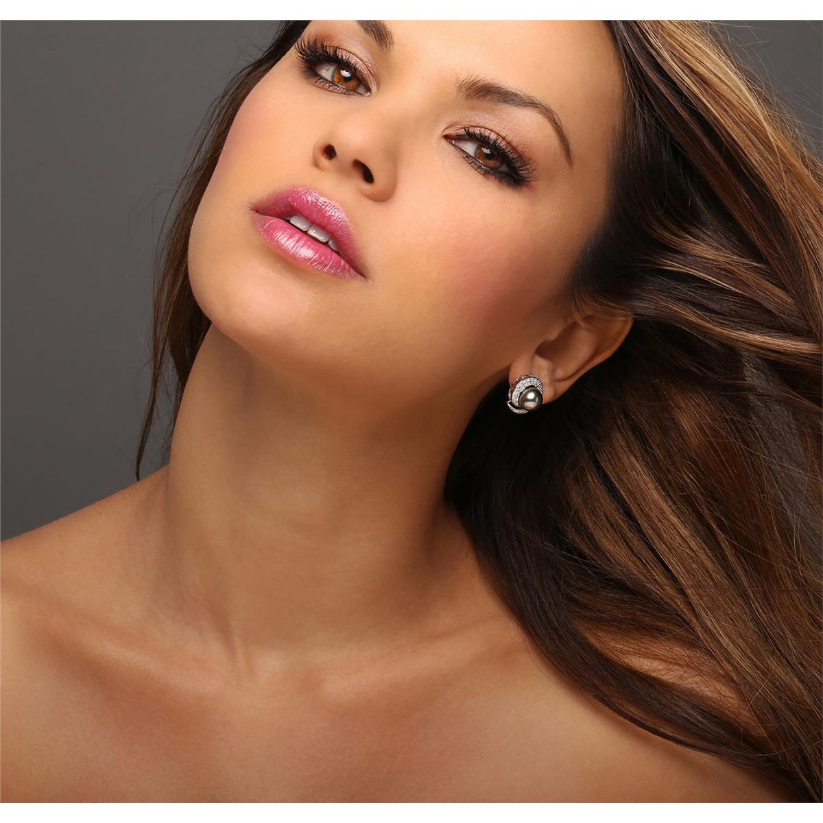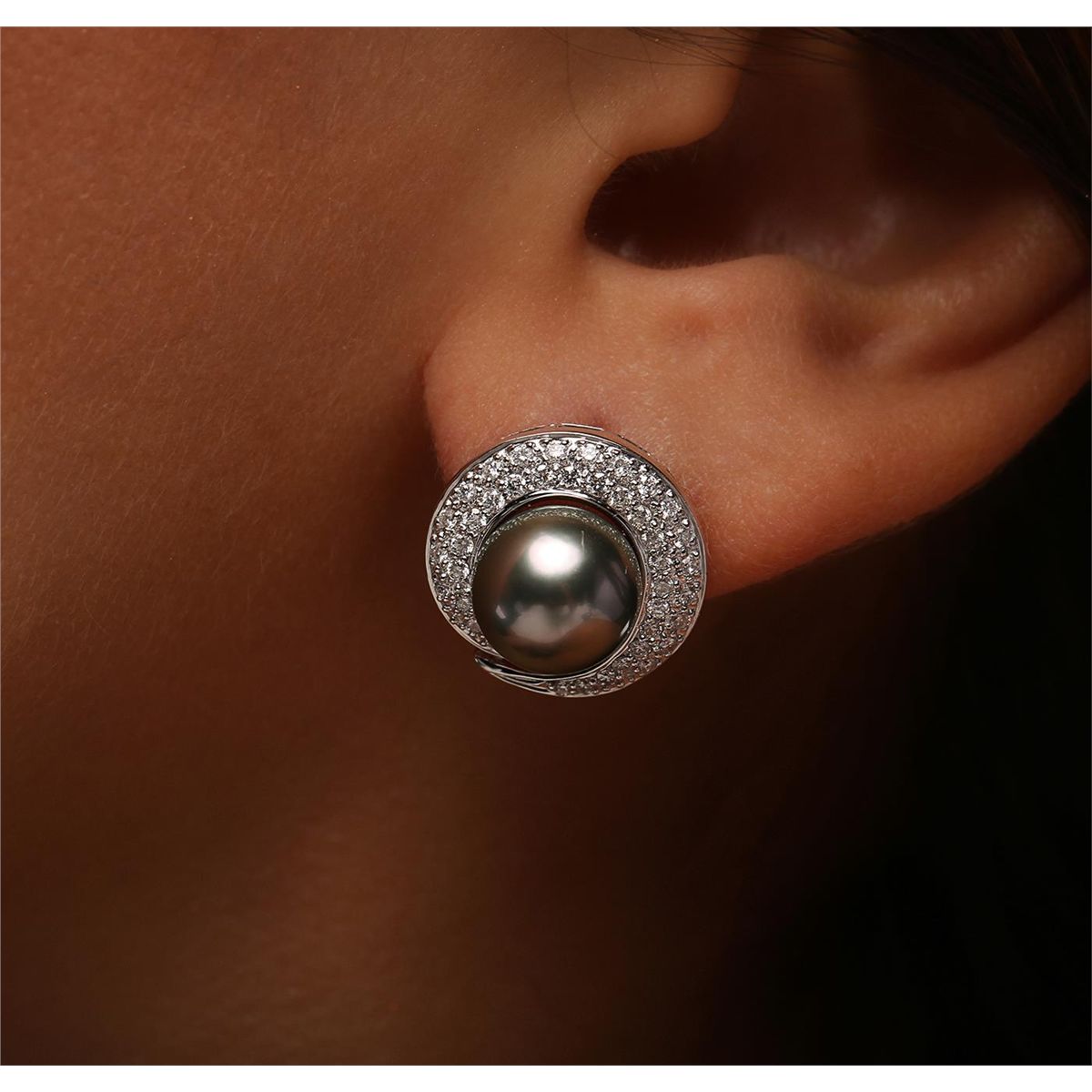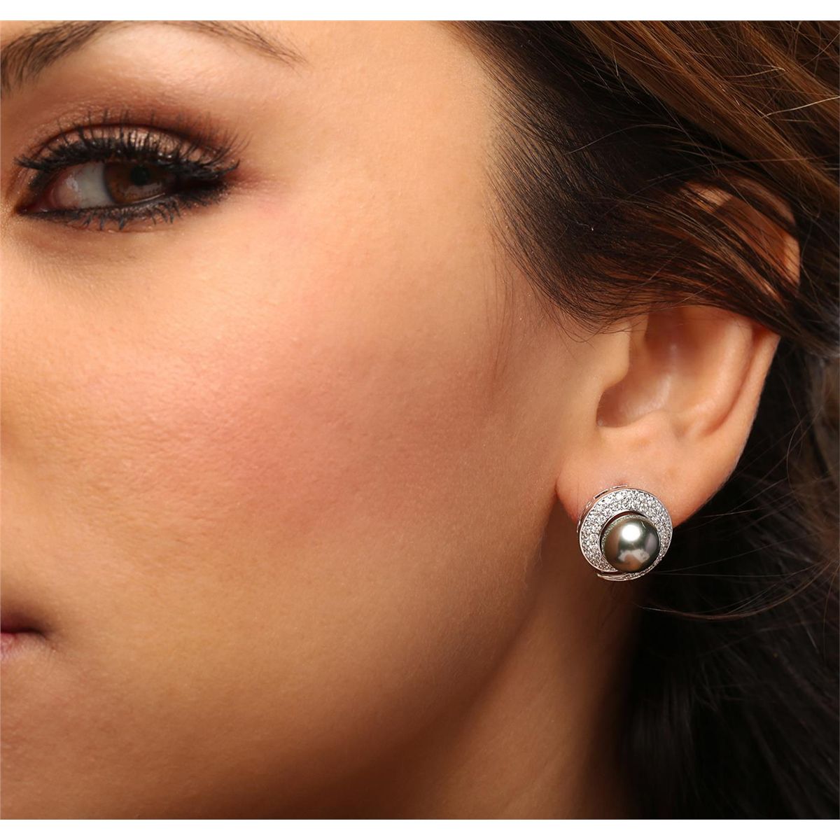 One pair of earrings featuring: 14KT white gold weighing 6.90 grams containing two Tahitian pearls measuring 9.5 mm and 82 brilliant cut diamonds with a total weight of 0.65cts.