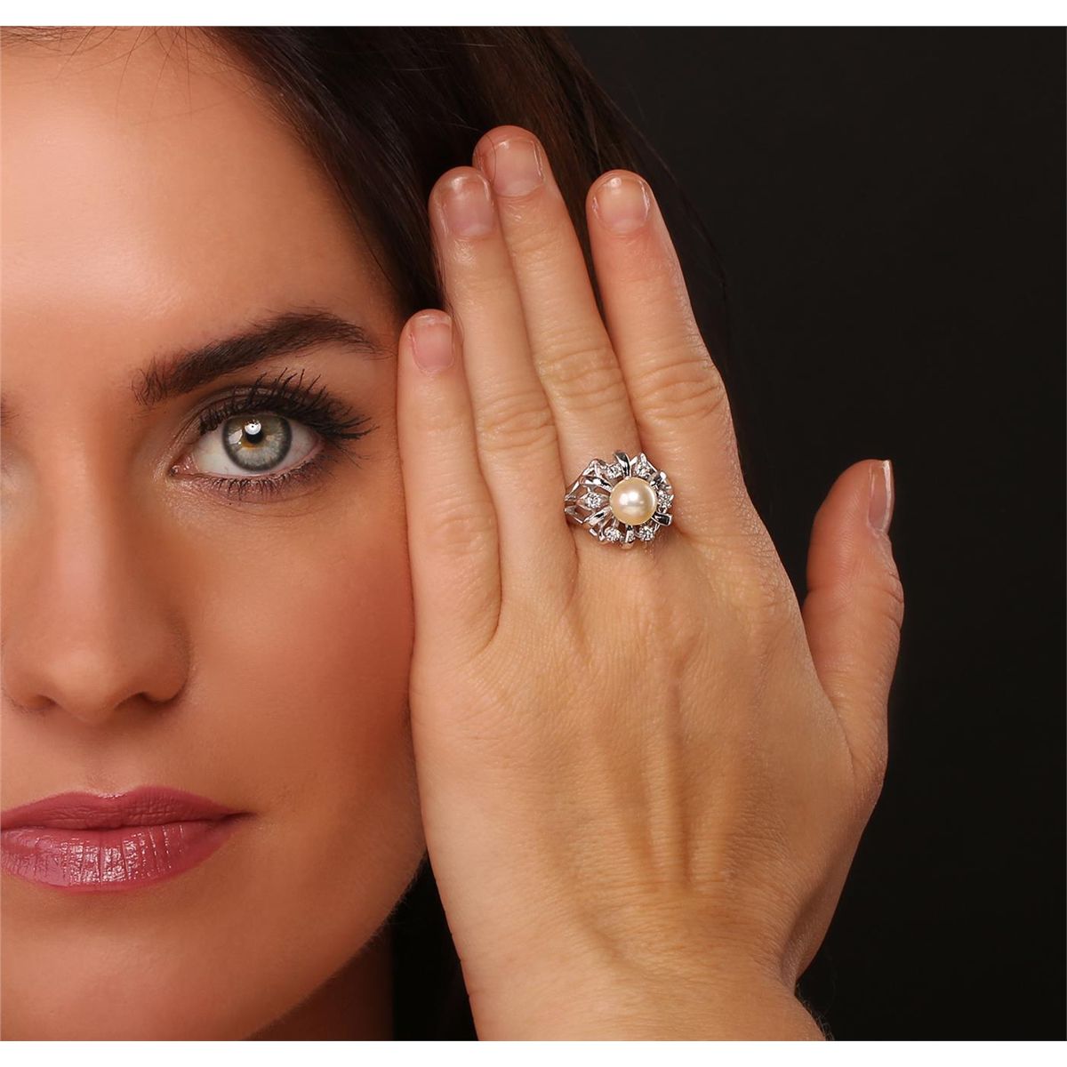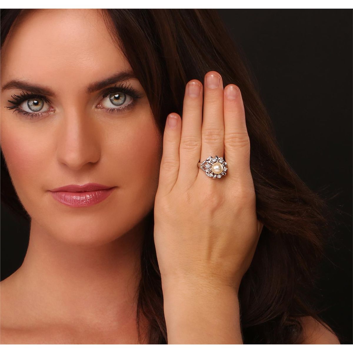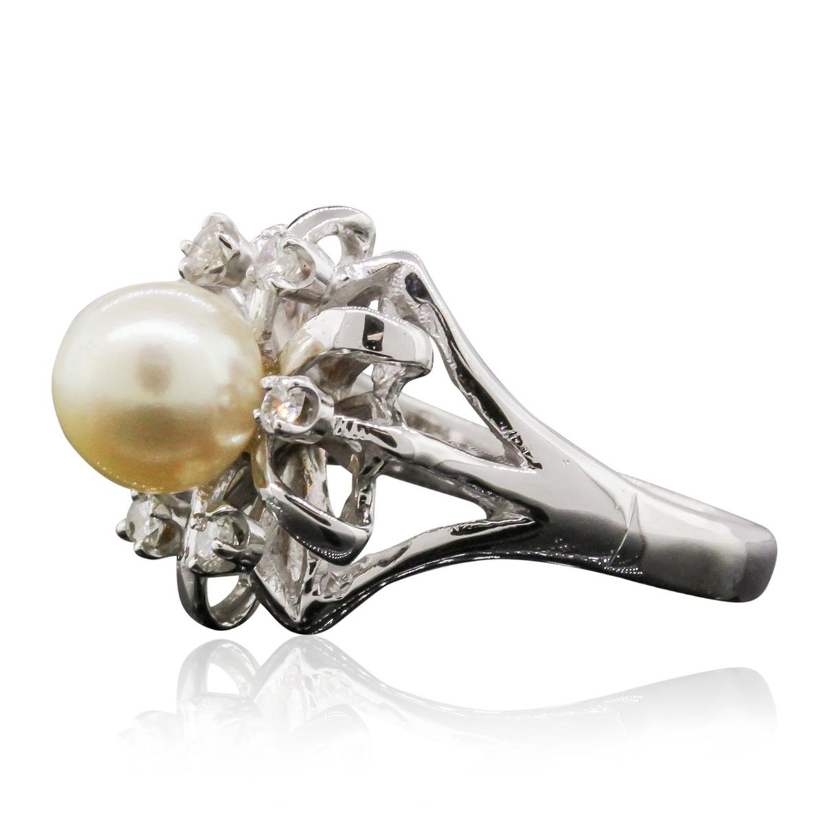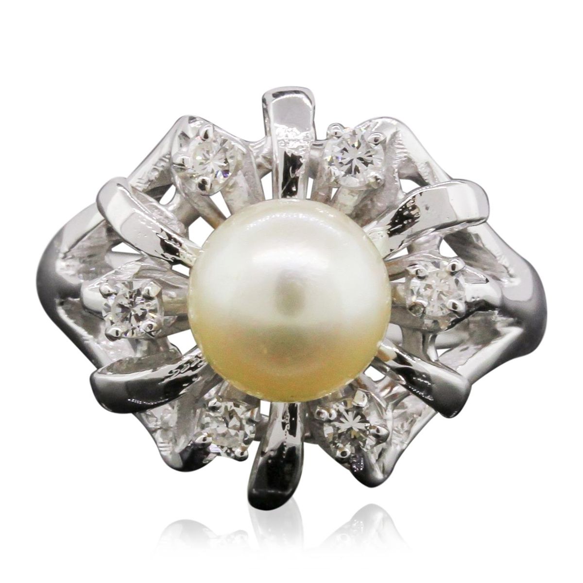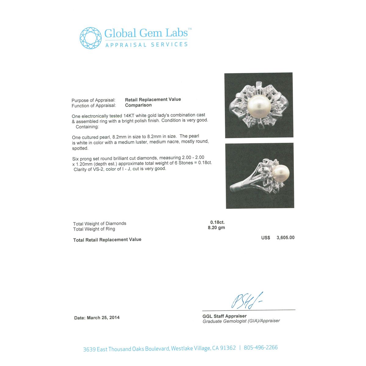 One electronically tested 14KT white gold Ladies combination cast & assembled ring with a bright polish finish. Condition is very good. Containing: One cultured pearl, 8.2mm in size to 8.2mm in size. The pearl is white in color with a medium luster, medium nacre, mostly round, spotted. Six prong set round brilliant cut diamonds, measuring 2.00 - 2.00 x 1.20mm (depth est.) approximate. Total Weight of 6 Stones = 0.18ct. Clarity: VS-2. Color: I - J, Cut is Very Good. Total Weight of Diamonds 0.18ct. Total Weight of Ring 8.20gm. GGL Appraised at $3,605.00.