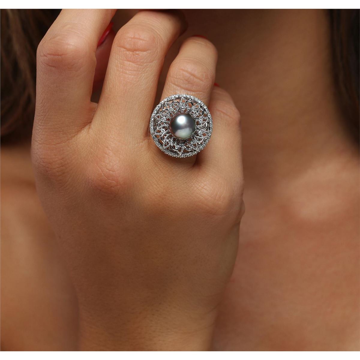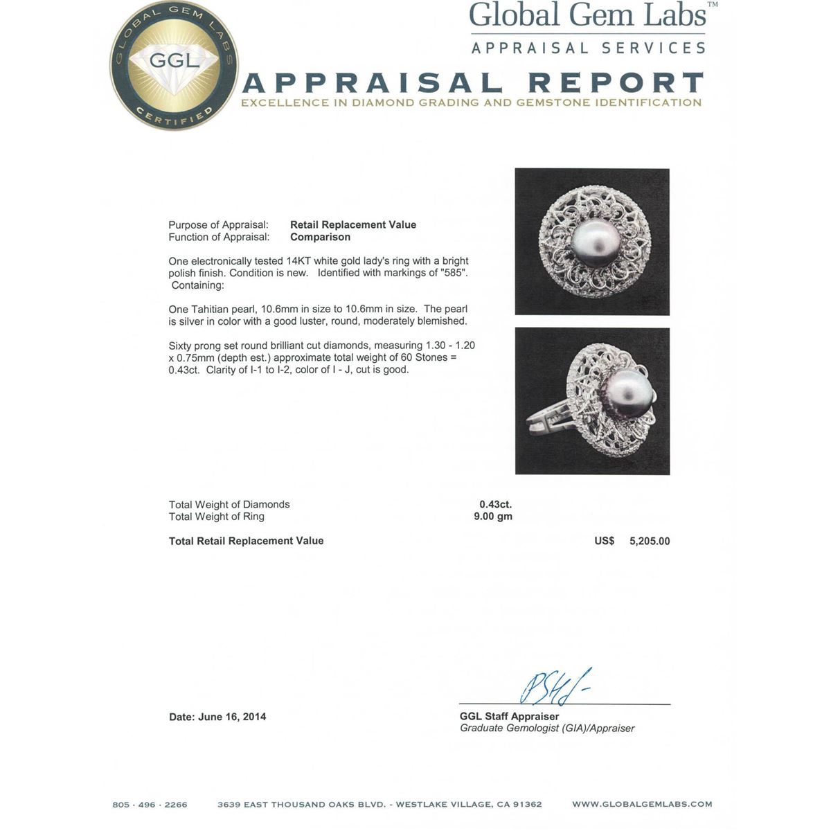 One electronically tested 14KT white gold Ladies ring with a bright polish finish. Condition is new. Identified with markings of "585". Containing: One Tahitian pearl, 10.6mm in size to 10.6mm in size. The pearl is silver in color with a good luster, round, moderately blemished. Sixty prong set round brilliant cut diamonds, measuring 1.30 - 1.20 x 0.75mm (depth est.) approximate. Total Weight of 60 Stones = 0.43ct. Clarity: I-1 to I-2. Color: I - J, Cut is Good. Total Weight of Diamonds 0.43ct. Total Weight of Ring 9.00 grams. GGL Appraised at $5,205.00.