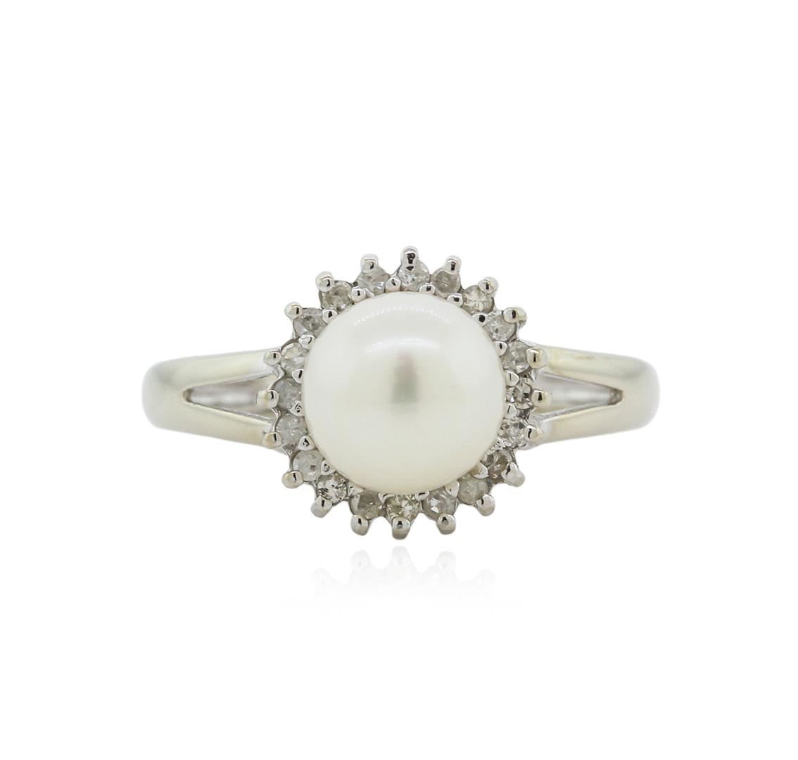 One ring featuring: 14KT white gold weighing 2.70 grams containing one 7mm pearl and diamonds with a total weight of 0.20ct.