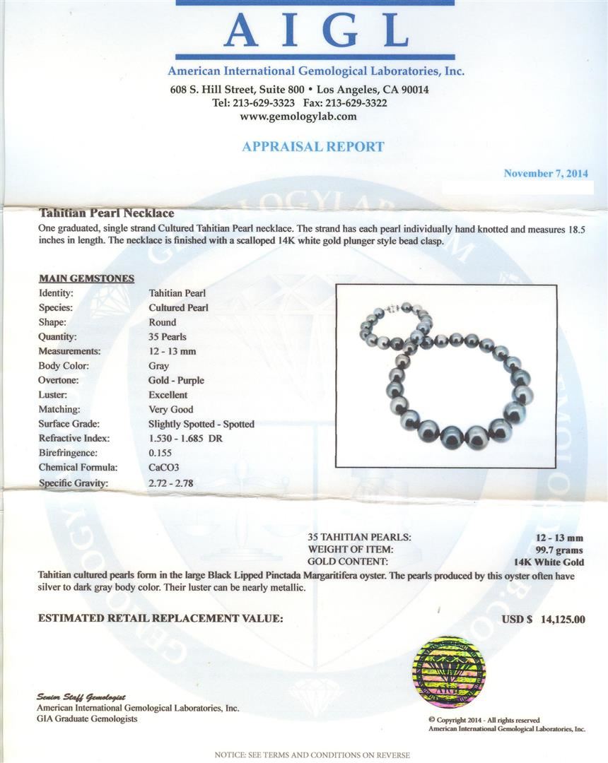 One graduated, single strand Cultured Tahitian Pearl necklace. The strand has each pearl individually hand knotted and measures 18.5 inches in length, featuring 35 Cultured Tahitian Pearls measuring from 12 to 13mm. The necklace is finished with a scalloped 14KT white gold plunger style bead clasp. AIGL Appraised at $14,125.00.