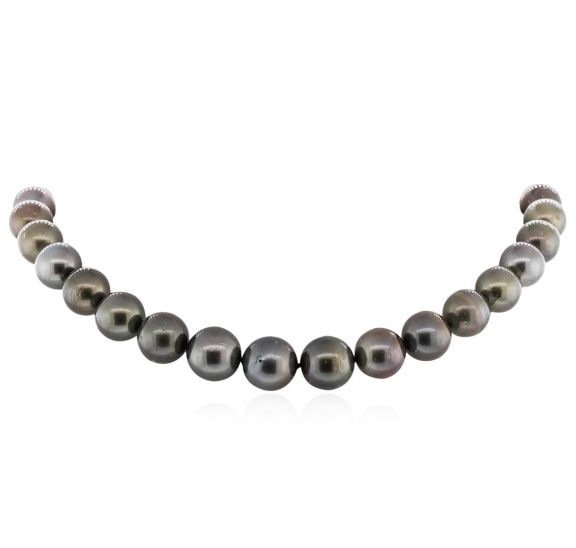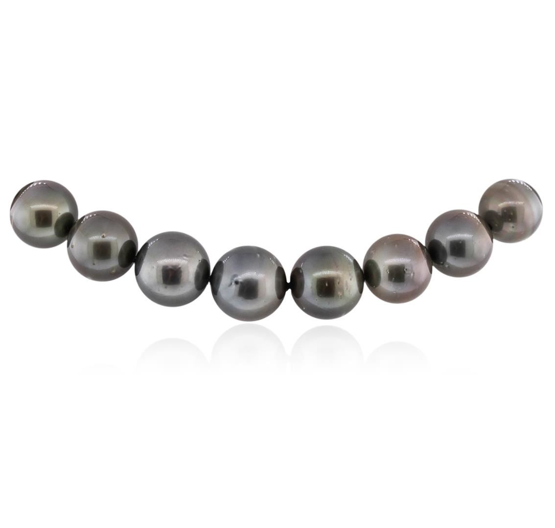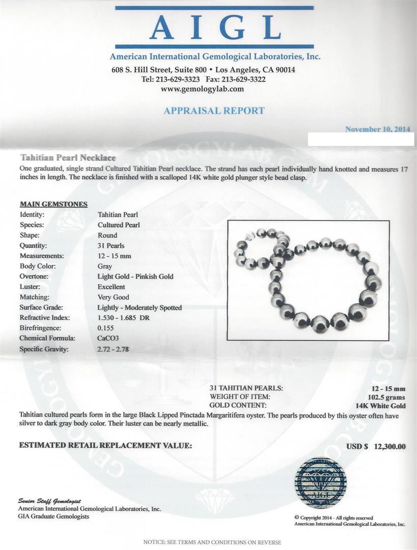 One graduated, single strand Cultured Tahitian Pearl necklace. The strand has each pearl individually hand knotted and measures 17 inches in length. The necklace is finished with a scalloped 14K white gold plunger style bead clasp. MAIN GEMSTONES: Identity: Tahitian Pearl. Species: Cultured Pearl. Shape: Round. Quantity: 31 Pearls. Measurements: 12 - 15 mm. Body Color: Gray. Overtone: Light Gold - Pinkish Gold. Luster: Excellent. Matching: Very Good. Surface Grade: Lightly - Moderately Spotted. Refractive Index: 1.530 - 1.685 DR. Birefringence: 0.155. Chemical Formula: CaCO3. Specific Gravity: 2.72 - 2.78. 31 Tahitian Pearls: 12 - 15 mm. Weight of Item: 102.5 grams. Gold Content: 14K White Gold. Tahitian cultured pearls form in the large Black Lipped Pinctada Margaritifera oyster. The pearls produced by this oyster often have silver to dark gray body color. Their luster can be nearly metallic. AIGL Appraised at $12,300.00.