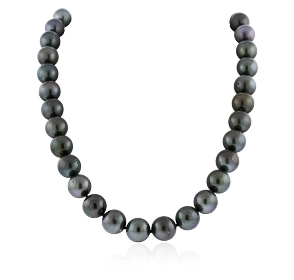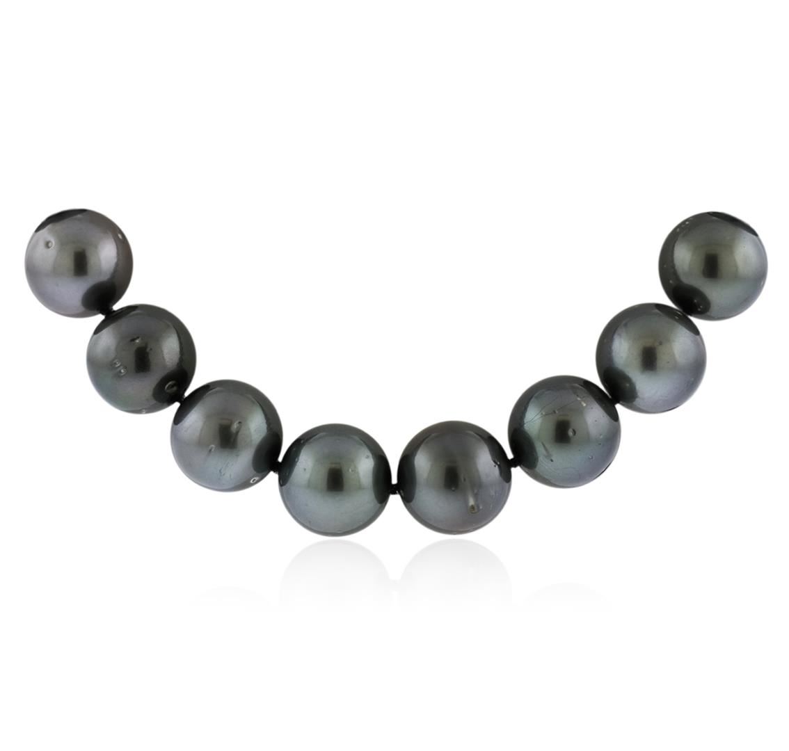 One graduated, single strand Cultured Tahitian Pearl necklace. The strand has each pearl individually hand knotted and measures 18.5 inches in length, featuring 35 Cultured Tahitian Pearls measuring from 12 to 13mm. The necklace is finished with a scalloped 14KT white gold plunger style bead clasp. AIGL Appraised at $14,125.00.