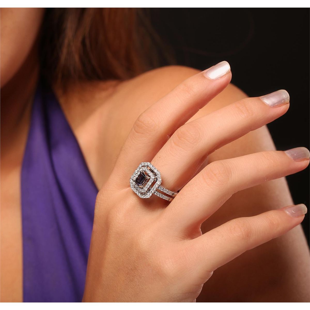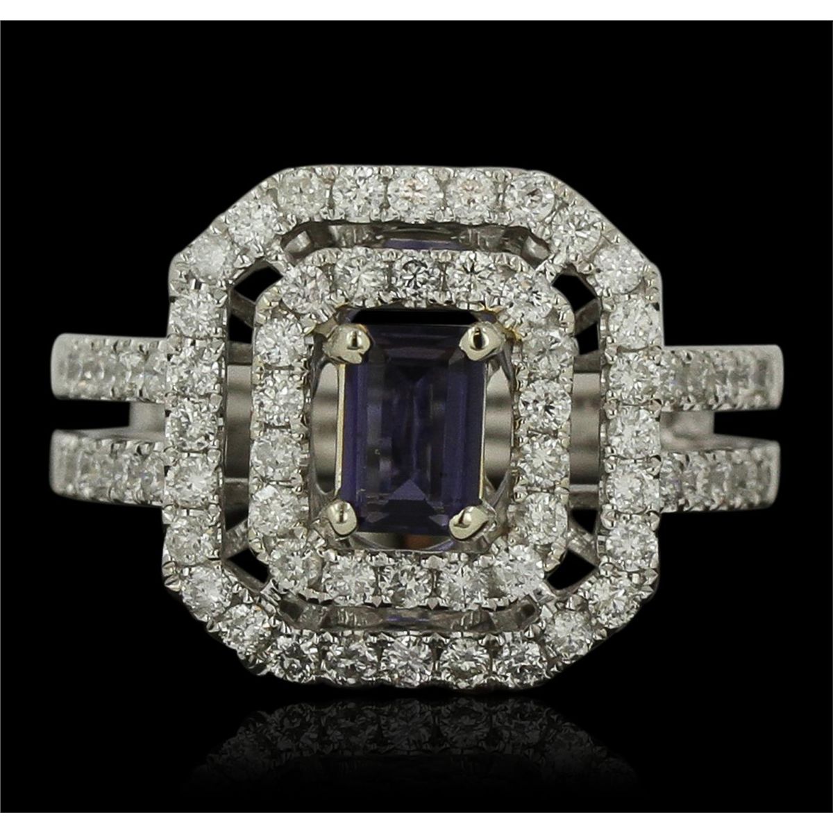 One electronically tested 14KT white and yellow gold Ladies combination cast & assembled ring with a bright polish finish. Condition is new. Identified with markings of "14K". Containing: Sixty-Five prong set round brilliant cut diamonds, measuring 1.20 - 1.20 x 0.72mm (depth est.) approximate. Total Weight of 65 Stones = 0.98ct. Clarity: I-1 to I-2. Color: J - K, Cut is Good. One prong set emerald modified step cut natural tanzanite, measuring 5.80 x 3.90 x 2.80mm, exact weight 0.40ct., clarity is eye clean, type I, medium, very slightly grayish, violet color, (GIA V 5/3), cut is very good. Colored gemstones are presumed to have been subjected to commonly used color/clarity enhancement processes. Total Weight of Colored Stones 0.40ct. Total Weight of Diamonds 0.98ct. Total Weight of Ring 6.40 grams. GGL Appraised at $4,080.00.