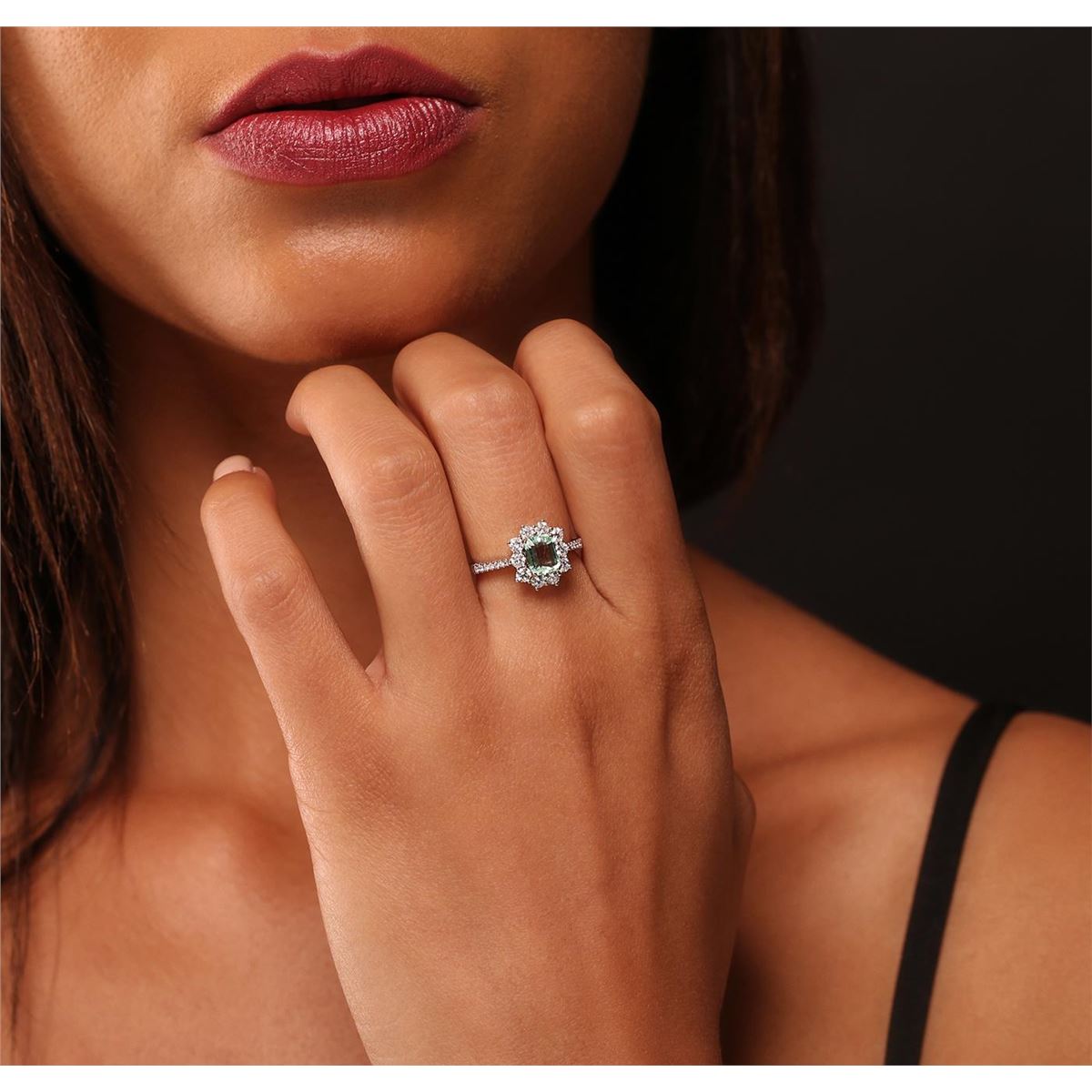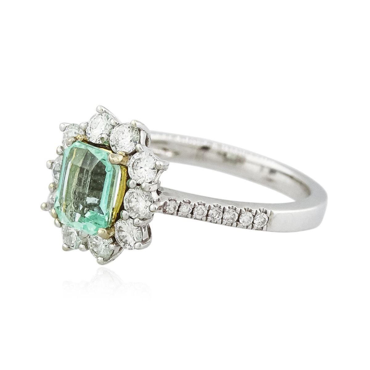 One electronically tested 14KT white and yellow gold Ladies combination cast & assembled ring with a bright polish finish. Condition is new. Identified with markings of "14K". Containing: Fourteen prong set round brilliant cut diamonds, measuring 1.20 - 1.20 x 0.72mm (depth est.) approximate. Total Weight of 14 Stones = 0.09ct. Clarity: I-1 to I-2. Color: H - I, Cut is Good. Ten prong set round brilliant cut diamonds, measuring 2.50 - 2.50 x 1.50mm (depth est.) approximate. Total Weight of 10 Stones = 0.57ct. Clarity: I-1 to I-2. Color: I - J, Cut is Good. One prong set emerald modified step cut natural emerald, measuring 6.70 x 5.30 x 3.30mm, exact weight 0.92ct., clarity is eye clean, type III, light, very slightly grayish, very strongly bluish green color, (GIA vstbG 3/3), cut is very good. Colored gemstones are presumed to have been subjected to commonly used and possible undetectable color/clarity enhancement processes. Total Weight of Colored Stones 0.92ct. Total Weight of Diamonds 0.66ct. Total Weight of Ring 3.50 grams. GGL Appraised at $4,940.00.