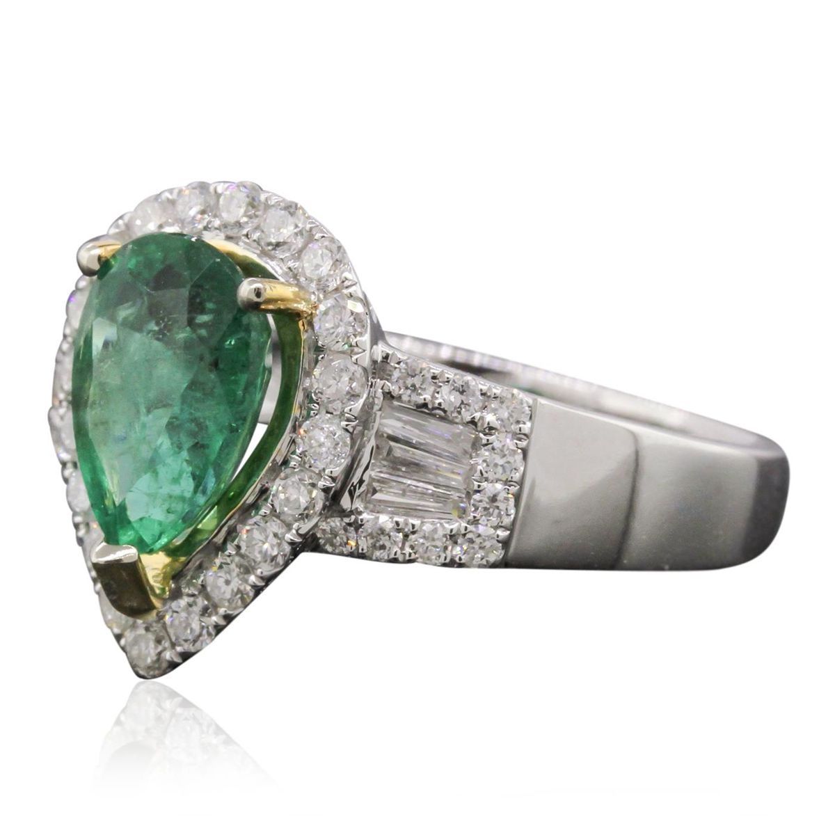 One electronically tested 14KT white and yellow gold Ladies combination cast & assembled fashion ring with a bright polish finish. Condition is new. Identified with markings of "14K". Containing: One prong set pear modified mixed cut natural emerald, measuring 9.20 x 6.60 x 4.30mm, approximate weight of 1.60ct., clarity is moderately included, type III, medium, moderately strong, very slightly bluish green color, (GIA vslbG 5/4), cut is good. Colored gemstones are presumed to have been subjected to commonly used and possible undetectable color/clarity enhancement processes. Twenty prong set round brilliant cut diamonds, measuring 1.50 - 1.50 x 0.90mm (depth est.) approximate. Total Weight of 20 Stones = 0.25ct. Clarity: I-1. Color: I - J, Cut is Good. Eighteen round brilliant cut diamonds, measuring 1.00 - 1.00 x 0.60mm (depth est.) approximate. Total Weight of 18 Stones = 0.07ct. Clarity: I-1. Color: I - J. Six channel set baguette cut diamonds, measuring 3.00 x 1.00 x 0.85mm (depth est.) approximate. Total Weight of 6 Stones = 0.39ct. Clarity: VS-2 to SI-2. Color: I - J, Cut is Good. Total Weight of Colored Stones 1.60ct. Total Weight of Diamonds 0.70ct. Total Weight of Ring 4.60 grams. GGL Appraised at $7,080.00.