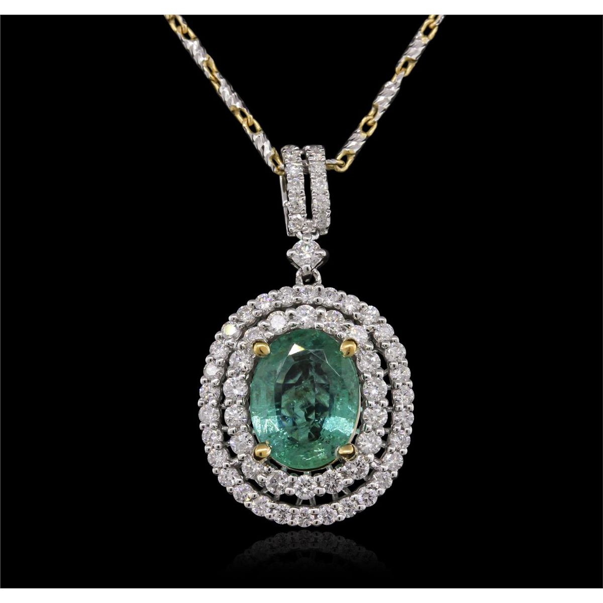 One electronically tested 14KT white and yellow gold Ladies combination cast & assembled pendant & chain 17.5" long, light open cable link with a lobster claw clasp with a bright polish finish. Condition is new. Identified with markings of "14K". Containing: One prong set oval modified mixed cut natural emerald, measuring 9.60 x 7.50 x 3.90mm, exact weight 1.81ct., clarity is moderately included, type III, medium light, very slightly grayish, bluish green color, (GIA bG 4/3), cut is good. Colored gemstones are presumed to have been subjected to commonly used and possible undetectable color/clarity enhancement processes. Forty-Three prong set round brilliant cut diamonds, measuring 1.30 - 1.30 x 0.78mm (depth est.) approximate. Total Weight of 43 Stones = 0.34ct. Clarity: SI-2 to I-1. Color: I - J, Cut is Good. One prong set round brilliant cut diamond, measuring 2.00 - 2.00 x 1.20mm (depth est.) approximate weight of 0.03ct. Clarity: SI-1. Color: I, Cut is Good. Eighteen prong set round brilliant cut diamonds, measuring 1.50 - 1.50 x 0.90mm (depth est.) approximate. Total Weight of 18 Stones = 0.50ct. Clarity: SI-1 to SI-2. Color: H, Cut is Good. Total Weight of Colored Stones 1.81ct. Total Weight of Diamonds 0.87ct. Total Weight of Pendant & Chain 7.00 grams. GGL Appraised at $9,245.00.